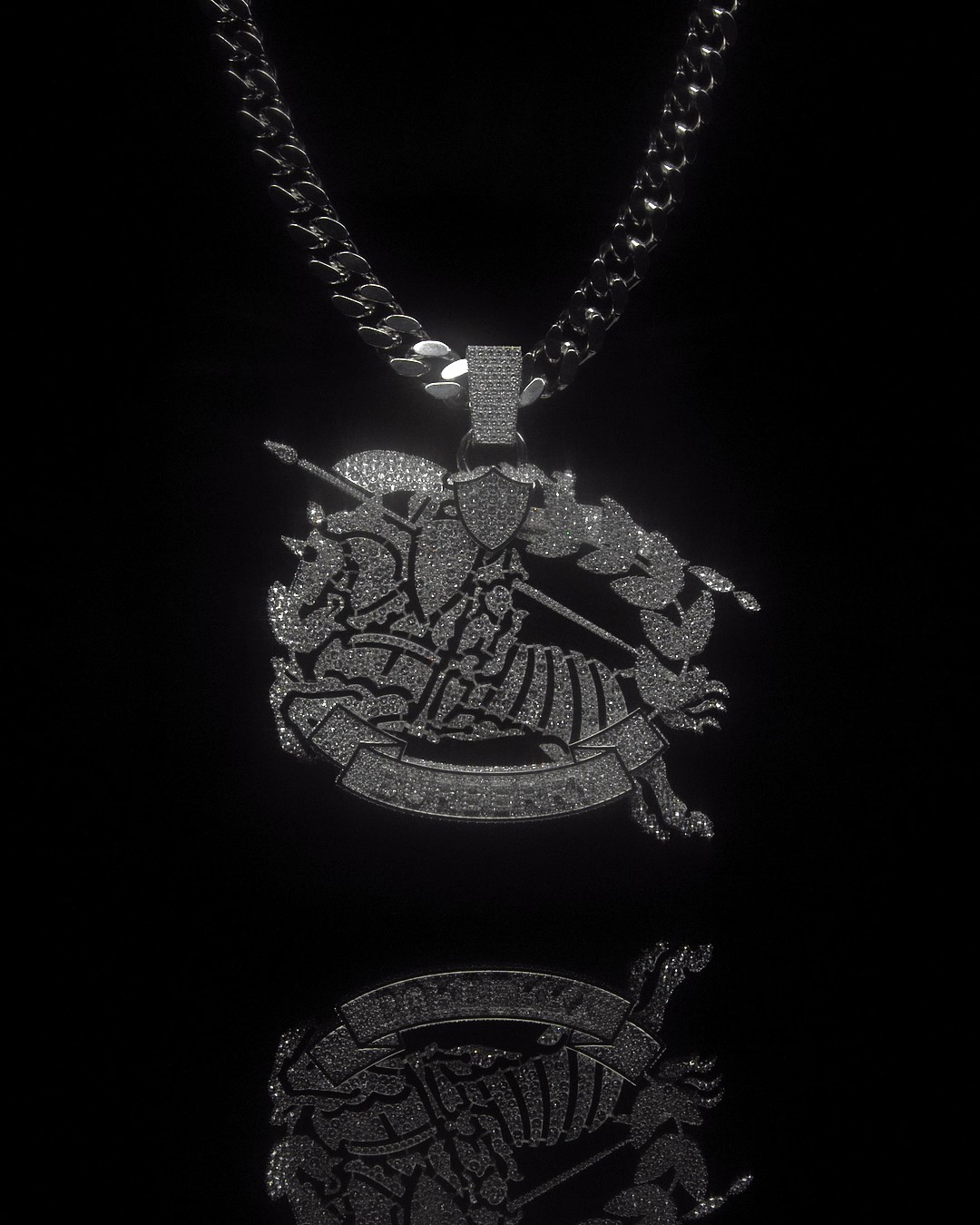 Jewellery includes palladium-plated pieces detailed with house codes and hand-applied crystal embellishments from an EKD chain-link necklace to a Thomas Burberry Monogram ring. For men, an engraved EKD palladium-plated signet ring and cufflinks. The signature Thomas Bear charm is updated in a trench gown, crafted in topstitched leather