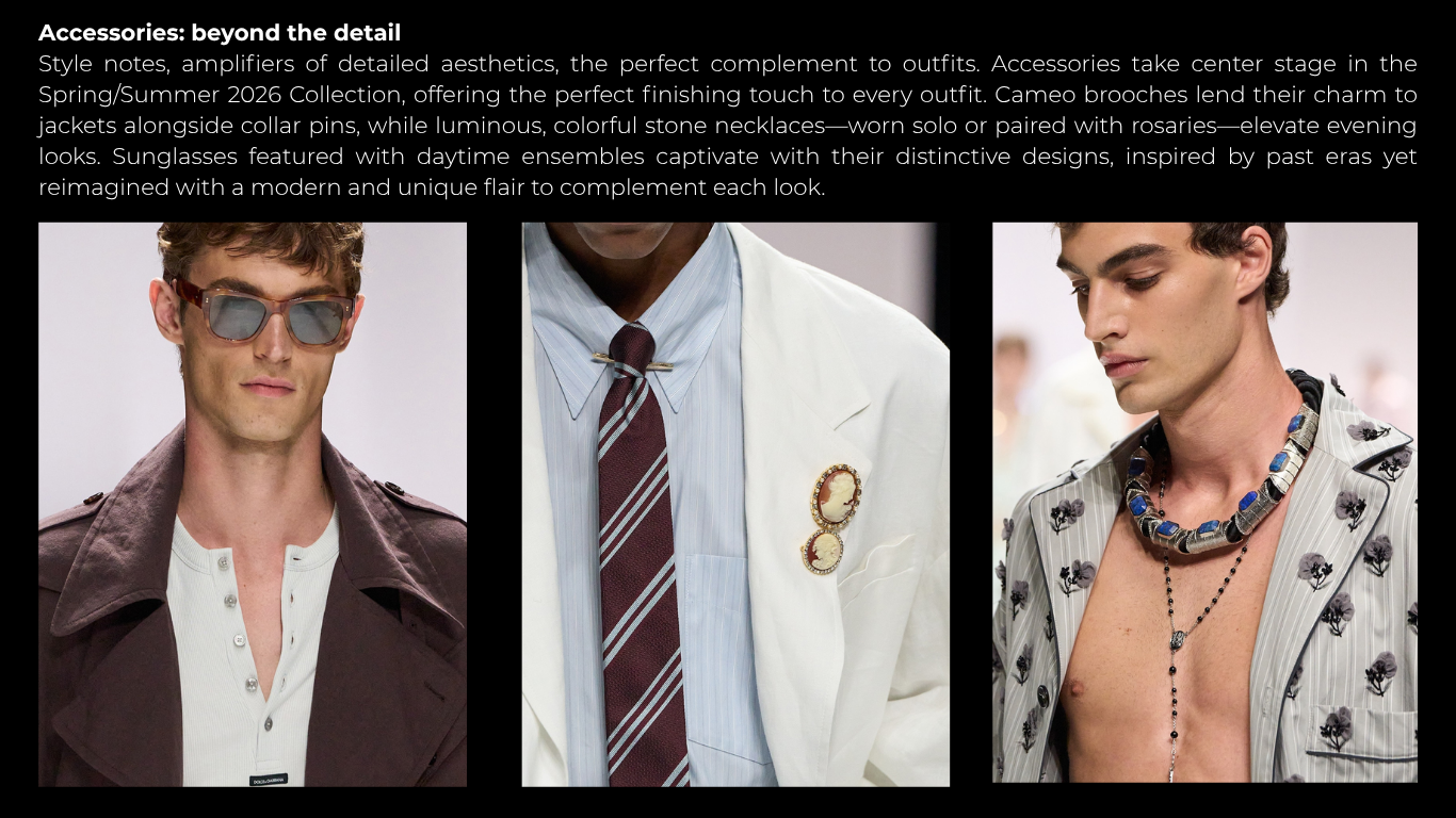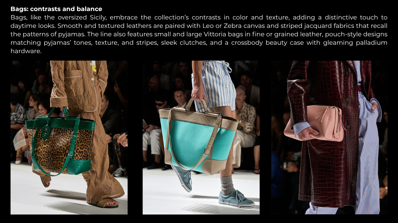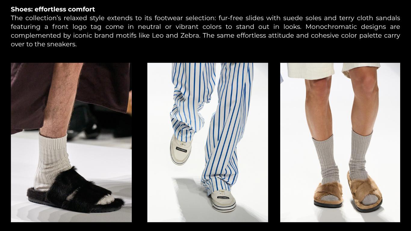 From beige to sky blue, cream to navy—often on a white base—and from green tobrown to timeless black, the color palette isrefined, balancing neutral tones with strikingcontrasts. Vibrant boxer trims andaccessories enhance the outfits, adding abold yet cohesive touch. Monochromatictotal looks are presented in neutral tones orin the signature Leo print.
