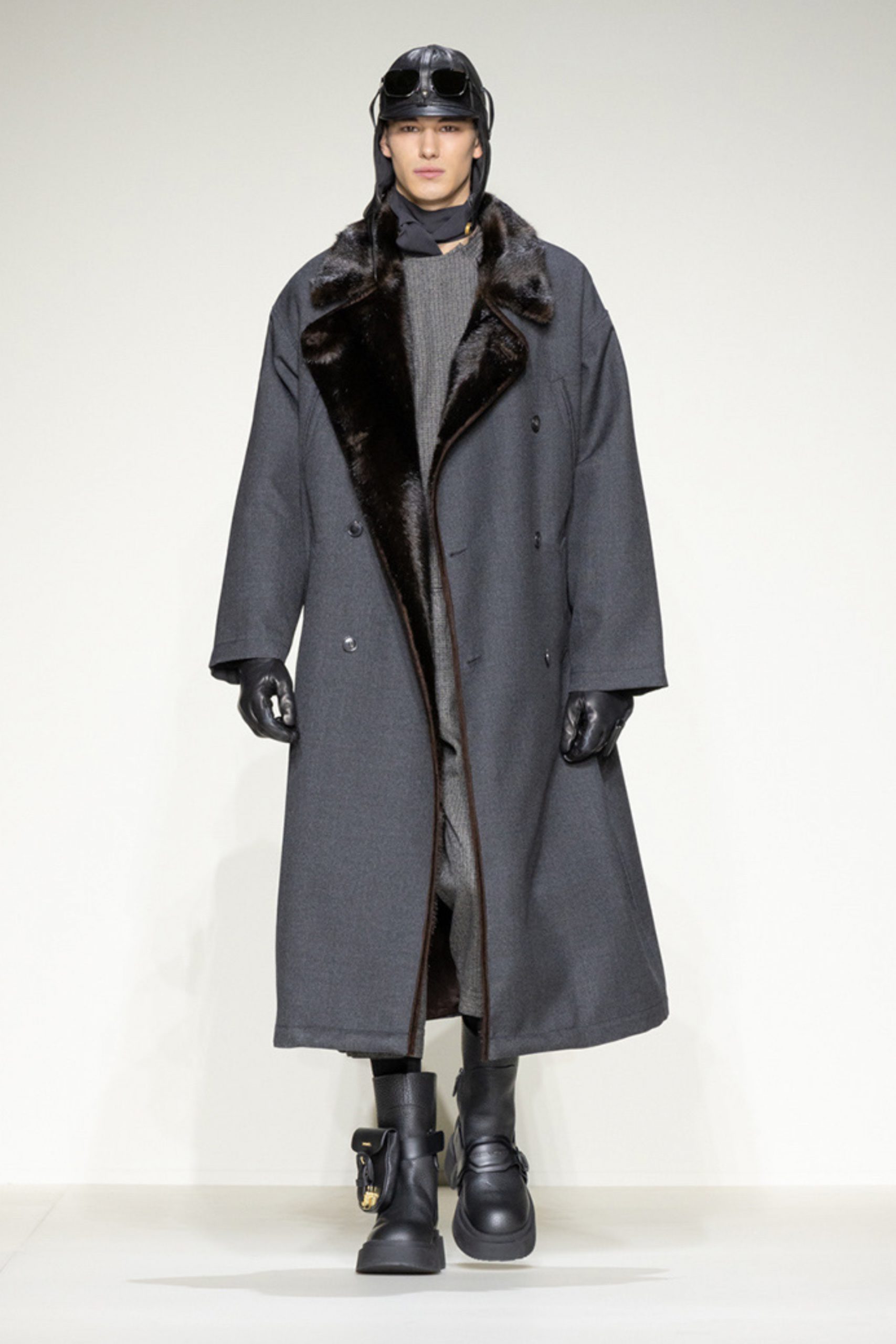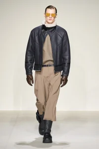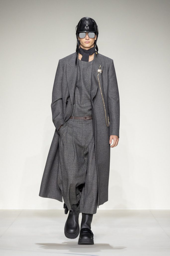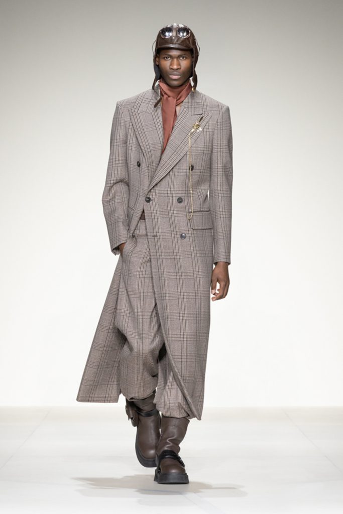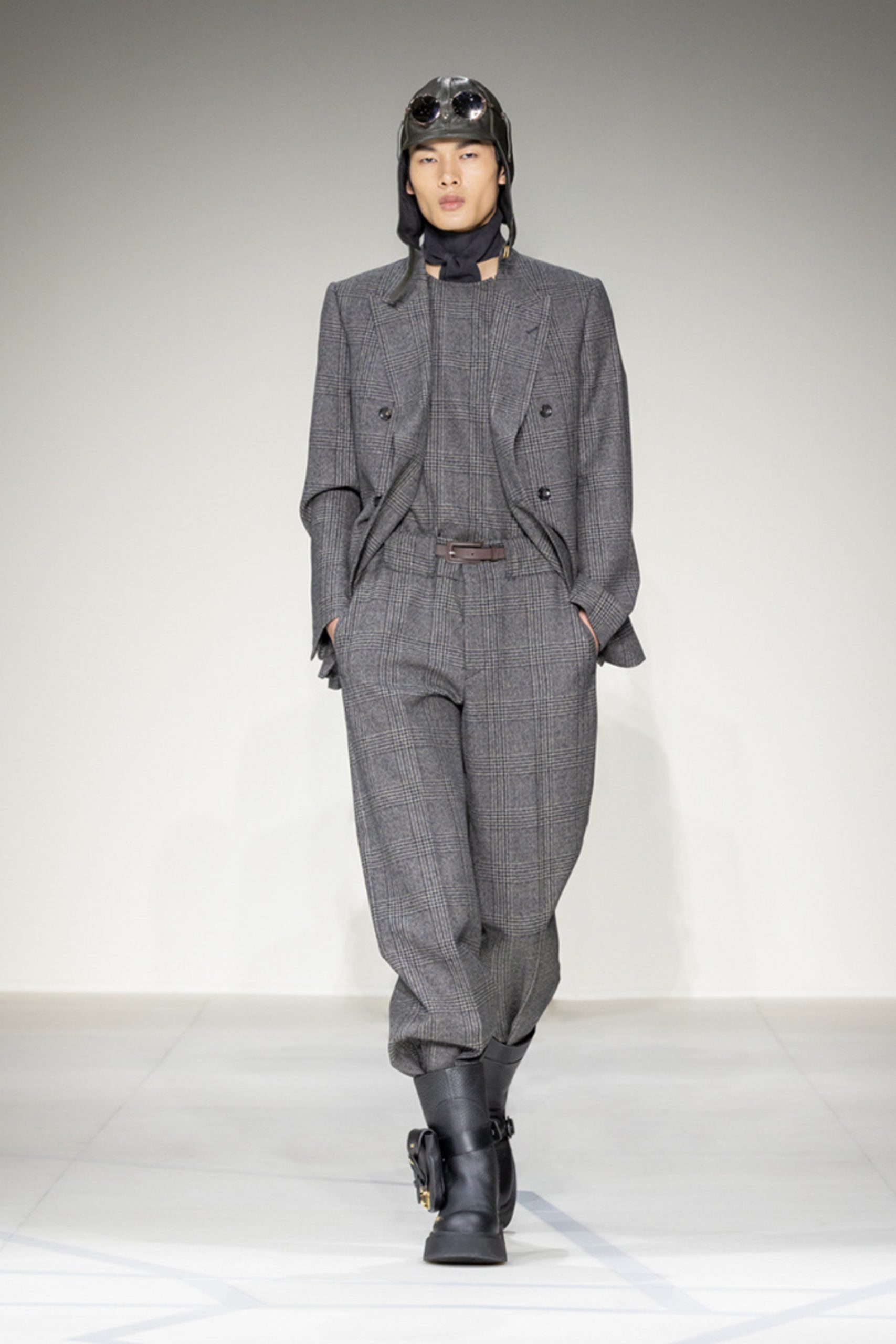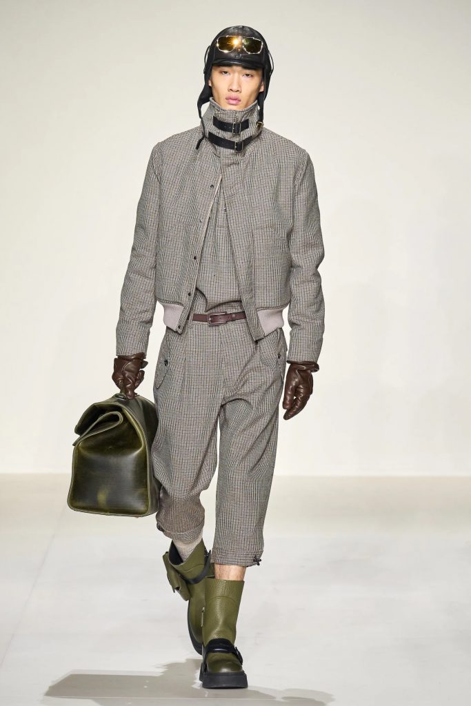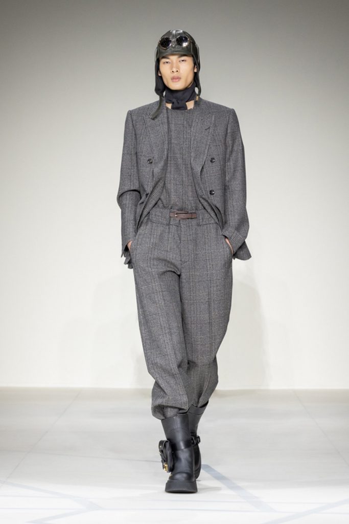 The idea of a human in flight reinvents a figure that has always been central to the Armani imagination, dressing him in sport-inspired clothes made from soft, high-impact materials, with enveloping volumes and designs that expand and dilate the classic Prince of Wales and Houndstooth checks.