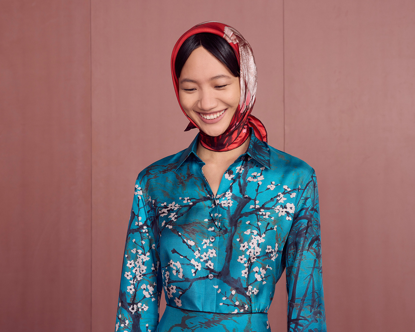 The serene rabbit appears in an enchanting print with peach trees and bamboo leaves. His giant eyes are rendered in high impact graphics placed on bags and card holders. Rich shades of red, blue and white enliven the dreamy decorative landscapes contrasted by the monochrome pieces in Ferragamo red, such as the leather sneakers with perforated motifs and the fluid blouse over the pleated skirt.