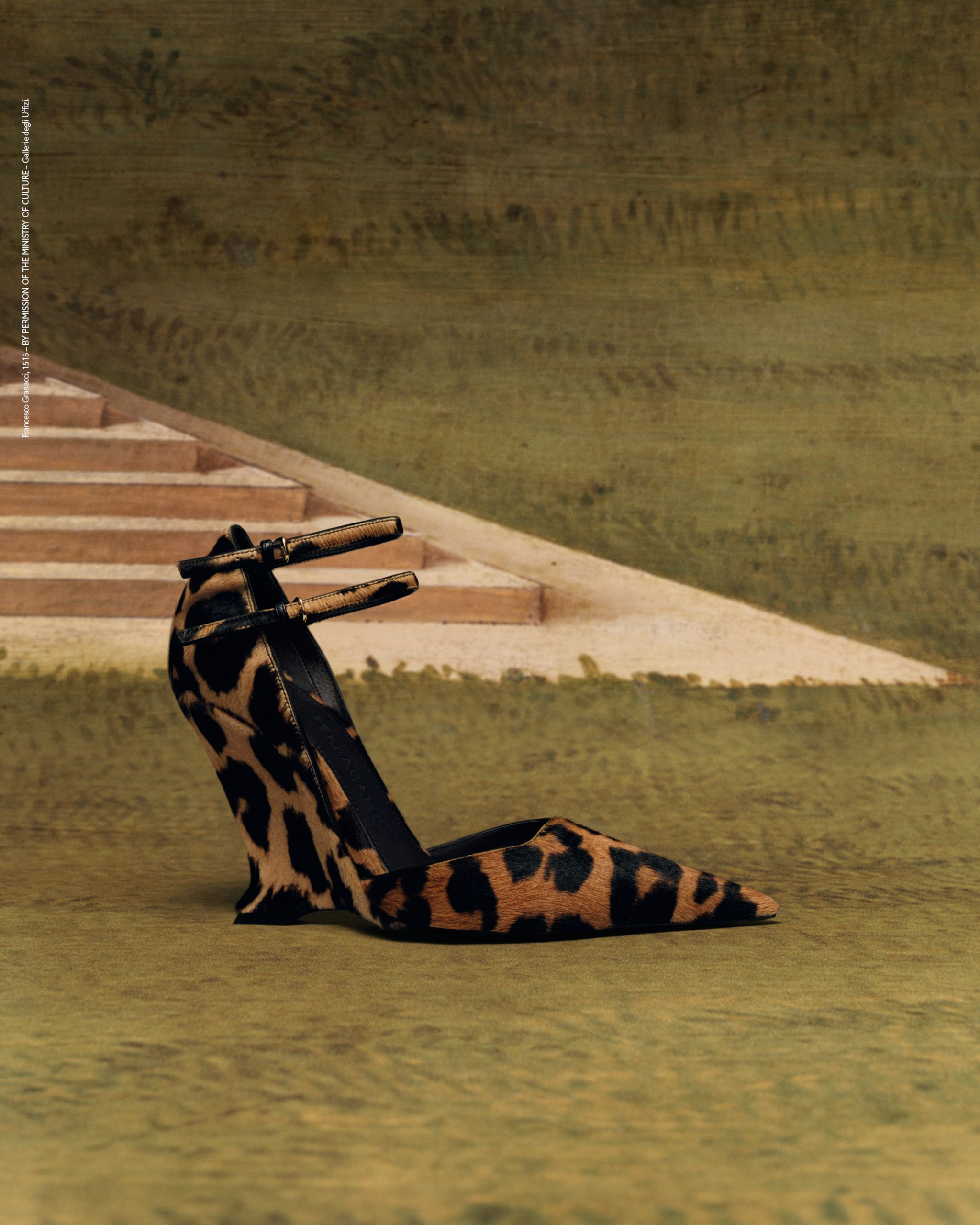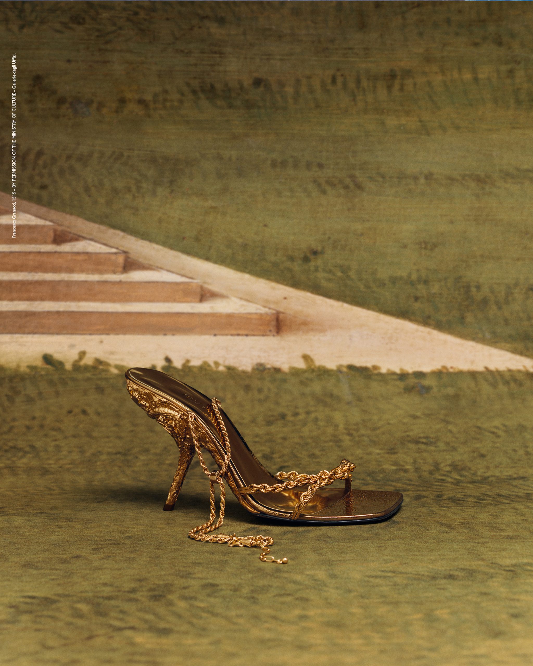 Today Ferragamo is experiencing a contemporary Renaissance and partners with the Uffizi to showcase Creative Director Maximilian Davis ‘collection of sensual, elegant an sophisticated ready-to-wear, shoes and bags for Autumn/Winter 2023, using some of the most famous artworks of the 15th and 16th centuries to act as settings for his work. By placing the sharp tailoring and exquisite suiting, the richly textured fabrics and the bold materials and colours, the Hug bag and the archive inspired gold sandal in the context of works by Bellini, Veronese and Botticelli, Davis has created a dialogue between past and present, where both the spirit of the Renaissance and the world of 21st-century luxury are thrown into different relief by juxtaposition.
