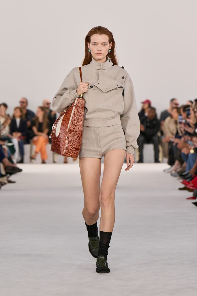 Within the collection, that sentiment is clearly apparent within footwear: nappa latex shoes and gaucho lak boots draw on Davis’ aesthetic proclivities while using the craftsmanship of Ferragamo’s footwear ateliers to ensure comfort and wearability. A 1955 archival style, the Calypso, informs the design of a banana cage heel, now 3D printed and galvanized. “I wanted to find the codes that we explored in previous collections and reiterate them,” says Davis – and the familiar curvilinear heel of a platform now appears in horn as the foundation for a high-shine sandal, and a T-strap strung with natural beads and stones. For men, Ferragamo’s heritage is revived with a contemporary vocabulary: Oxfords, moccasins and driver shoes are deconstructed, or inset with contrasting vitello latex for a new twist on the classics.
