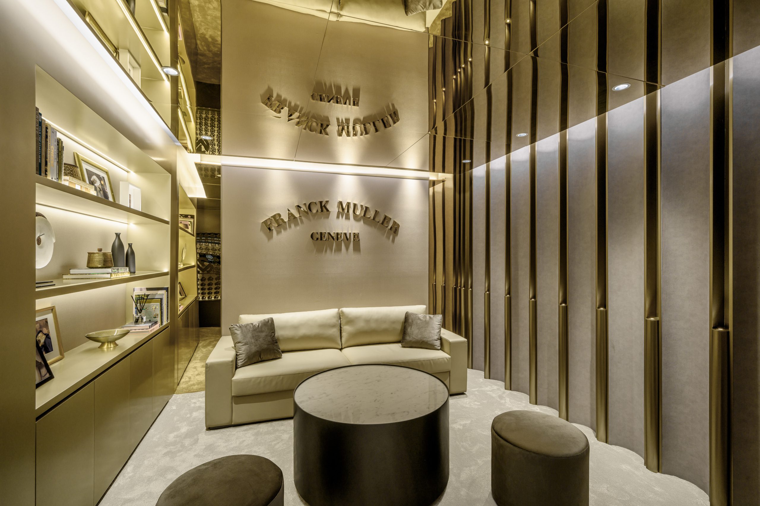 The colour palette is shades of taupe, selected to evoke the travertine stone commonly found on buildings across Europe, where Franck Muller was established. It forms a blank canvas so as not to distract from the timepieces on display. Accents of a classic navy blue are visible – such as on parts of the wall in the main store.