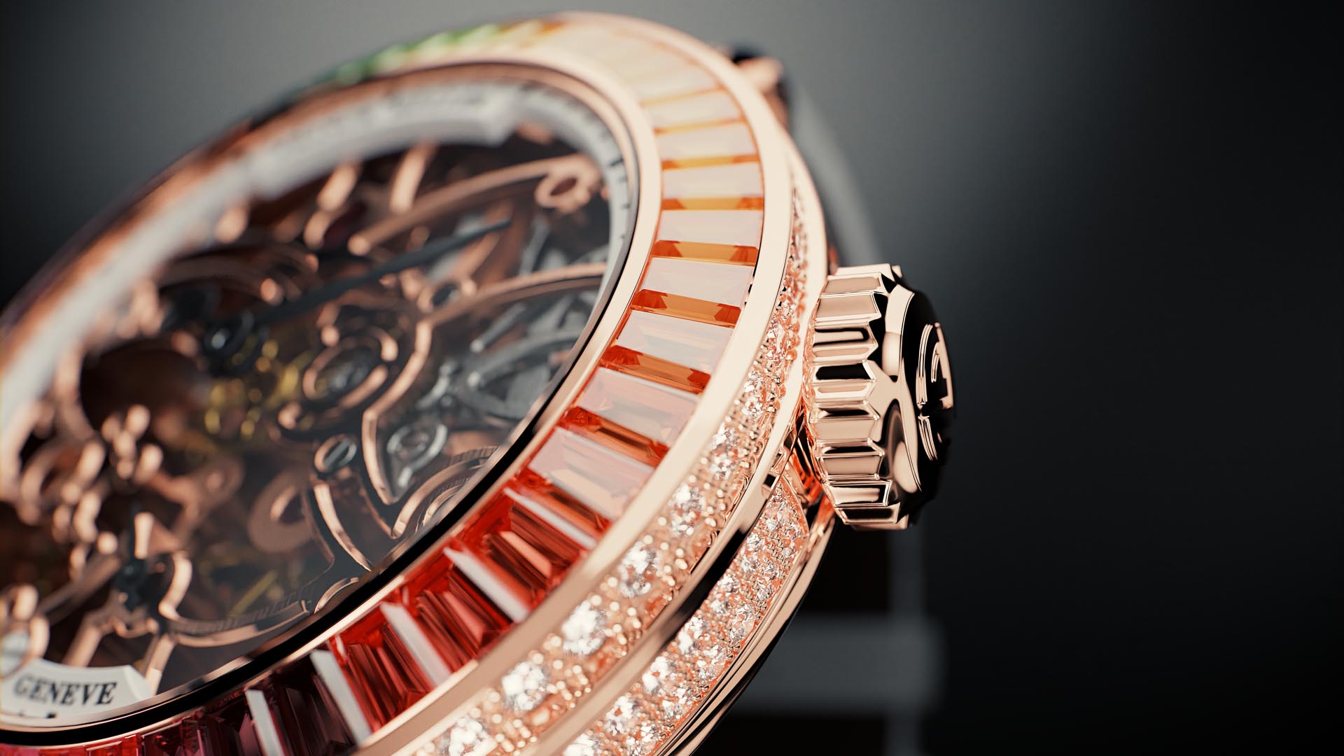 Baguette-cut diamonds or precious stones are meticulously set by hand using the channel setting technique featuring gem stones set inside the bezel, securely held in place within the ring. Crafted in precious metals, the bezel’s channel walls hold in place this majestic crown that encircles the precisely skeletonised dial, enhancing its optimal transparency.
