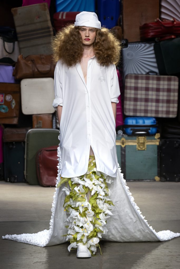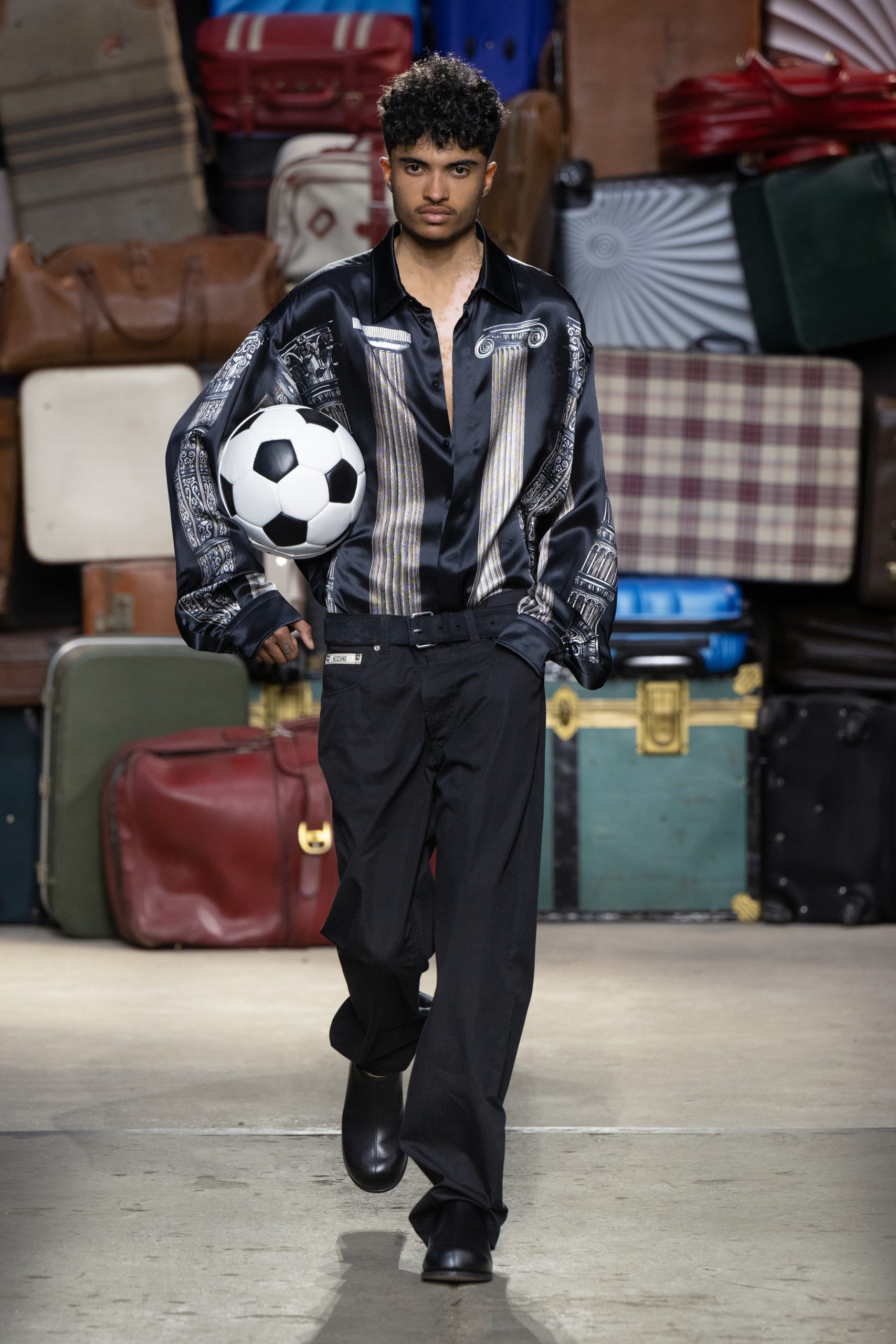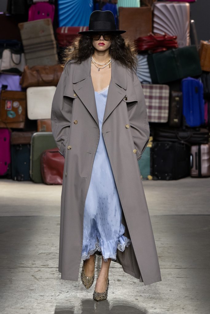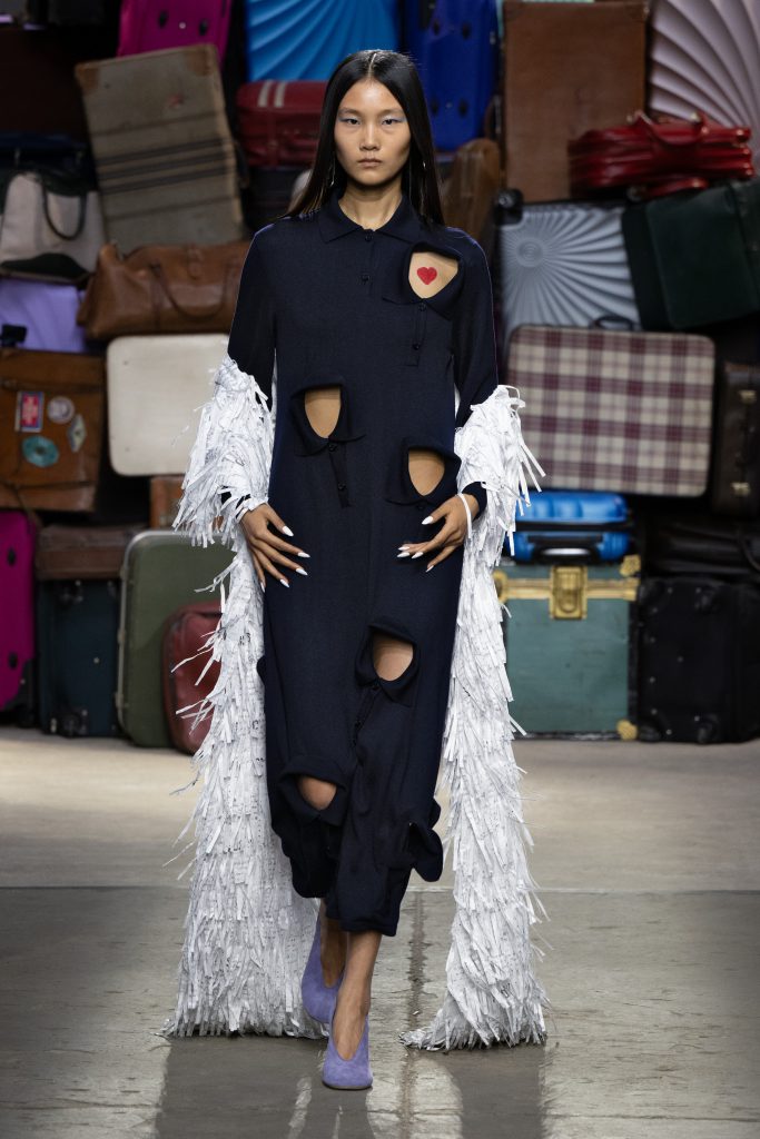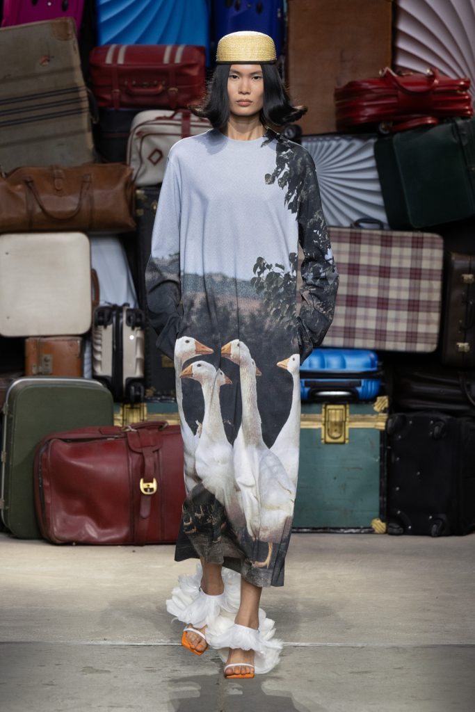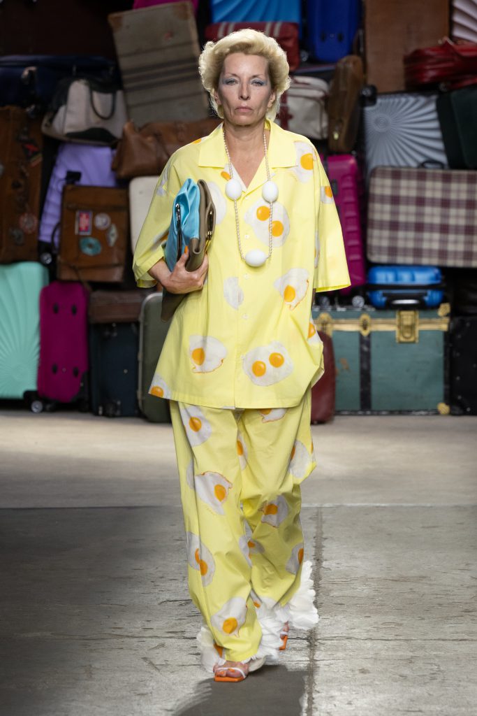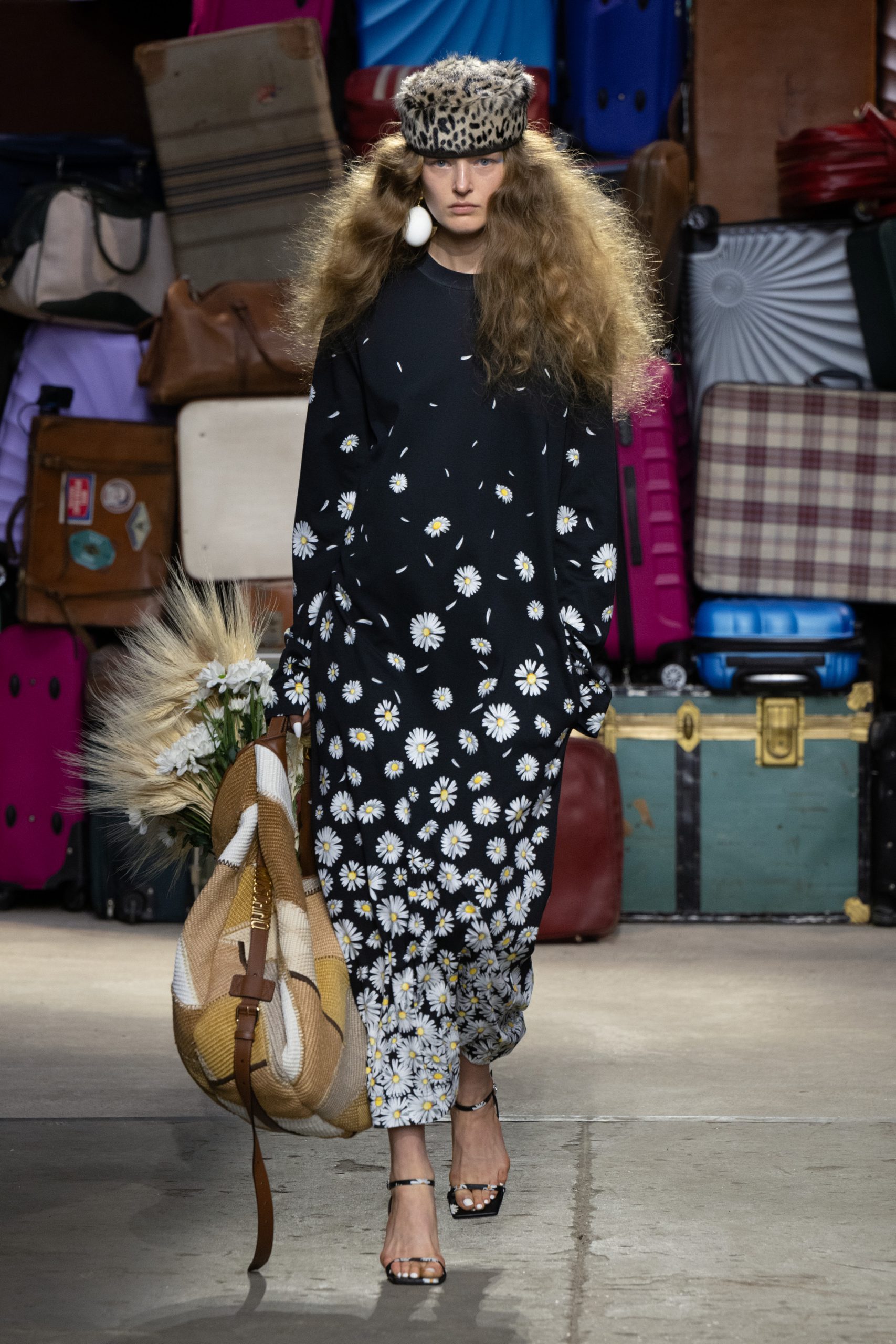 Moschino archival gestures, glimpses and memories – a continual exchange with the ethos of Franco. 1990s prints – peace flowers, footballs, ironic pizza smears, Made in Italy, always, some reinterpreted, reworked and loved again. Twisted trench-coats, lingerie dressing, ‘assemblages’ of other garments to create anew.