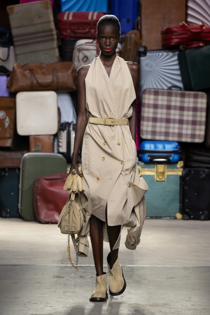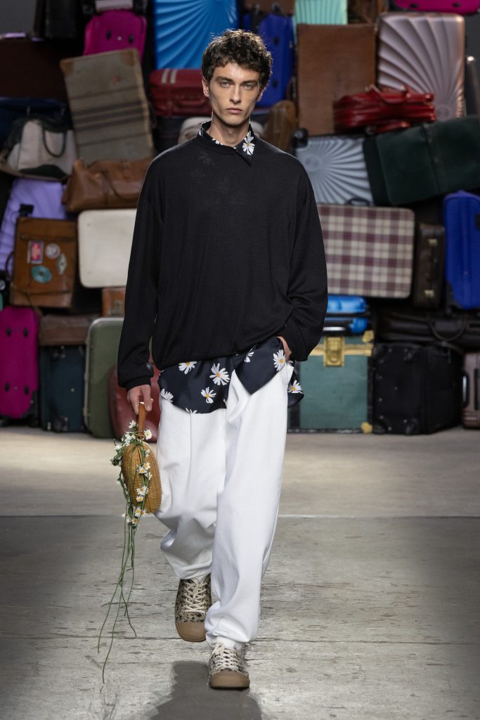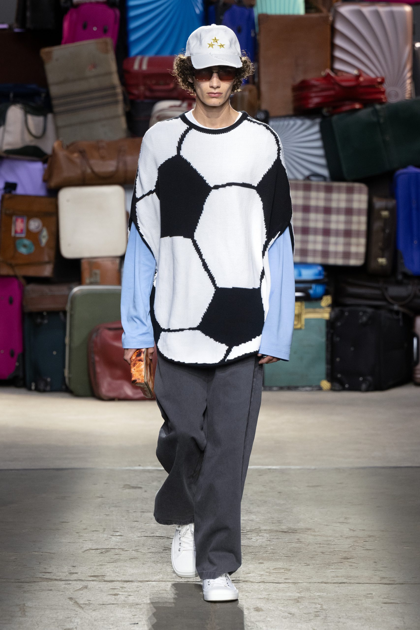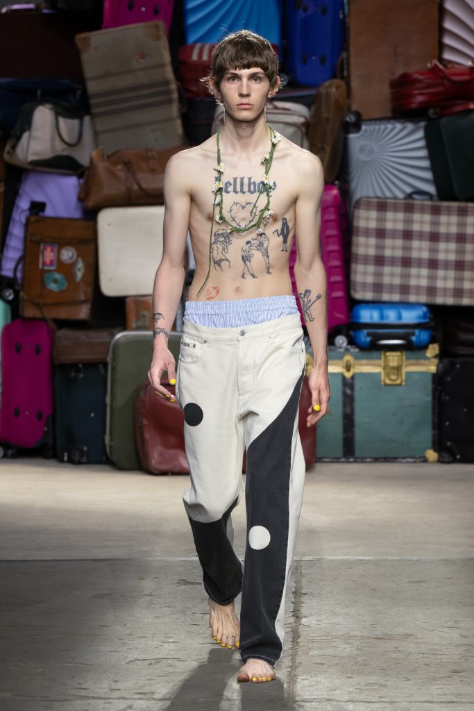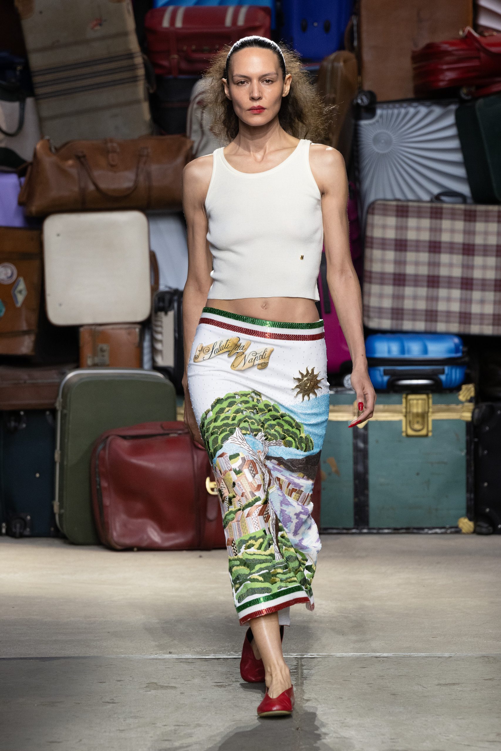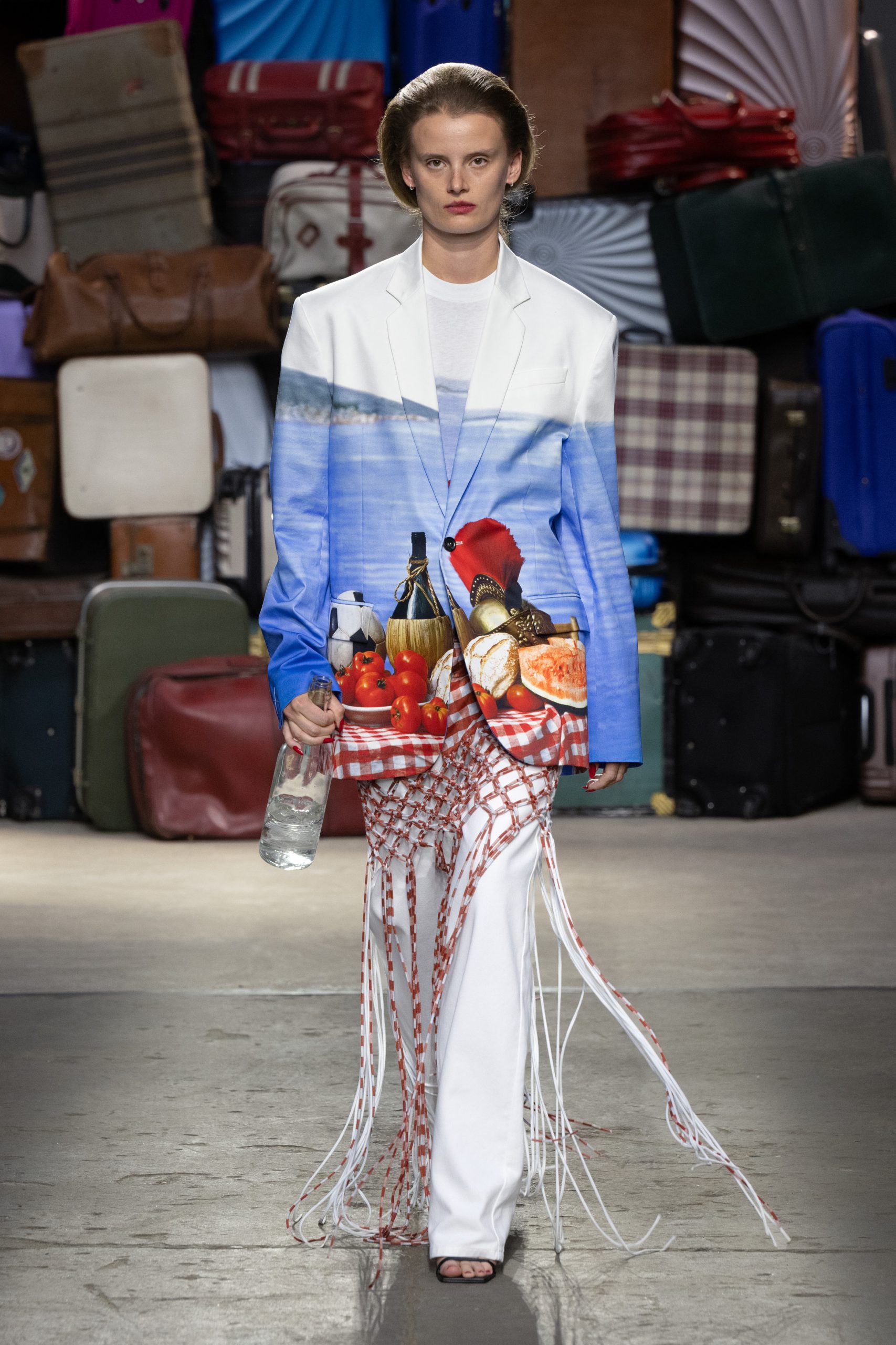 Moschino archival gestures, glimpses and memories – a continual exchange with the ethos of Franco. 1990s prints – peace flowers, footballs, ironic pizza smears, Made in Italy, always, some reinterpreted, reworked and loved again. Twisted trench-coats, lingerie dressing, ‘assemblages’ of other garments to create anew.