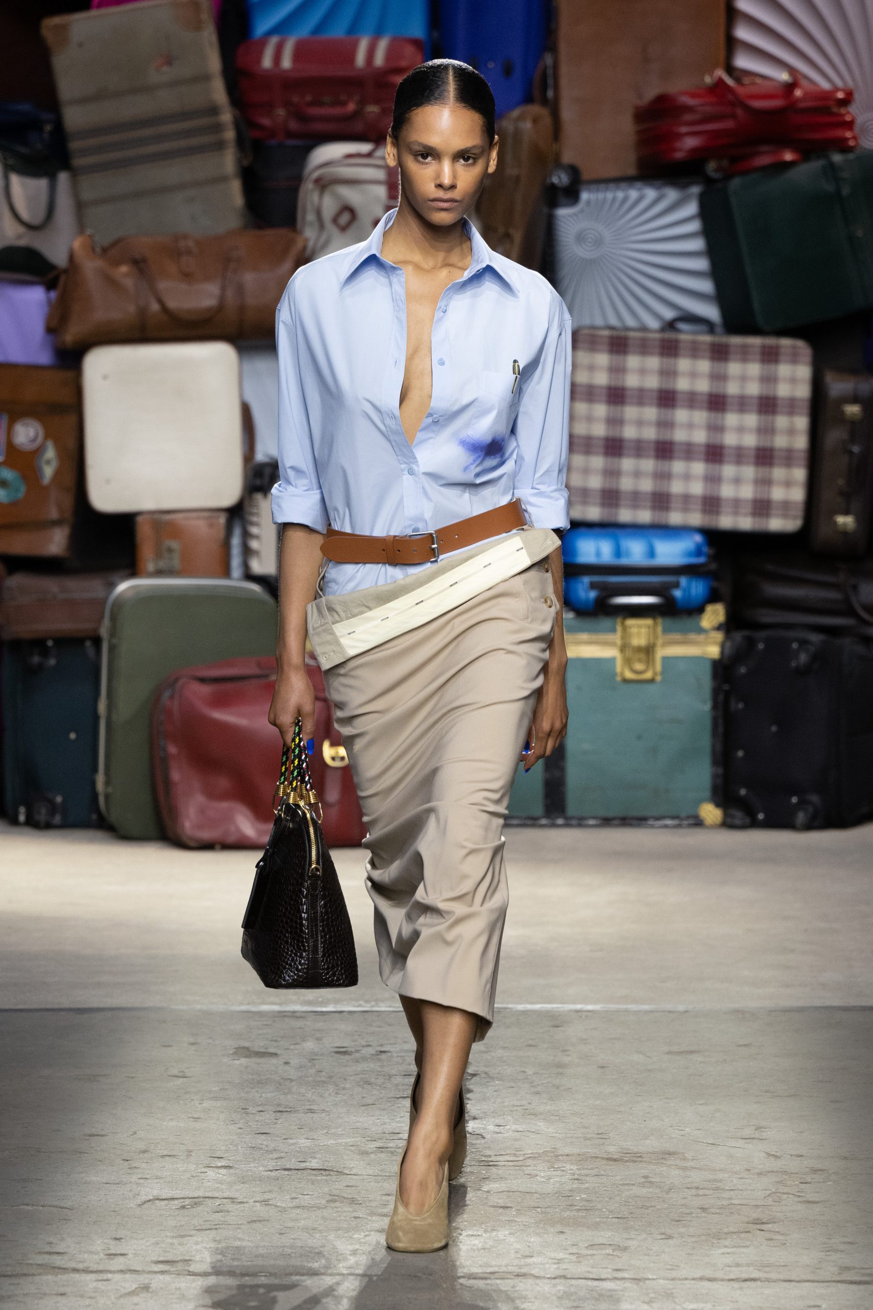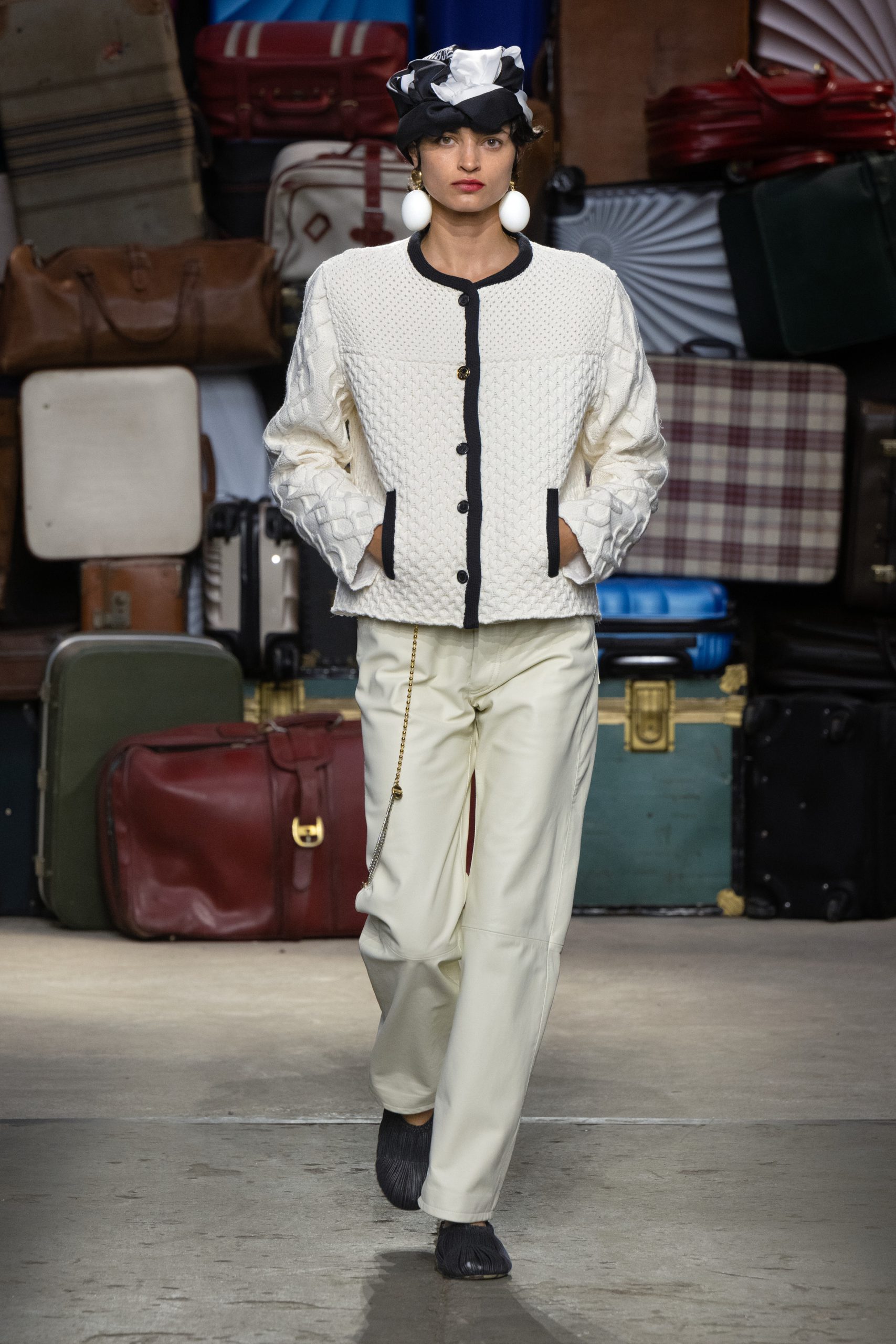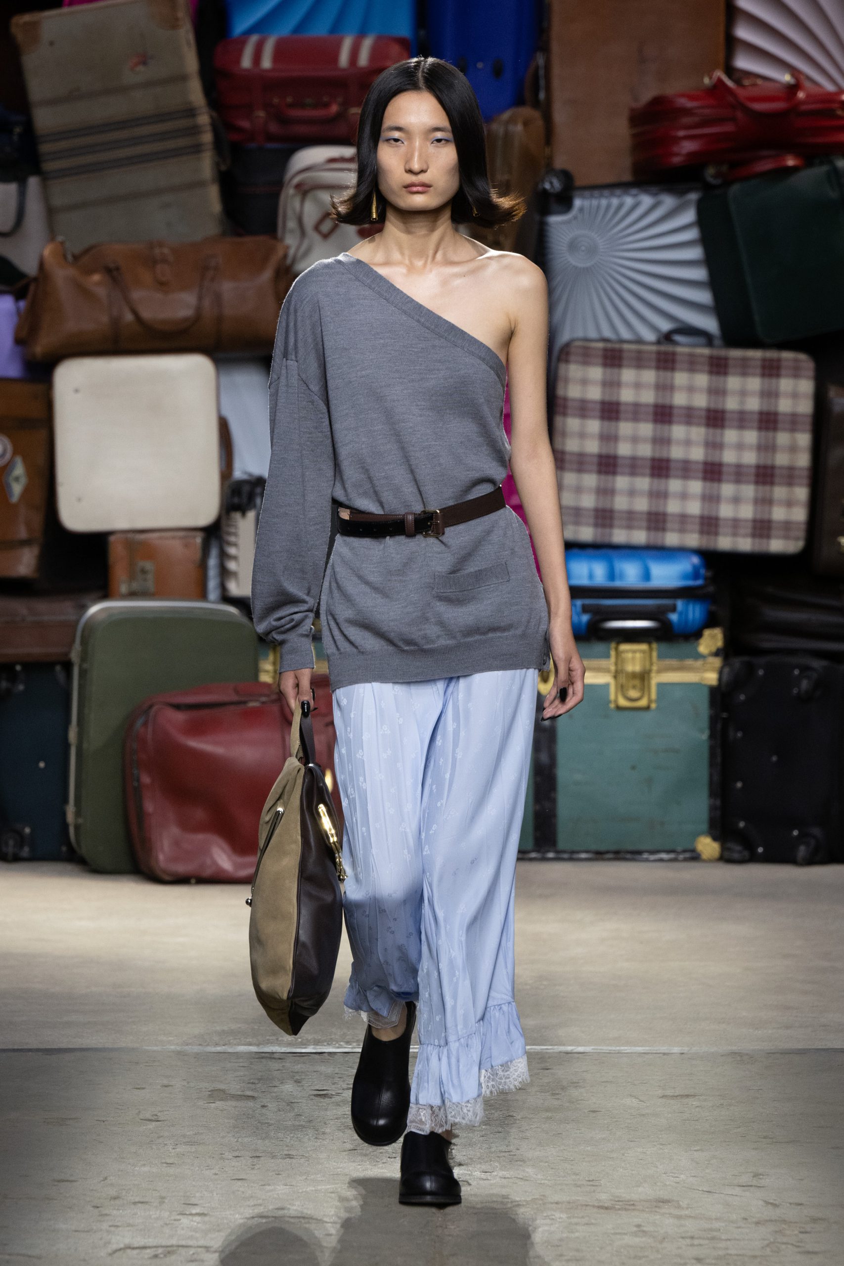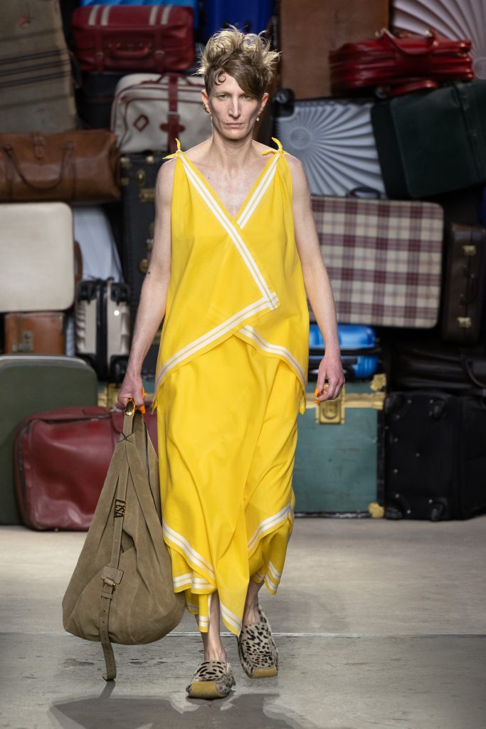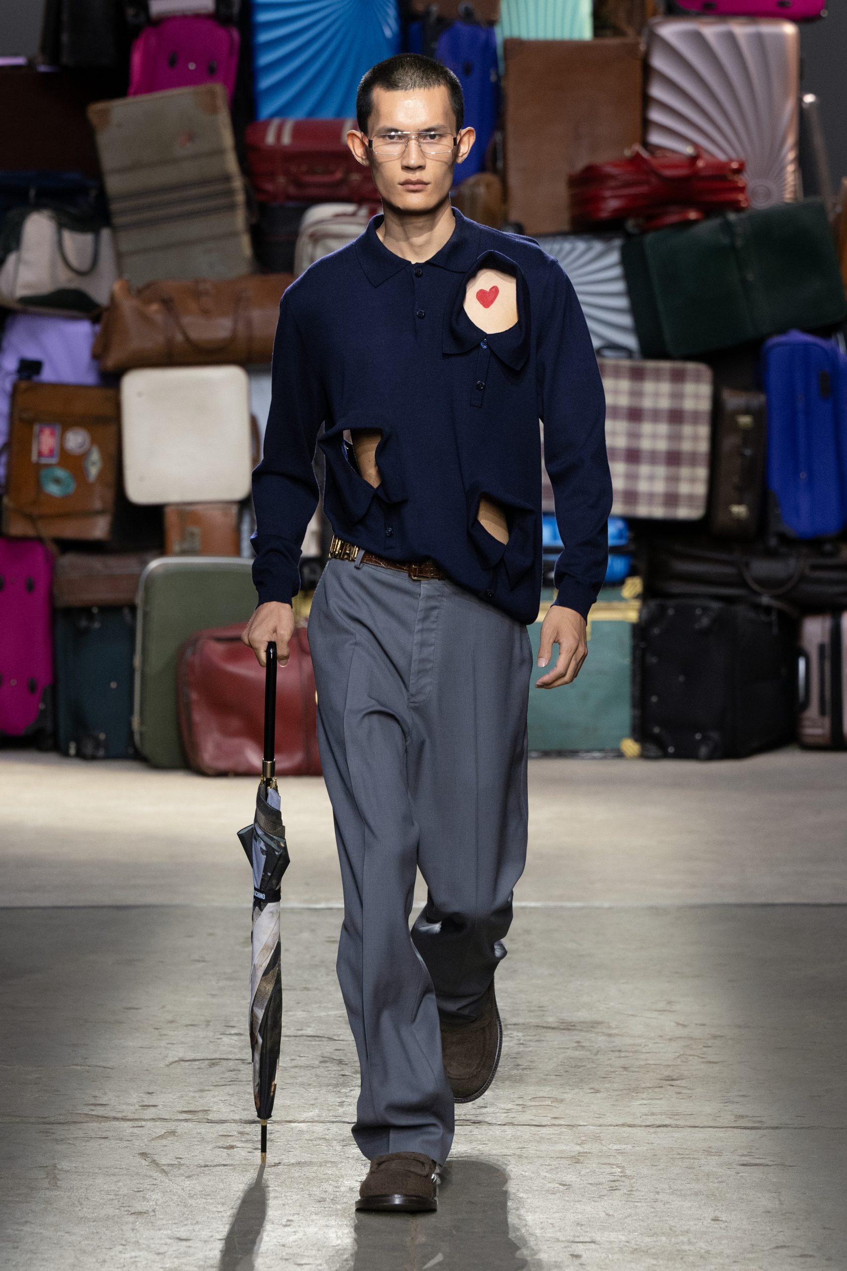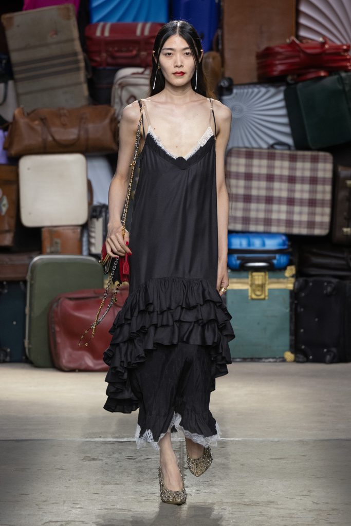 Moschino archival gestures, glimpses and memories – a continual exchange with the ethos of Franco. 1990s prints – peace flowers, footballs, ironic pizza smears, Made in Italy, always, some reinterpreted, reworked and loved again. Twisted trench-coats, lingerie dressing, ‘assemblages’ of other garments to create anew.