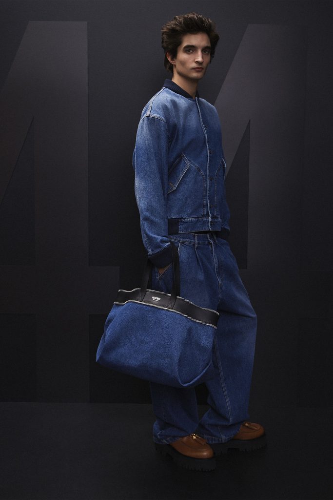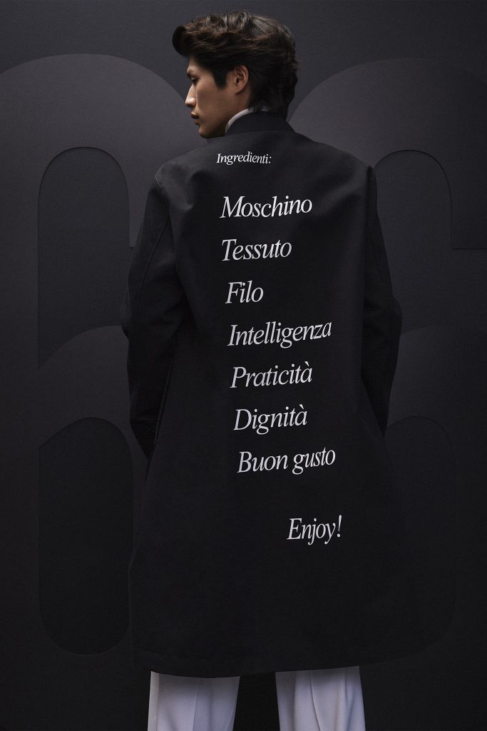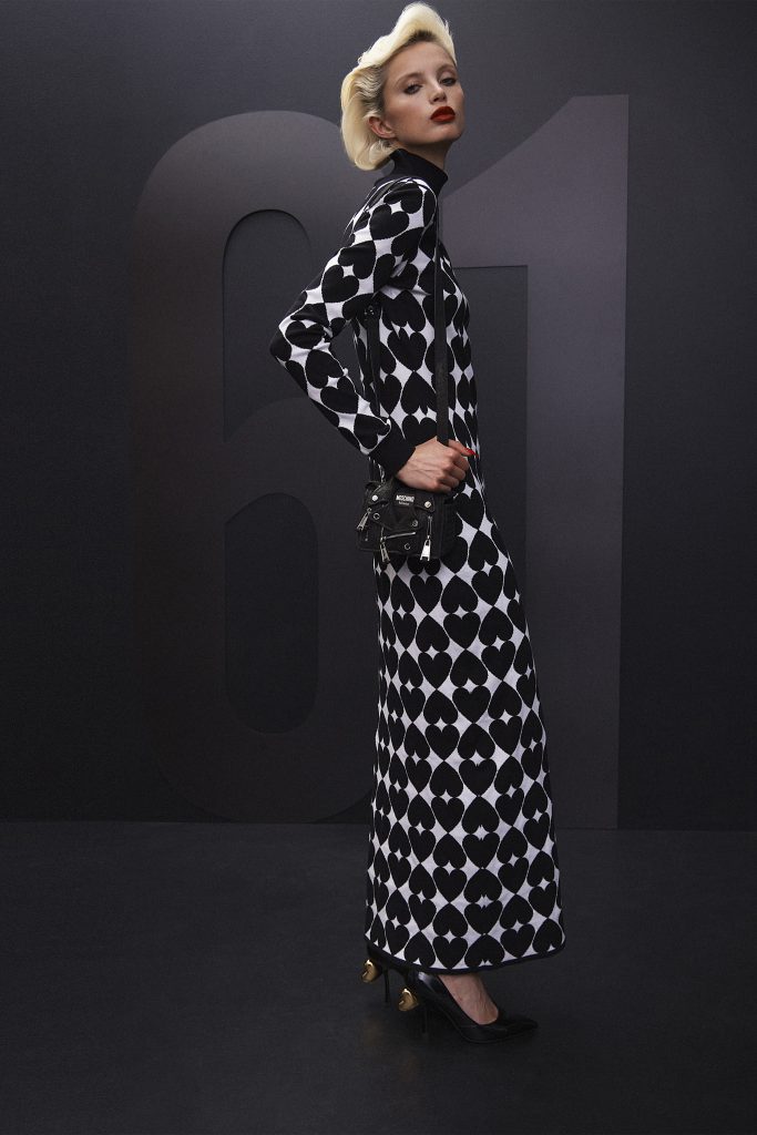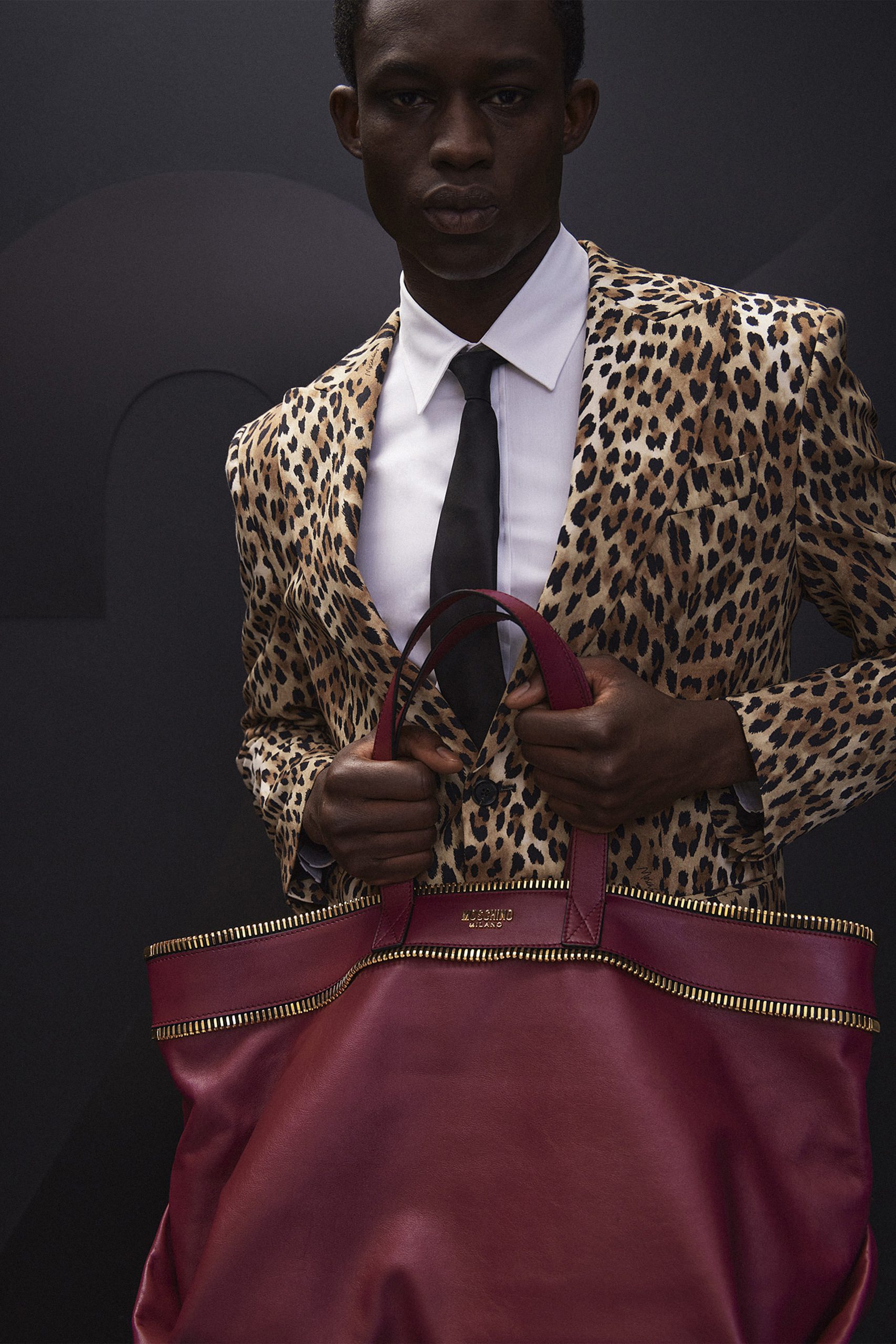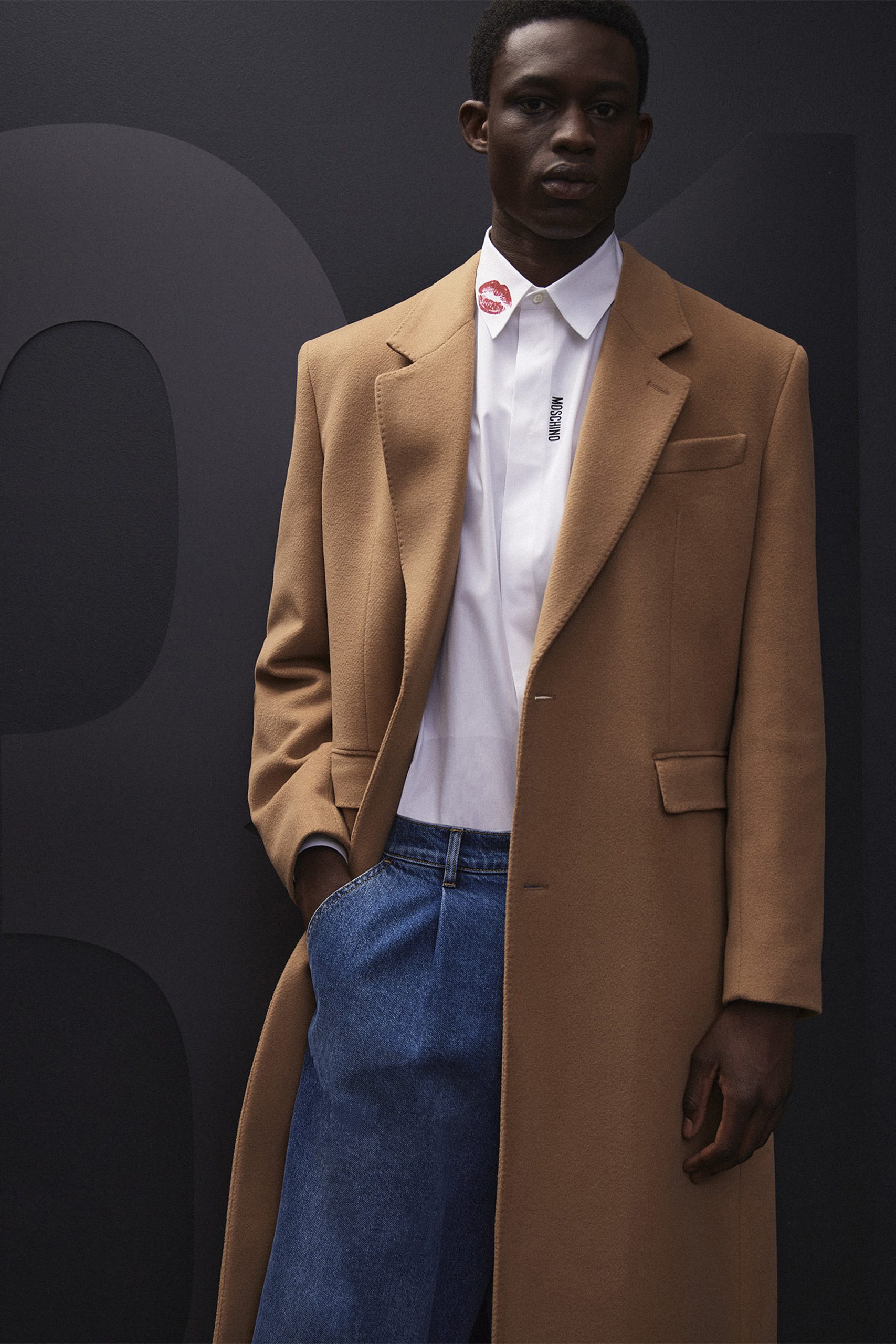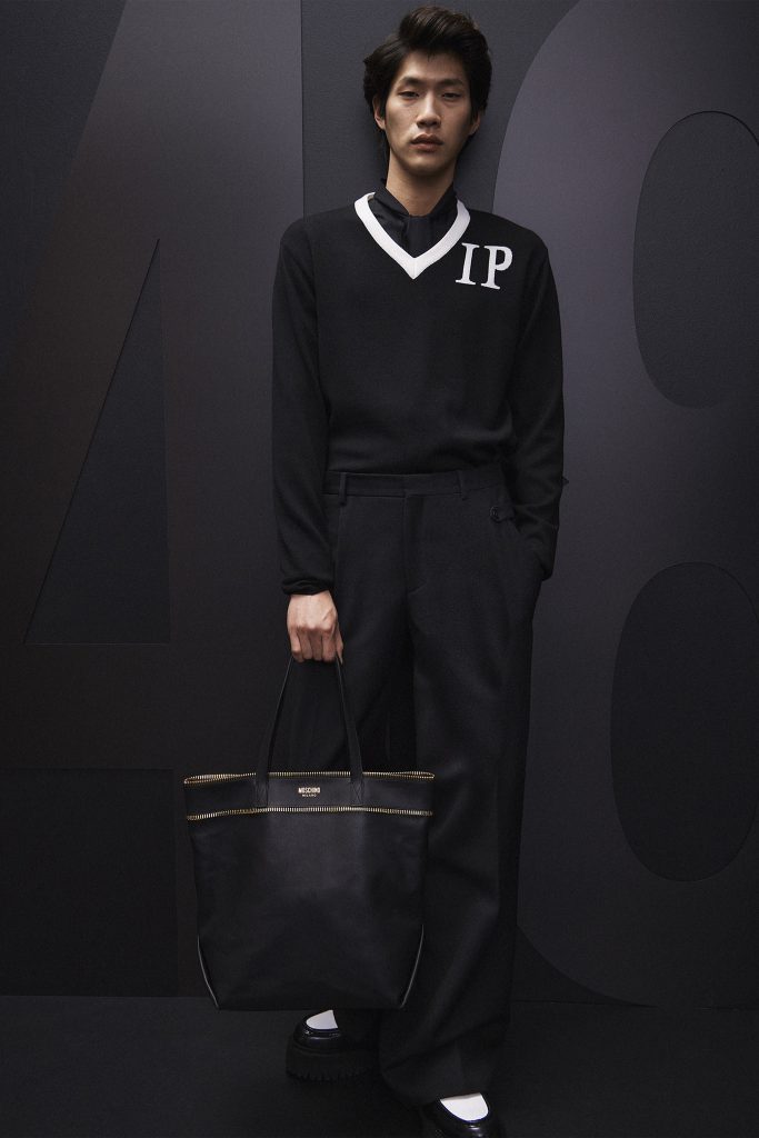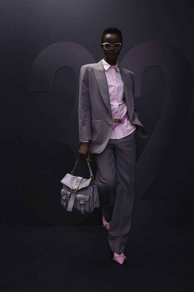 The recurring offbeat touches become anchoring playful tools to deceive the eyes. Ties are cropped and slightly oversize, knit cummerbunds become belly warmers, the perfecto biker jacket turns into a briefcase, the tiny embroidered hearts, a house signature, migrate from shirts to the iconic Moschino belt.