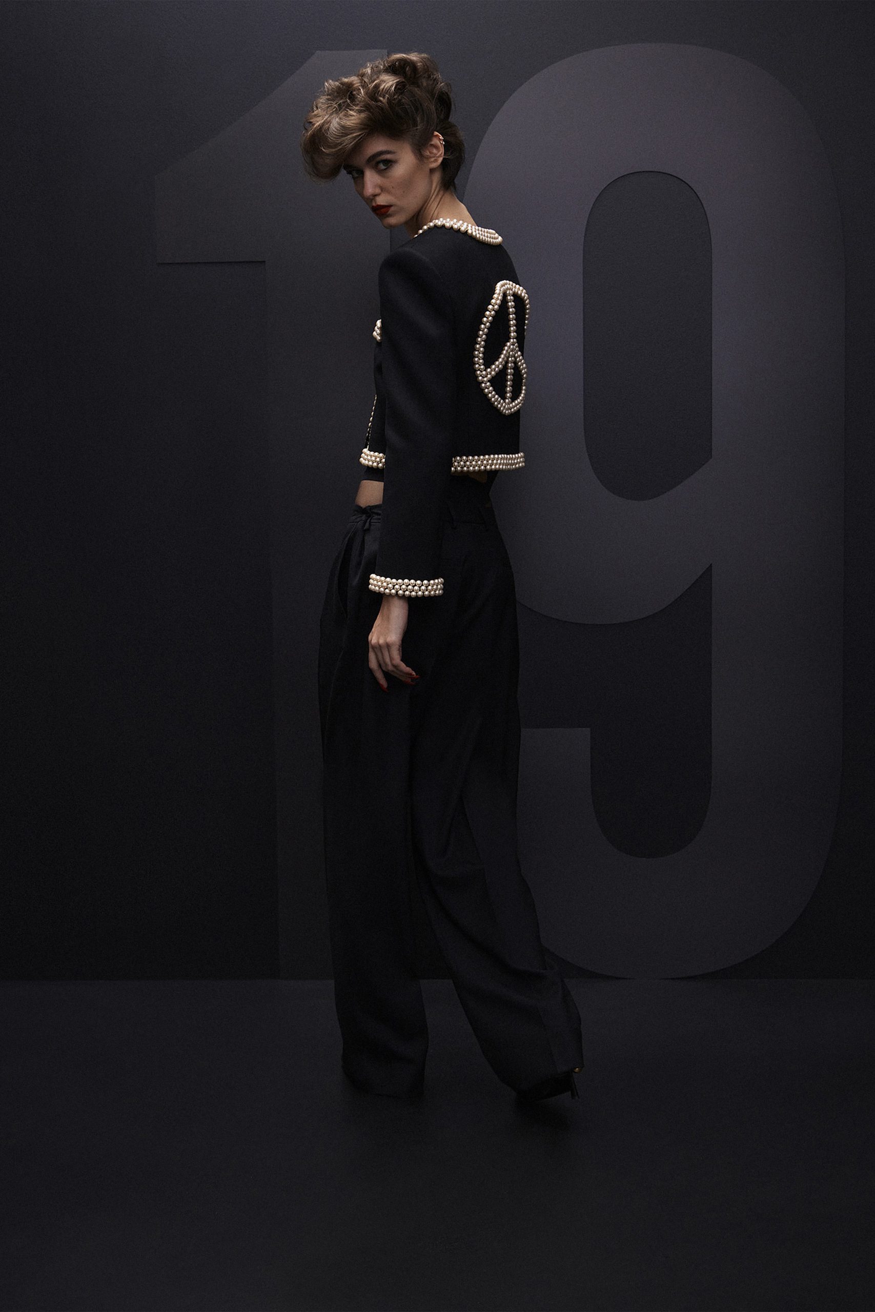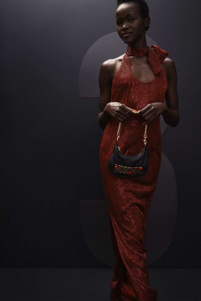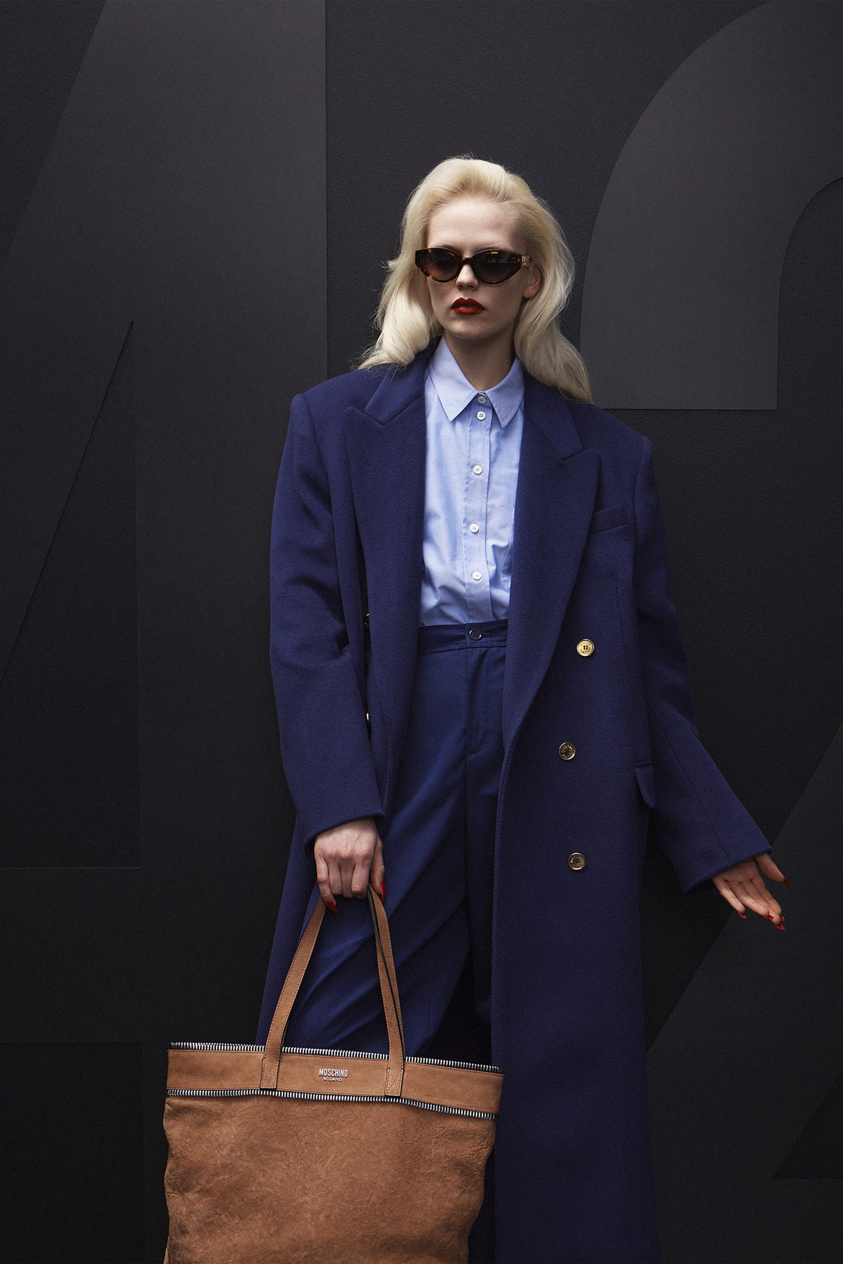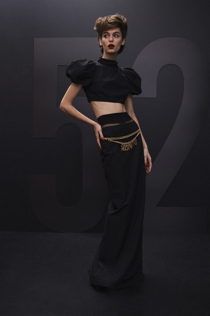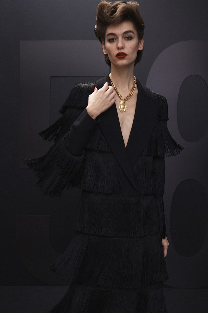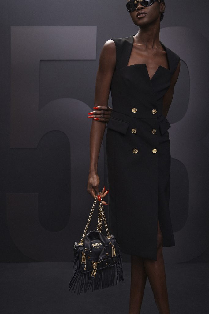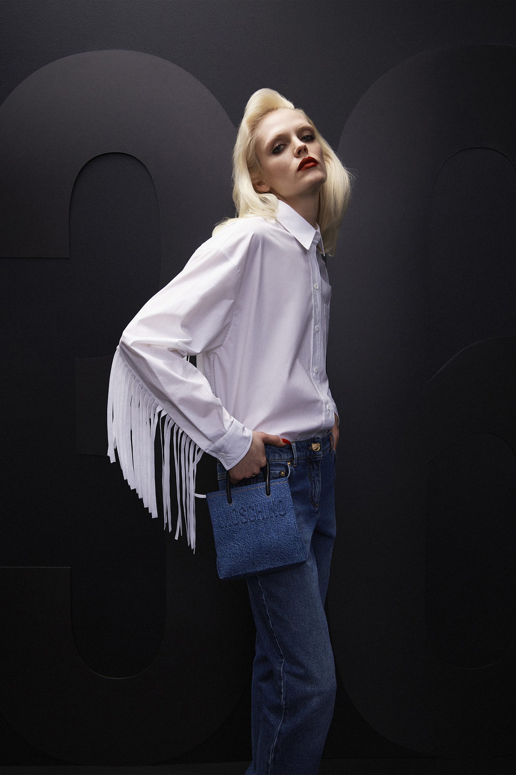 The recurring offbeat touches become anchoring playful tools to deceive the eyes. Ties are cropped and slightly oversize, knit cummerbunds become belly warmers, the perfecto biker jacket turns into a briefcase, the tiny embroidered hearts, a house signature, migrate from shirts to the iconic Moschino belt.