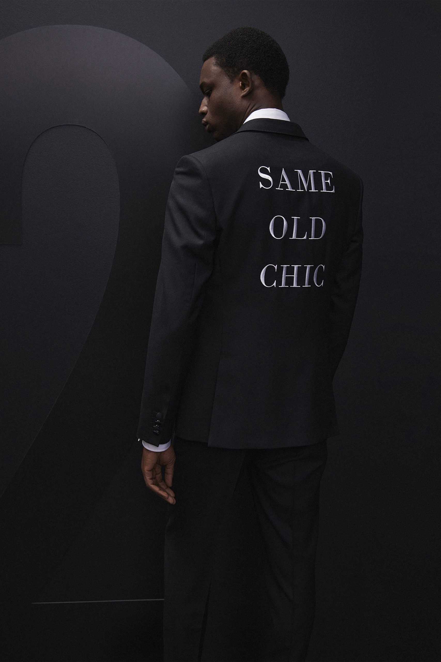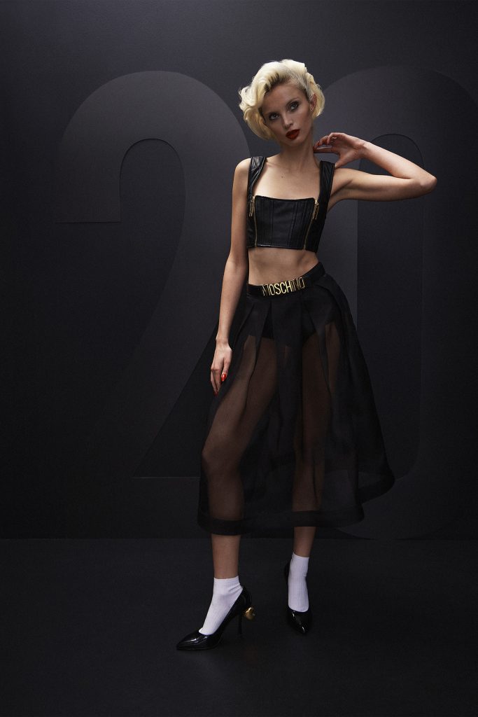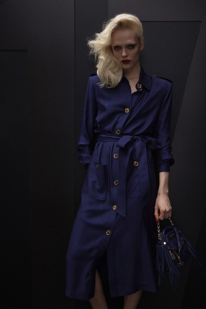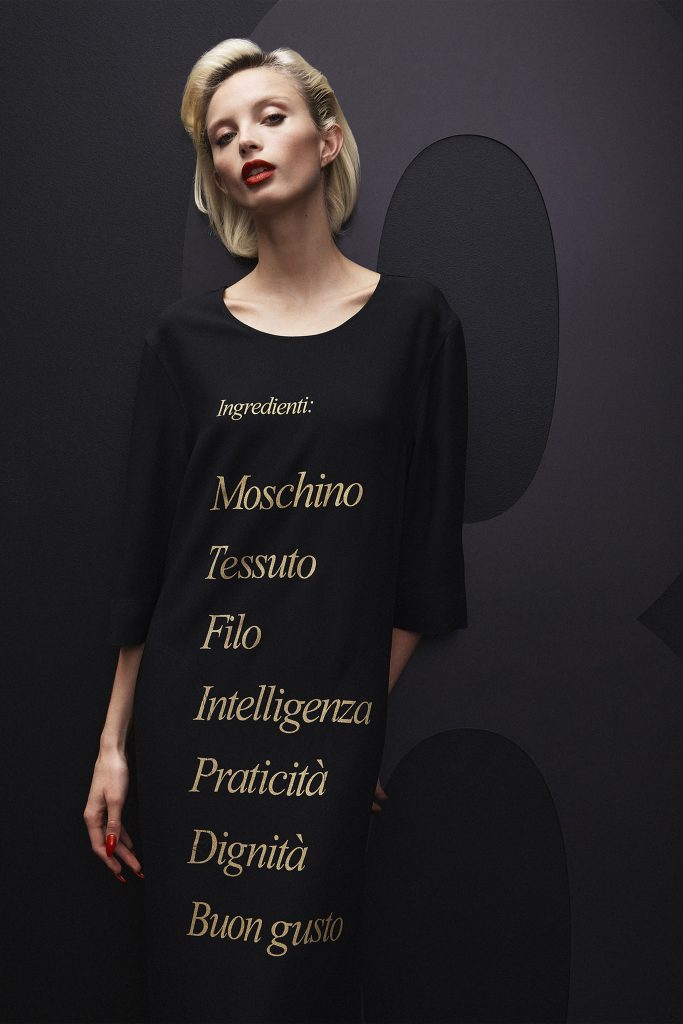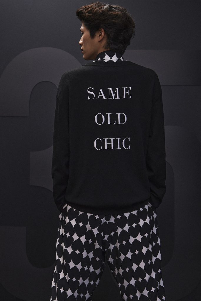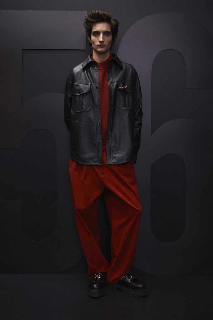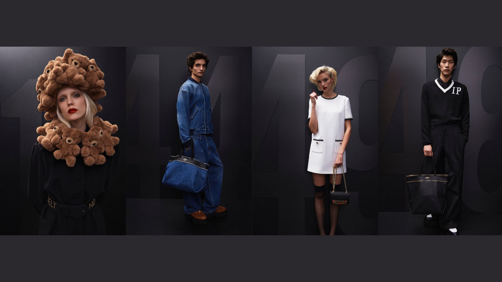 The recurring offbeat touches become anchoring playful tools to deceive the eyes. Ties are cropped and slightly oversize, knit cummerbunds become belly warmers, the perfecto biker jacket turns into a briefcase, the tiny embroidered hearts, a house signature, migrate from shirts to the iconic Moschino belt.