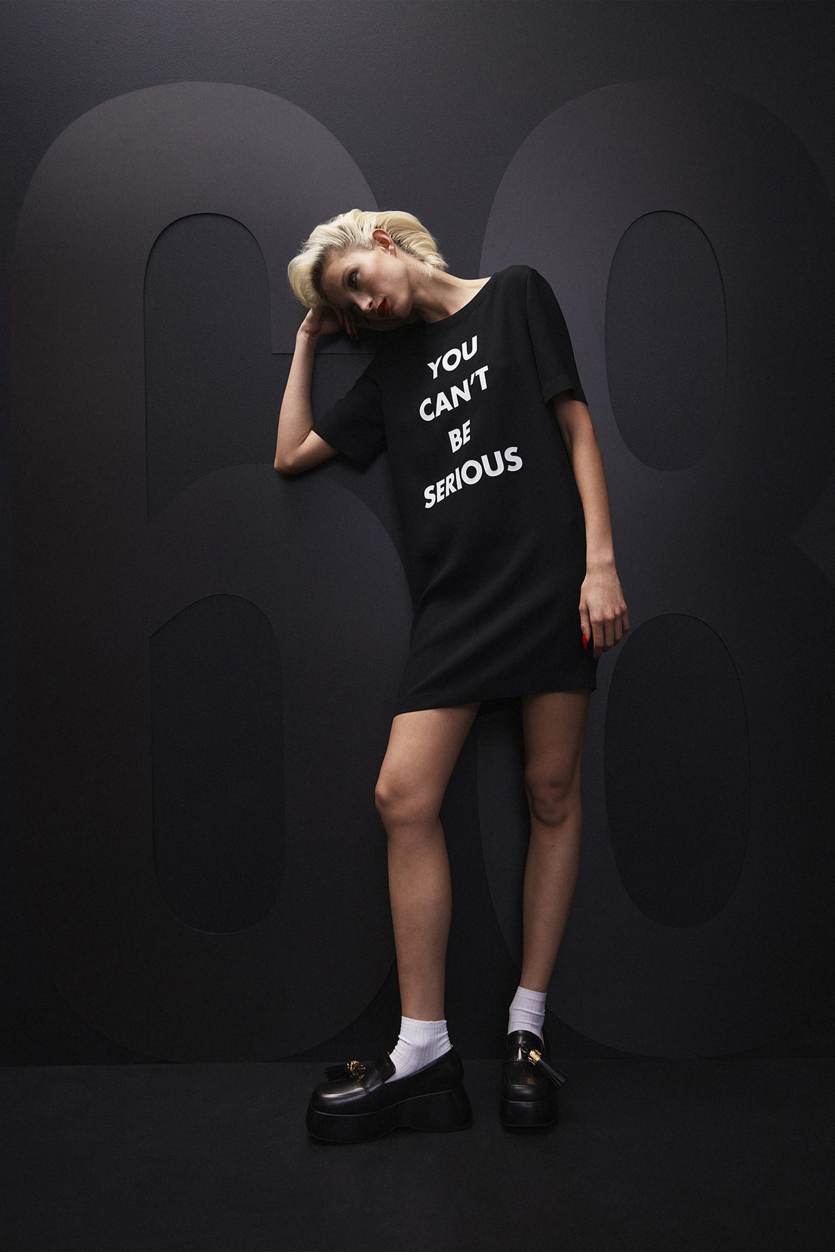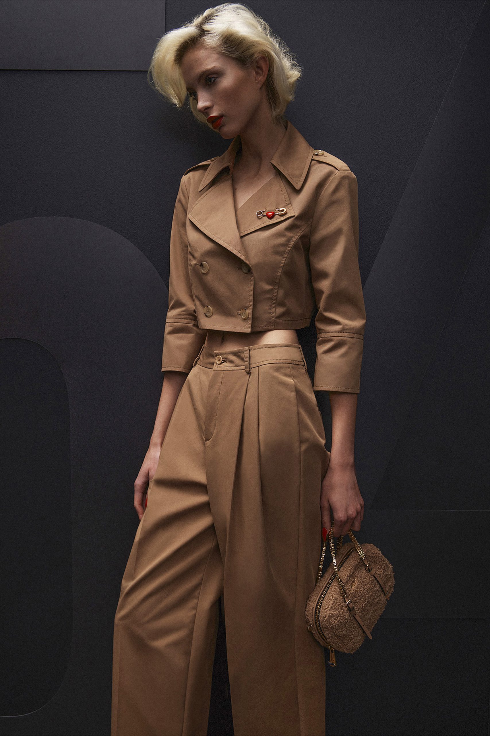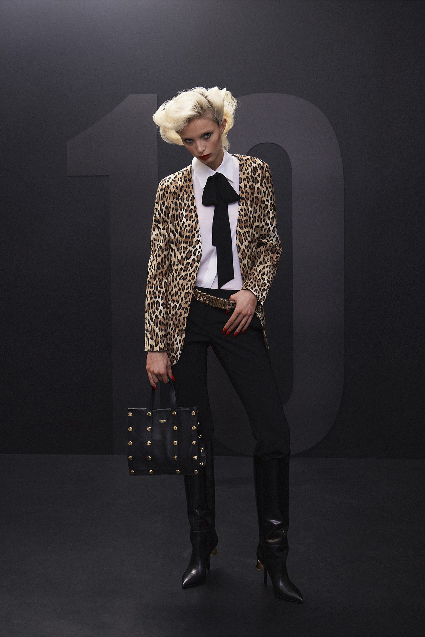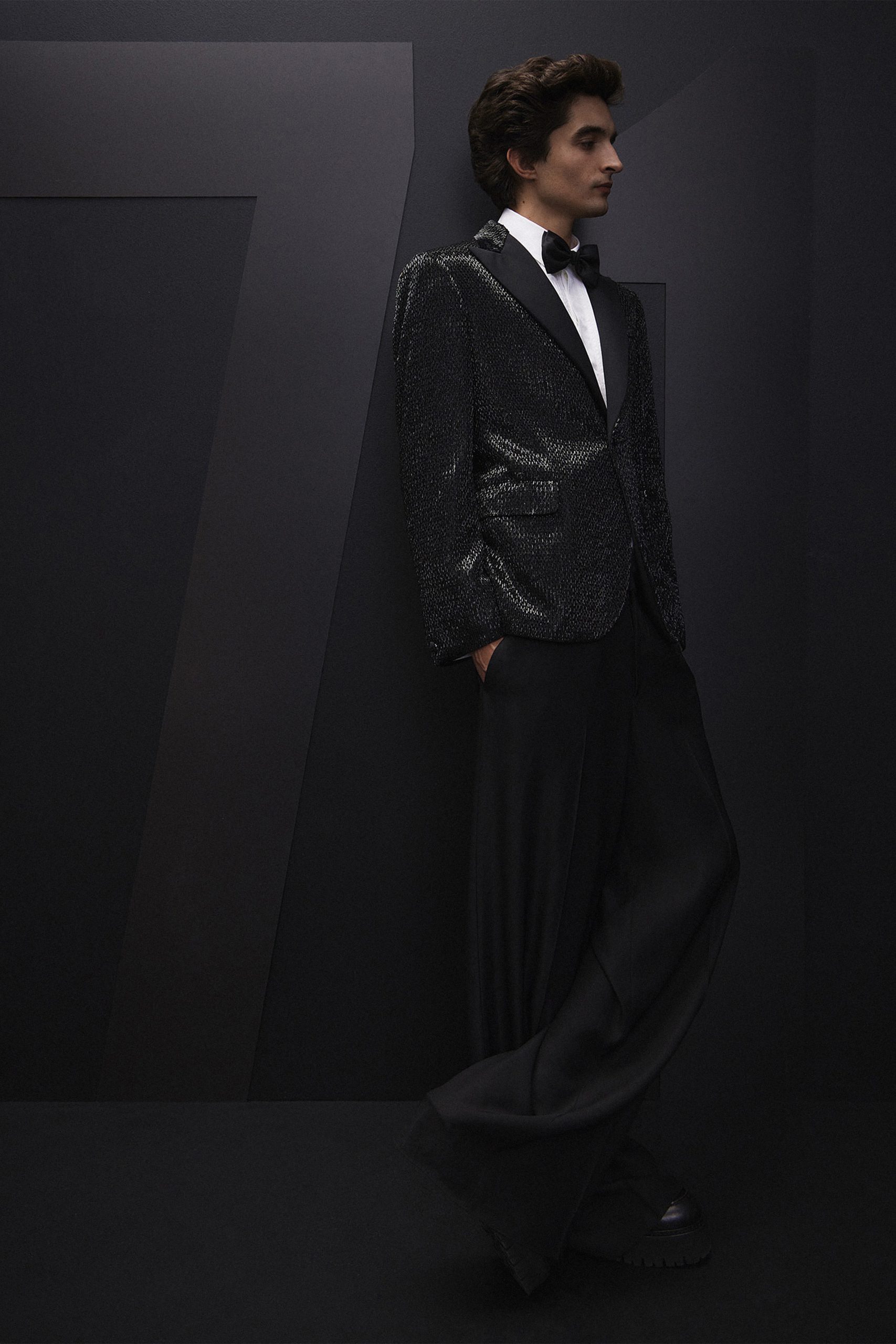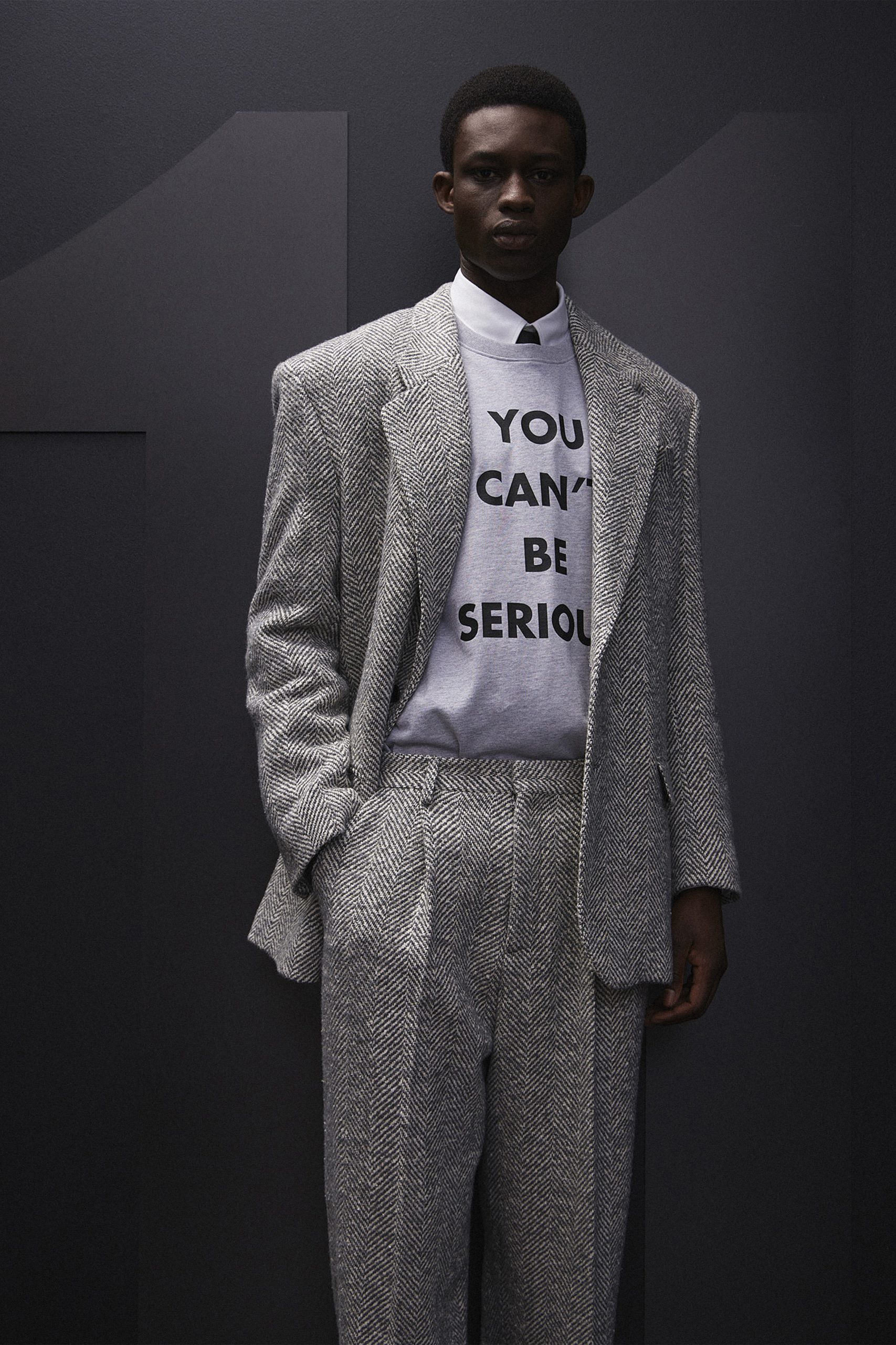 The recurring offbeat touches become anchoring playful tools to deceive the eyes. Ties are cropped and slightly oversize, knit cummerbunds become belly warmers, the perfecto biker jacket turns into a briefcase, the tiny embroidered hearts, a house signature, migrate from shirts to the iconic Moschino belt.