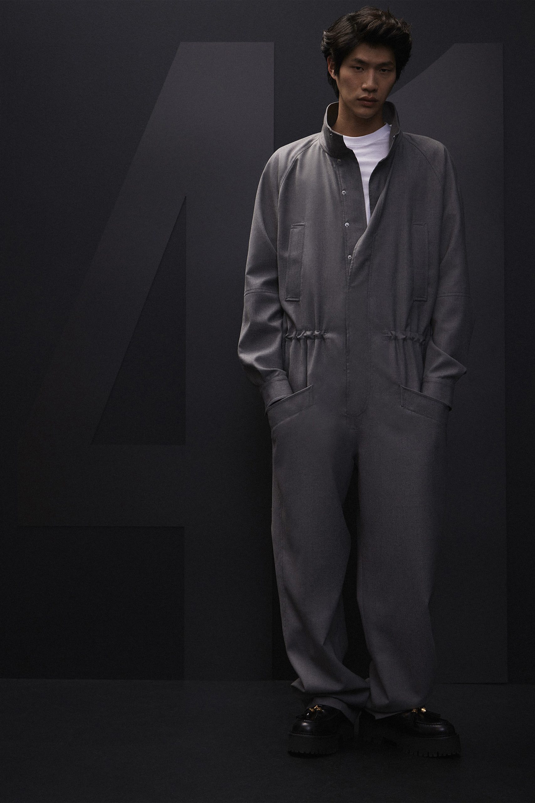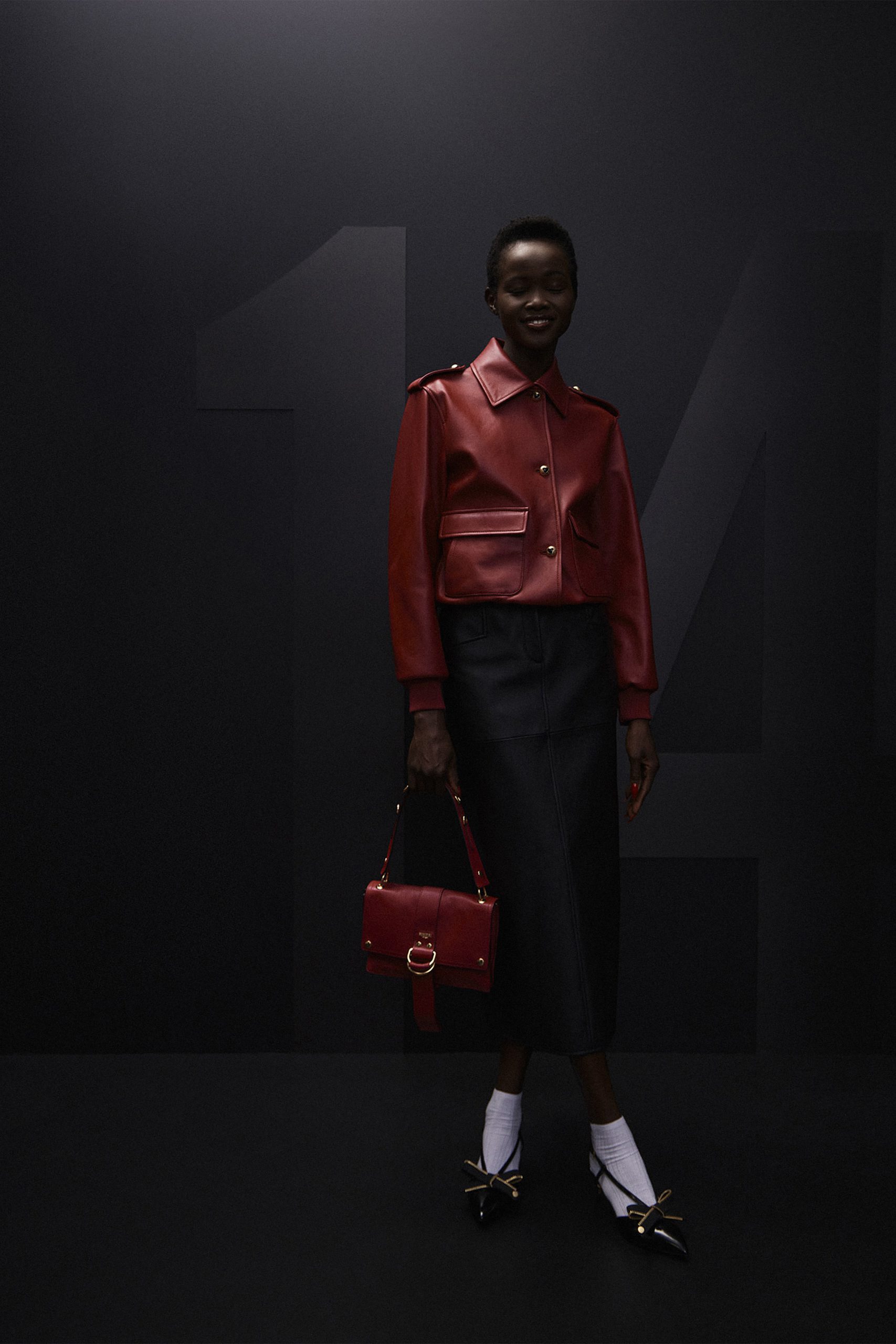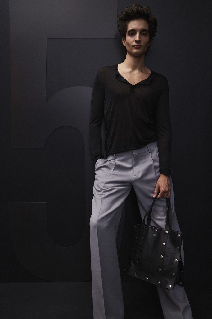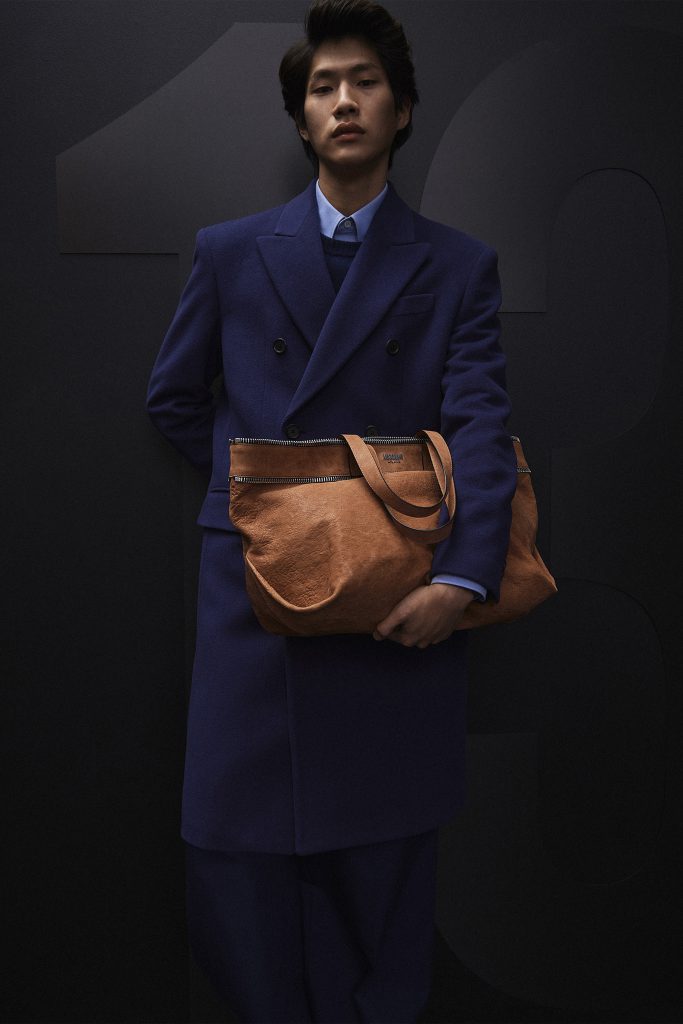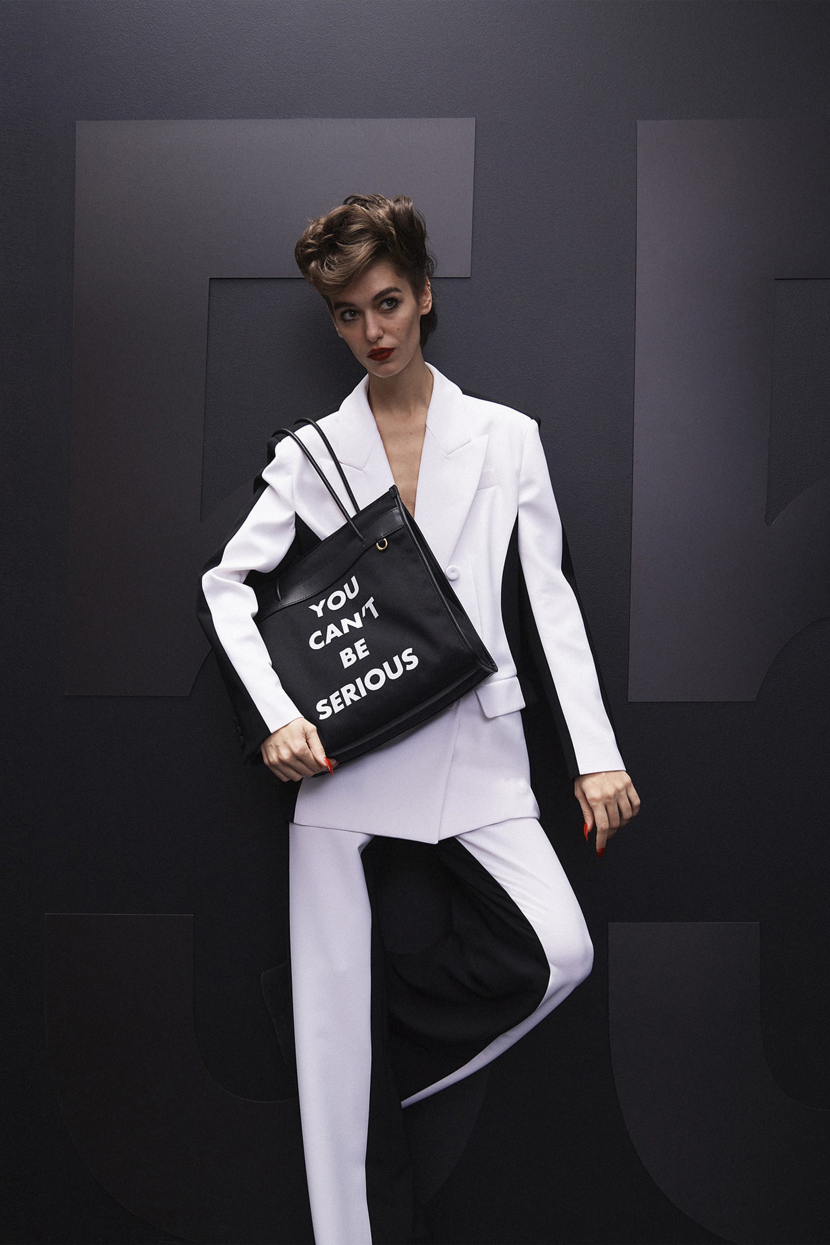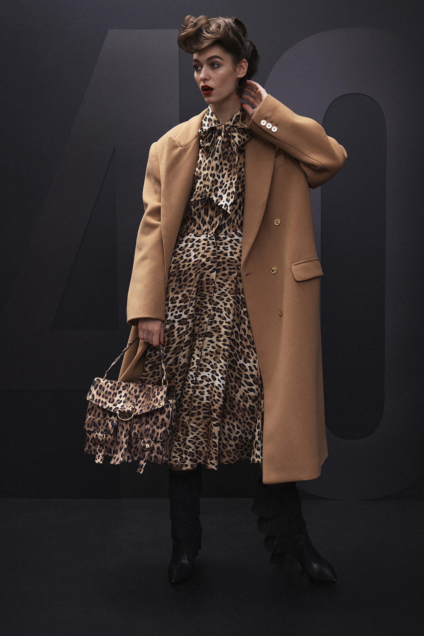 The recurring offbeat touches become anchoring playful tools to deceive the eyes. Ties are cropped and slightly oversize, knit cummerbunds become belly warmers, the perfecto biker jacket turns into a briefcase, the tiny embroidered hearts, a house signature, migrate from shirts to the iconic Moschino belt.