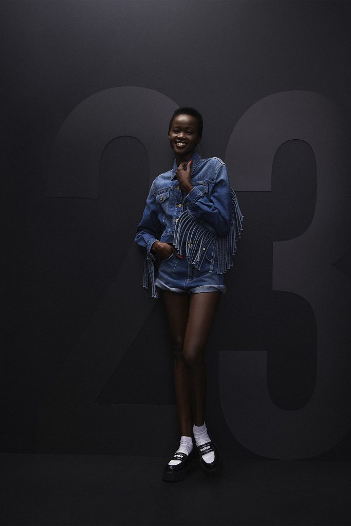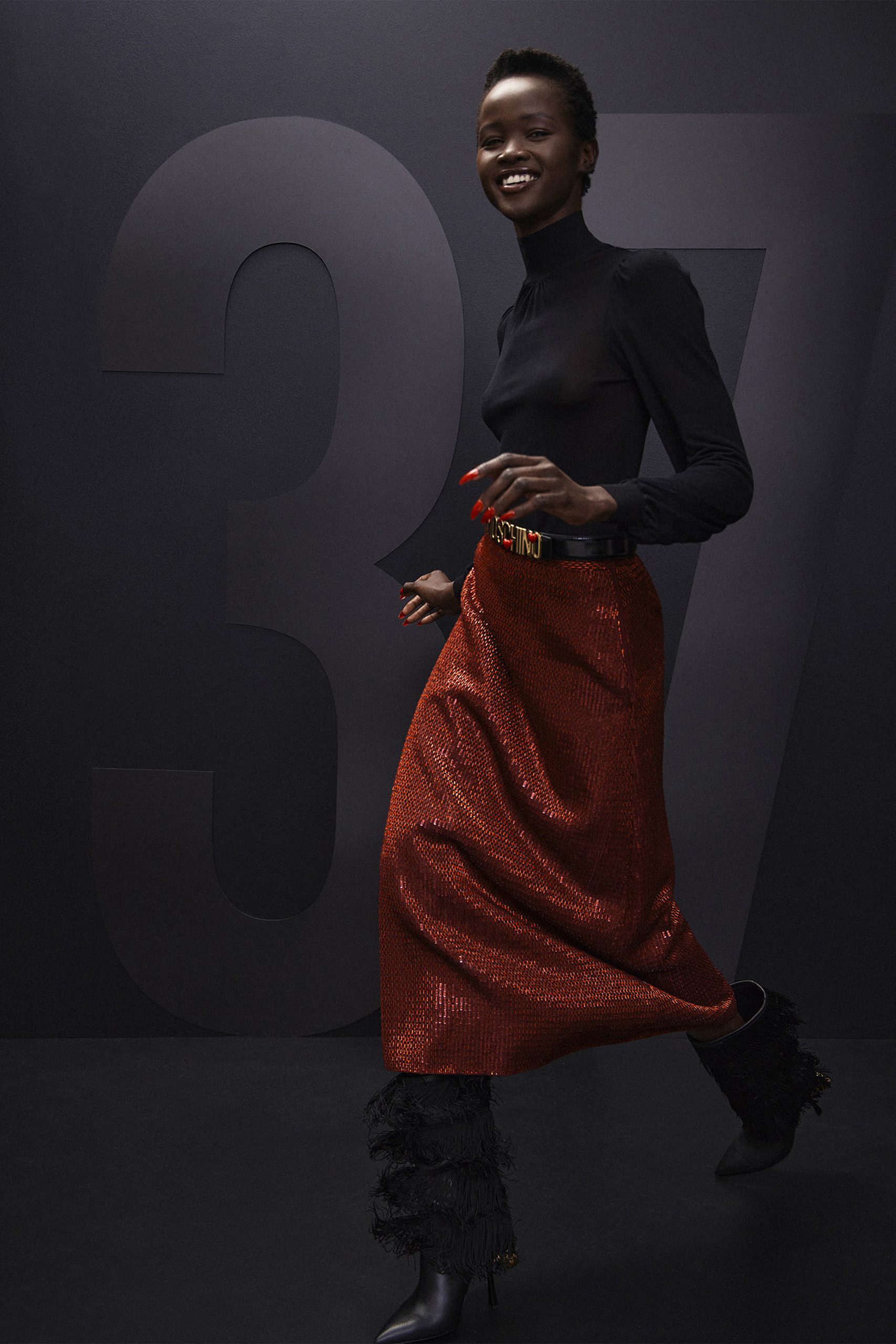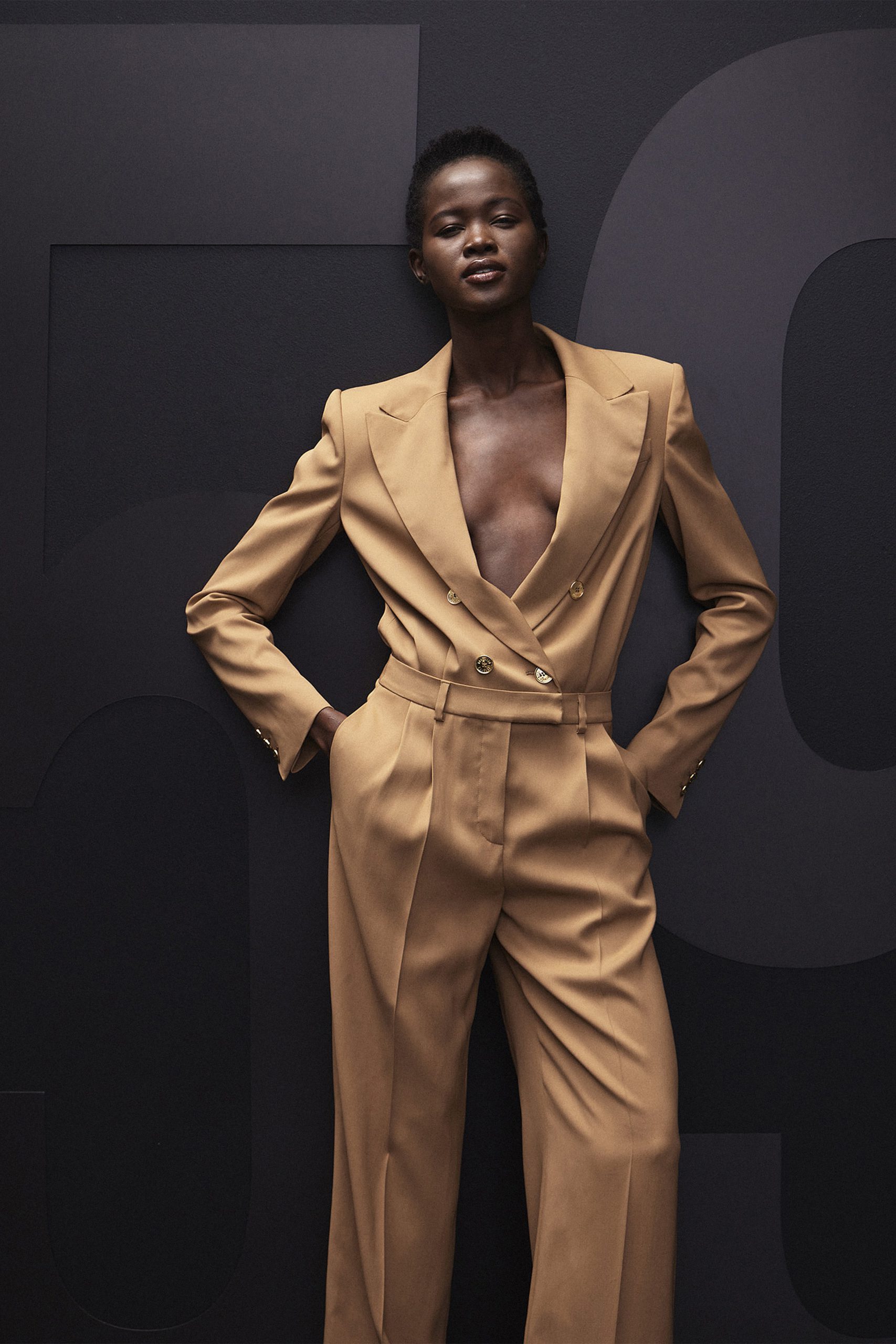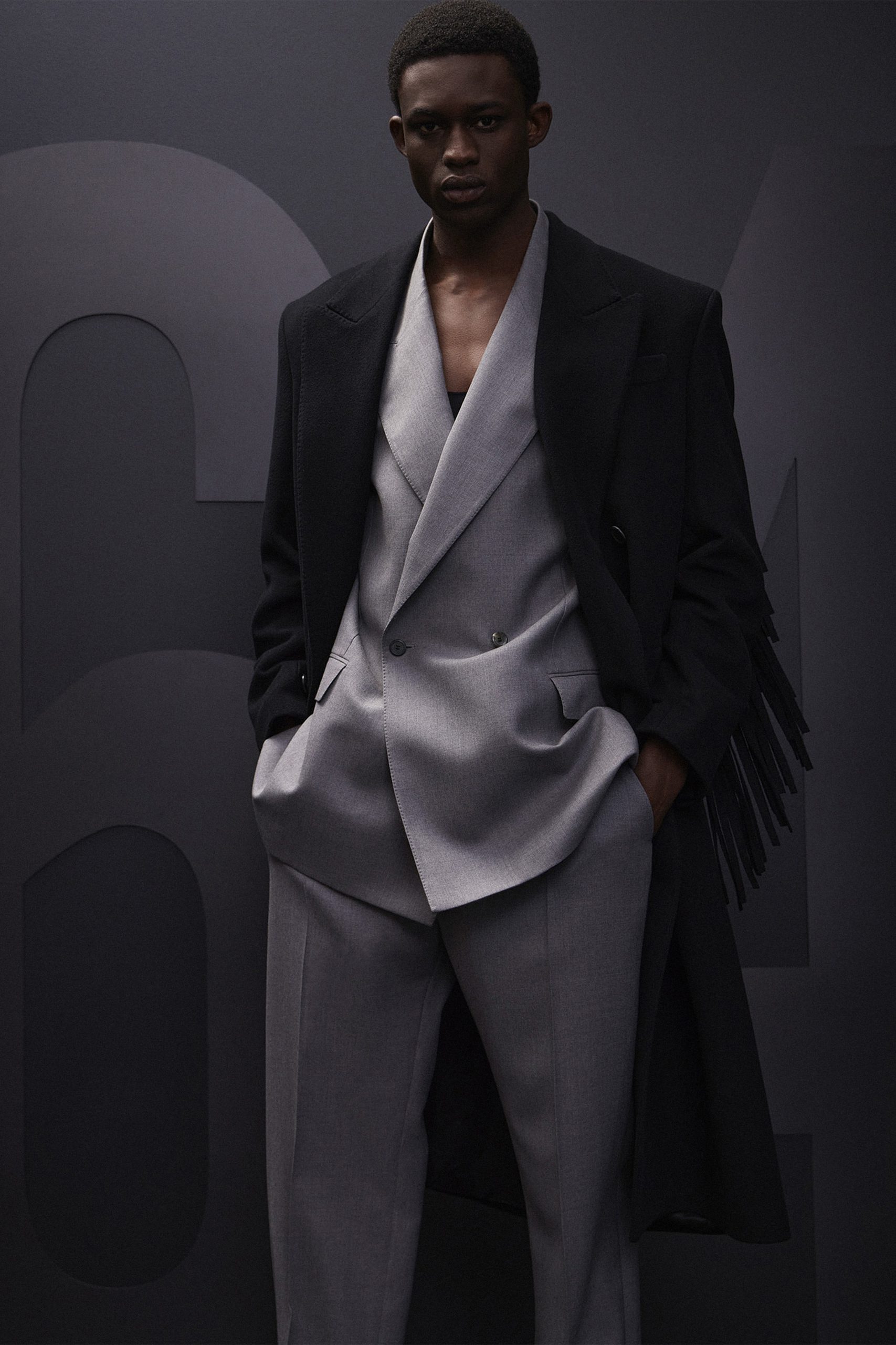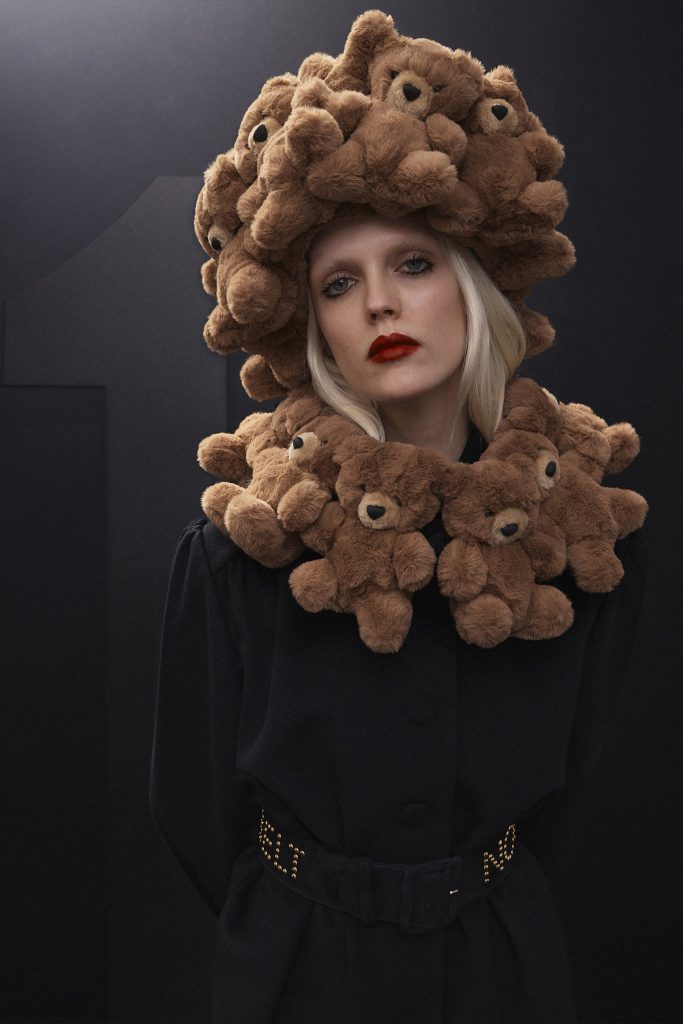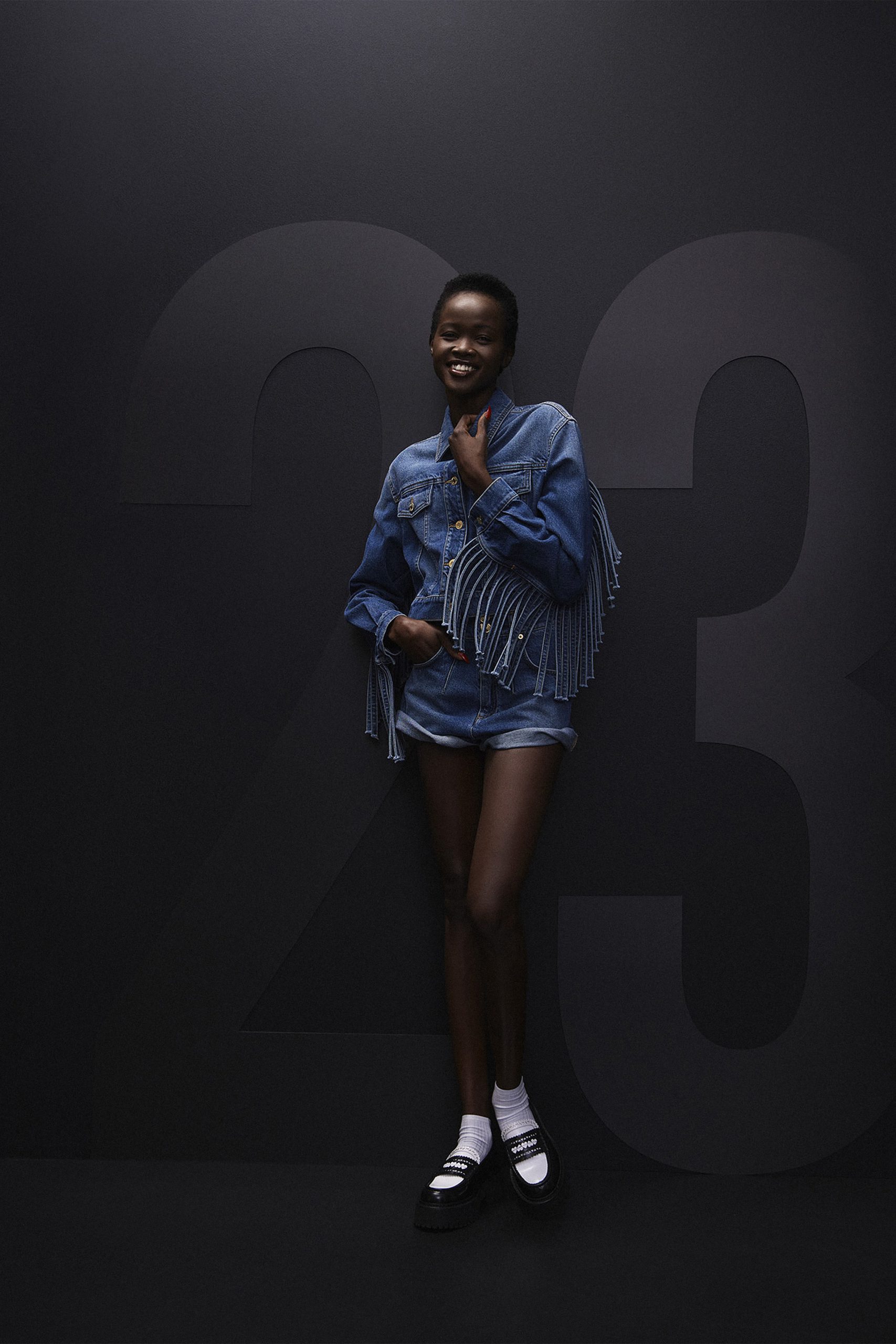 The recurring offbeat touches become anchoring playful tools to deceive the eyes. Ties are cropped and slightly oversize, knit cummerbunds become belly warmers, the perfecto biker jacket turns into a briefcase, the tiny embroidered hearts, a house signature, migrate from shirts to the iconic Moschino belt.