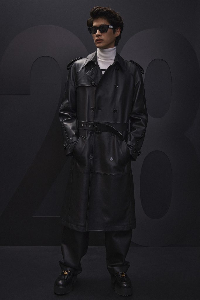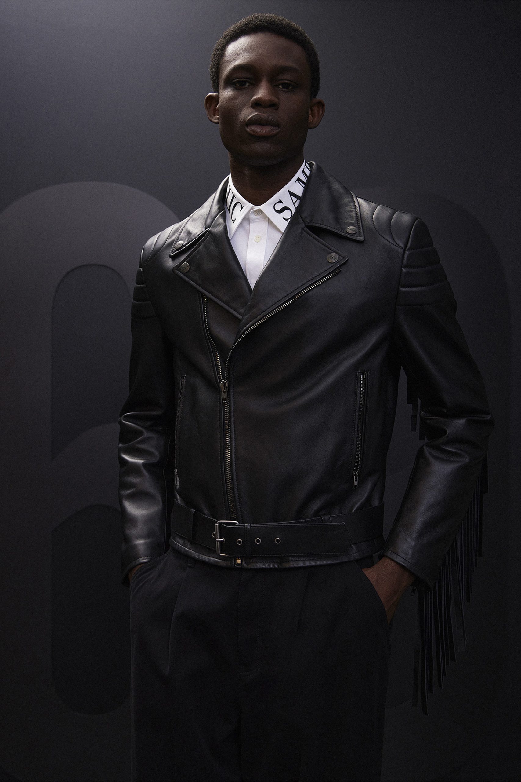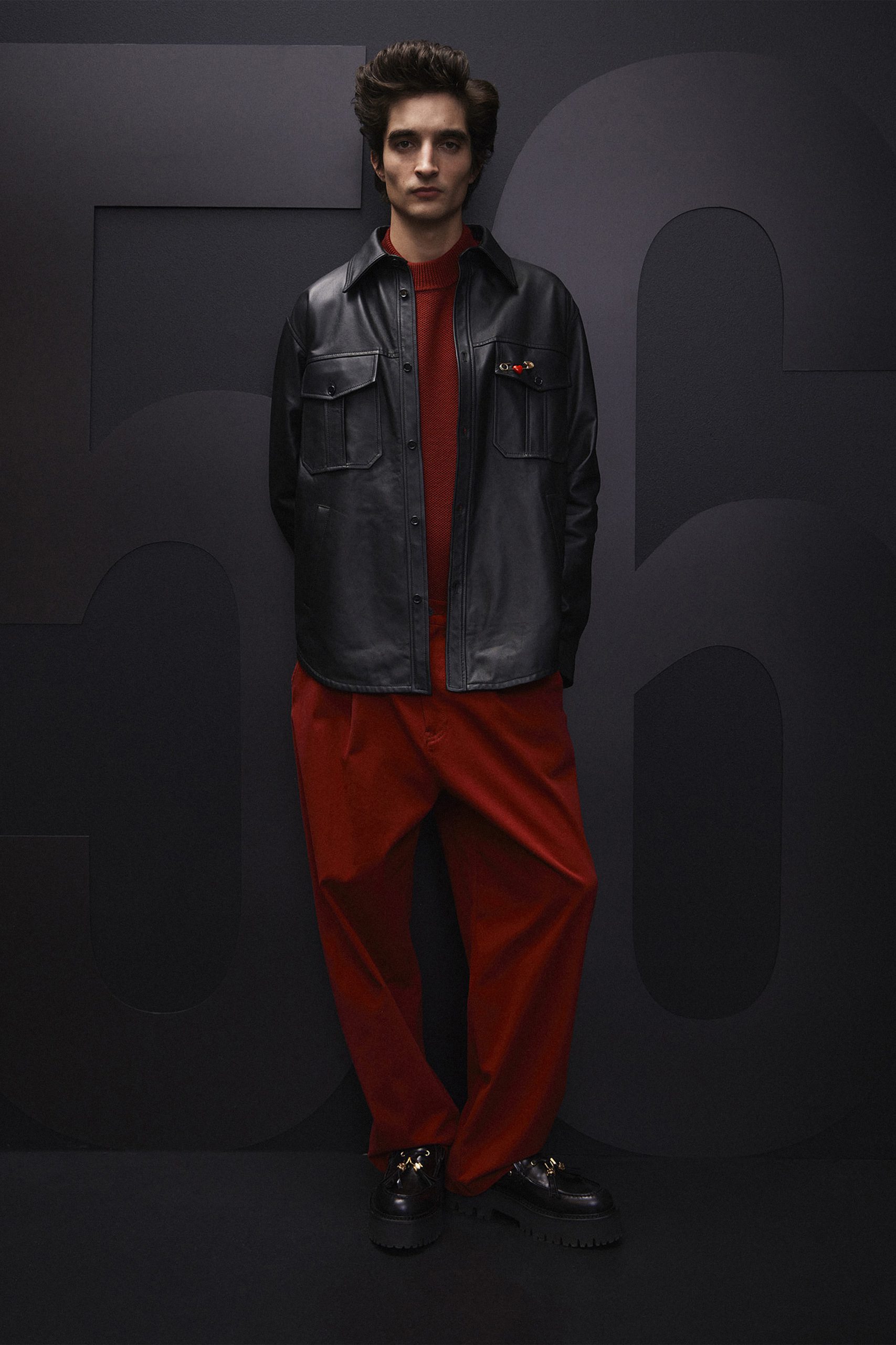 Toying with mixed media and layering tricks, cropped hooded sweaters have built-in striped shirts, ditto for trompe l’oeil tailored pants with incorporated briefs and T-shirt and shirt combos, while blazers feature ribknit insets mid-way through the arms or on the collar and leather biker jackets have knitted front panels.