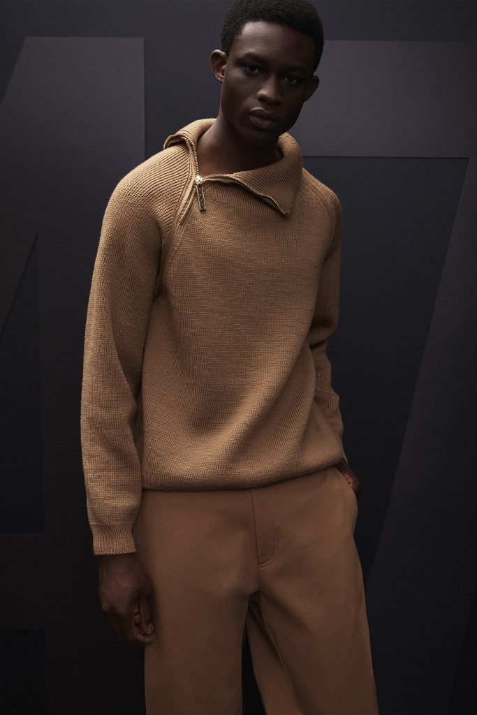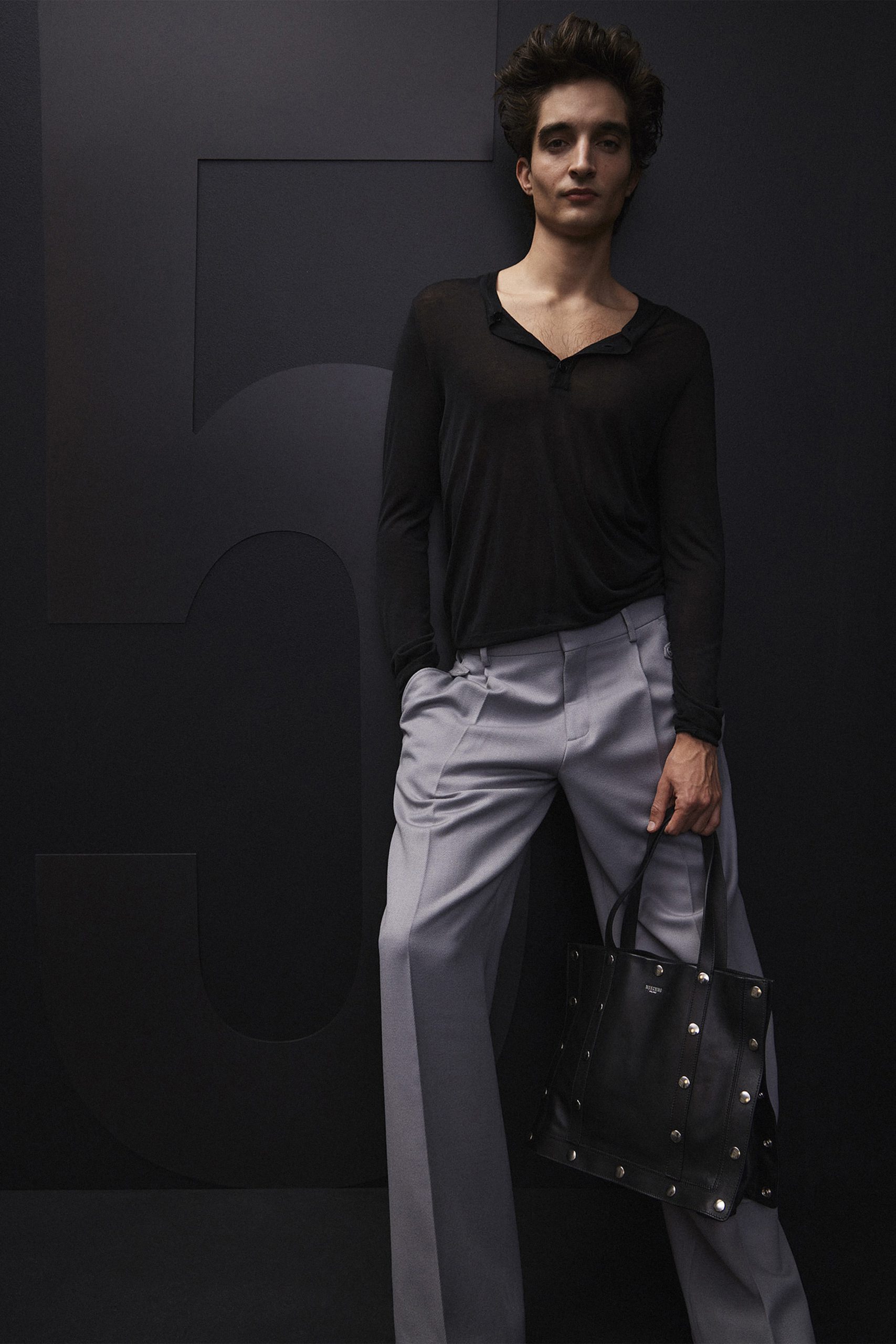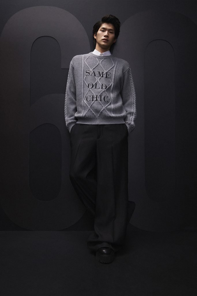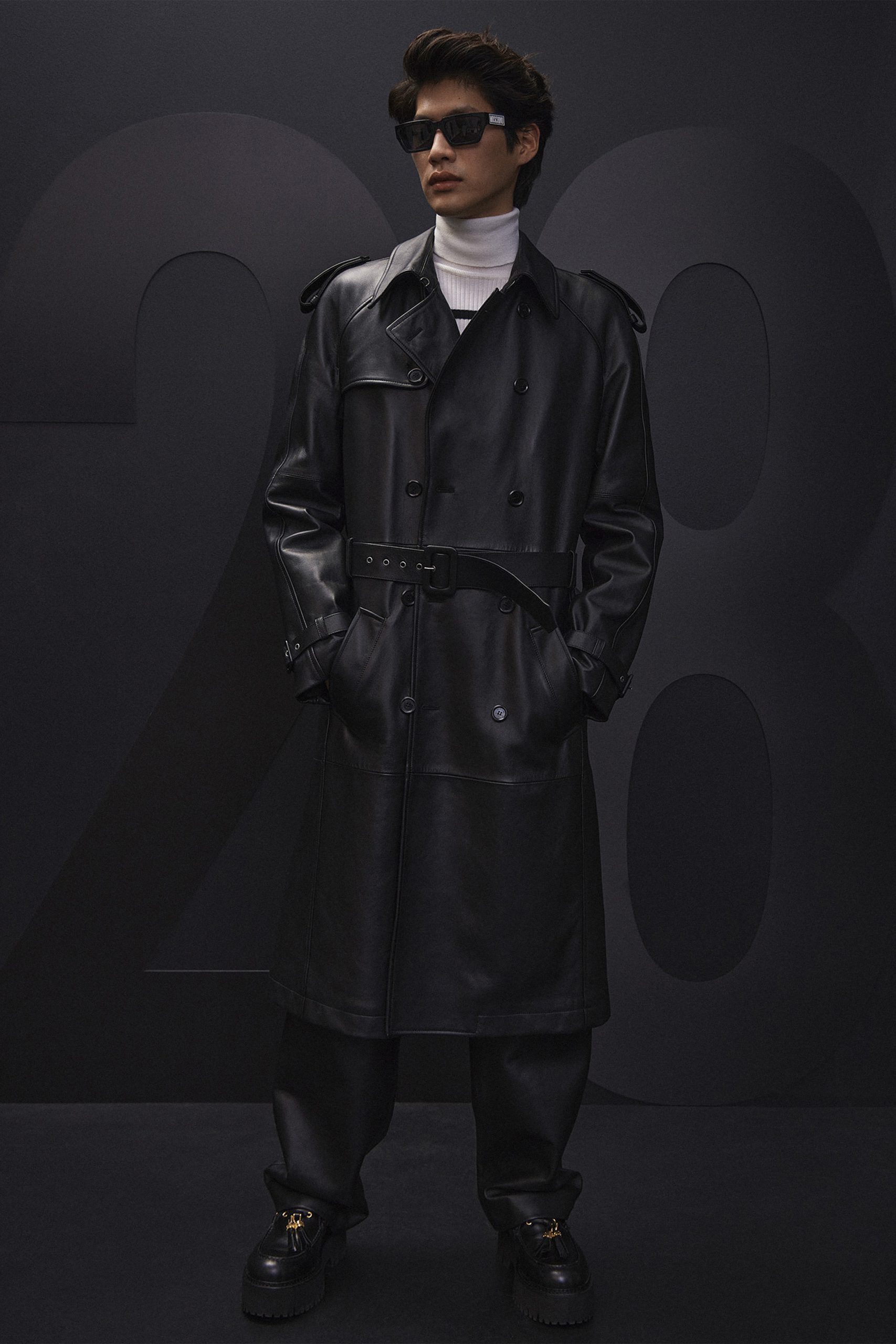 Toying with mixed media and layering tricks, cropped hooded sweaters have built-in striped shirts, ditto for trompe l’oeil tailored pants with incorporated briefs and T-shirt and shirt combos, while blazers feature ribknit insets mid-way through the arms or on the collar and leather biker jackets have knitted front panels.