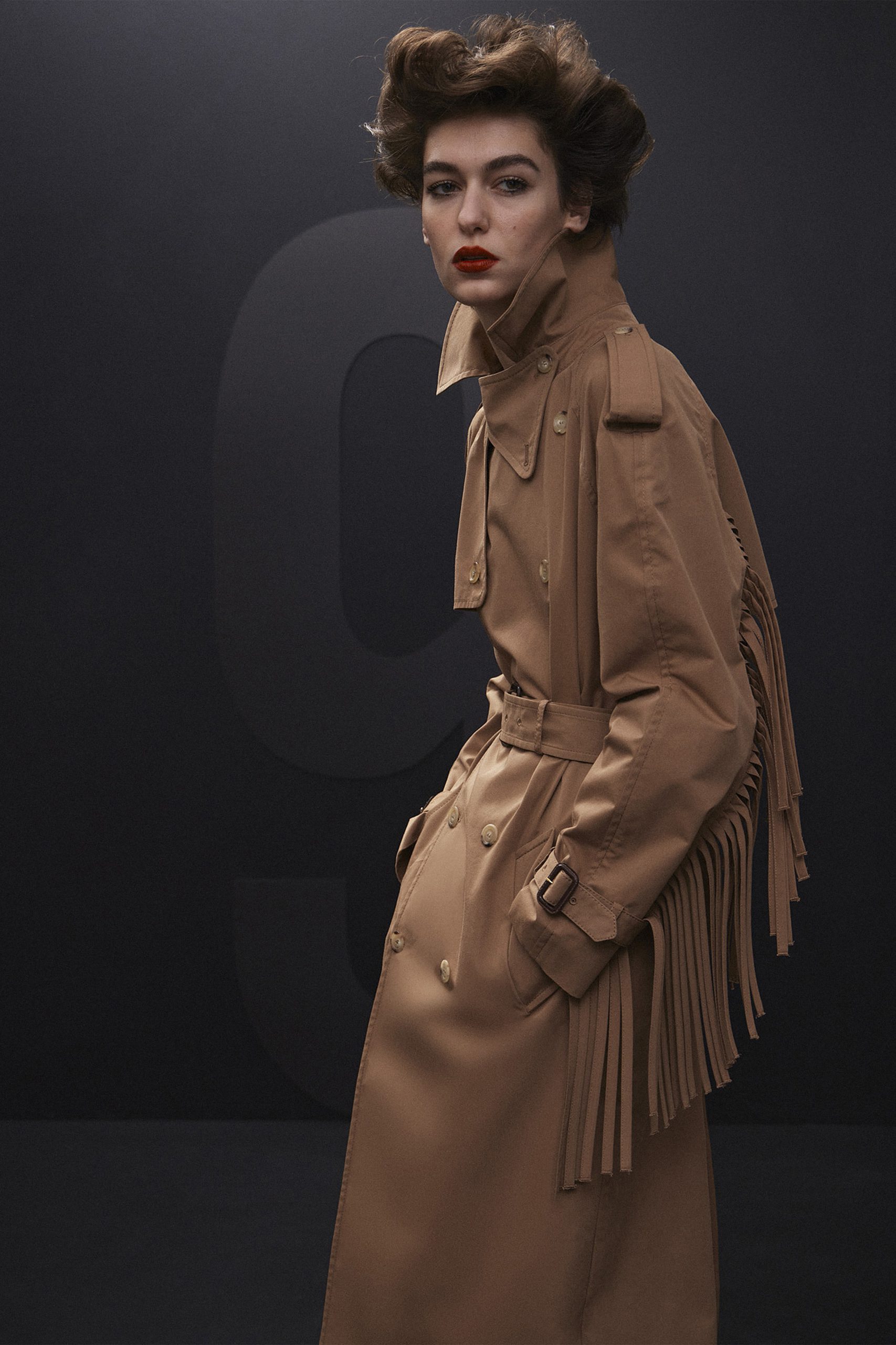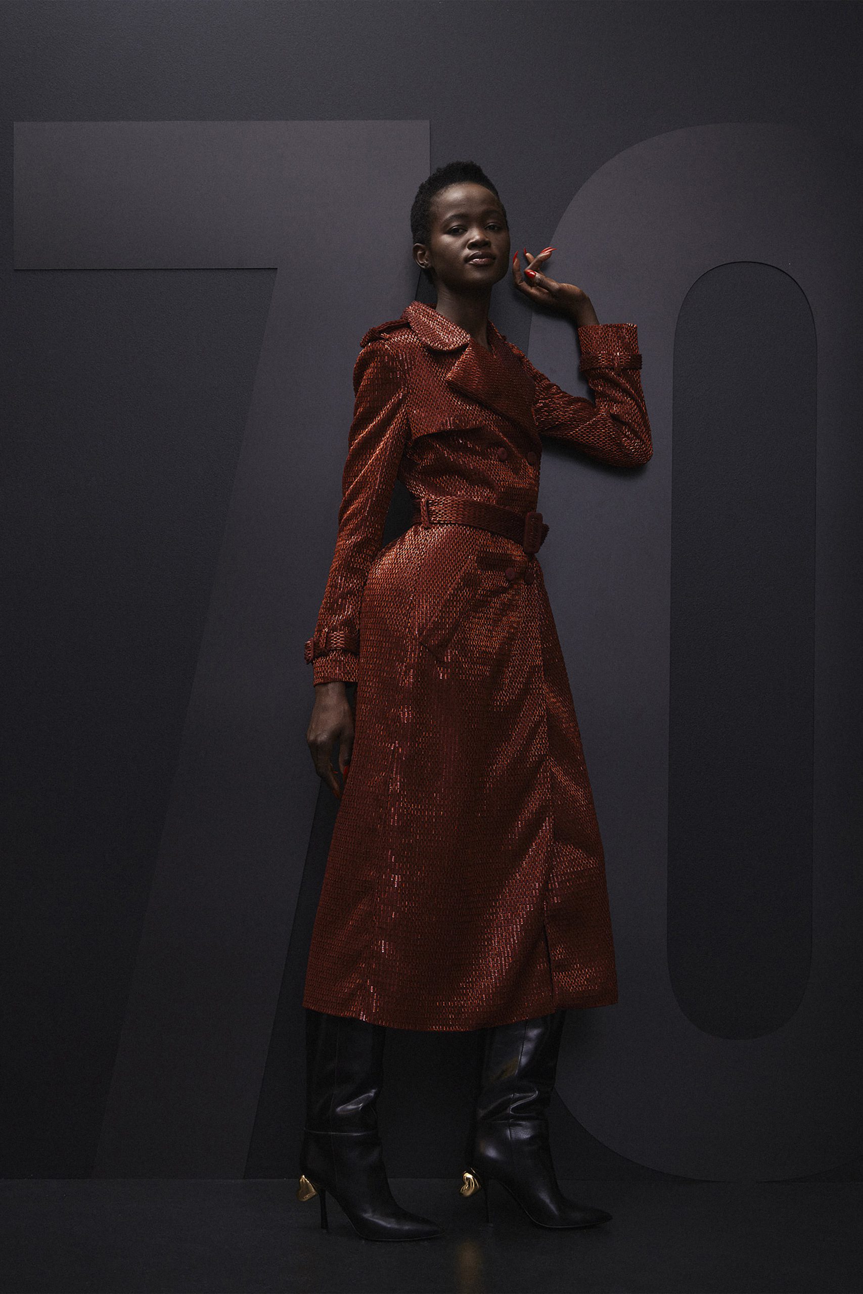 Fiery red security tags are pins scattered on tailored power-shouldered overcoats and parka jackets, for a fresh-spinned and head-spinning Moschino gimmick.