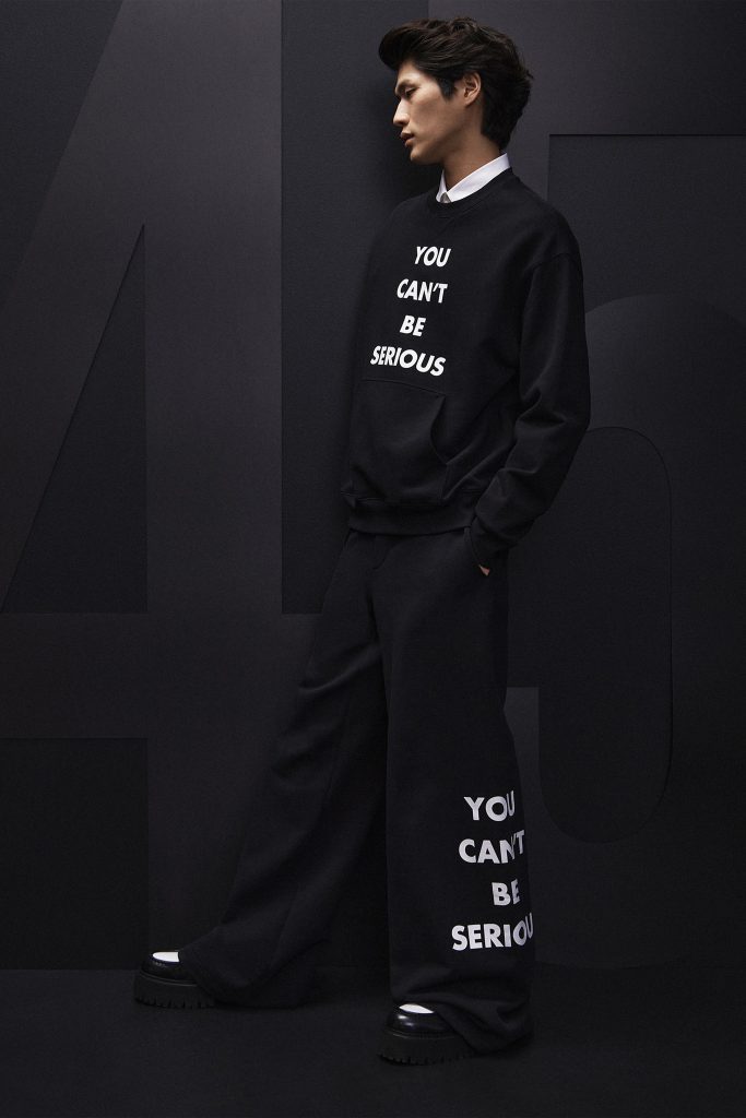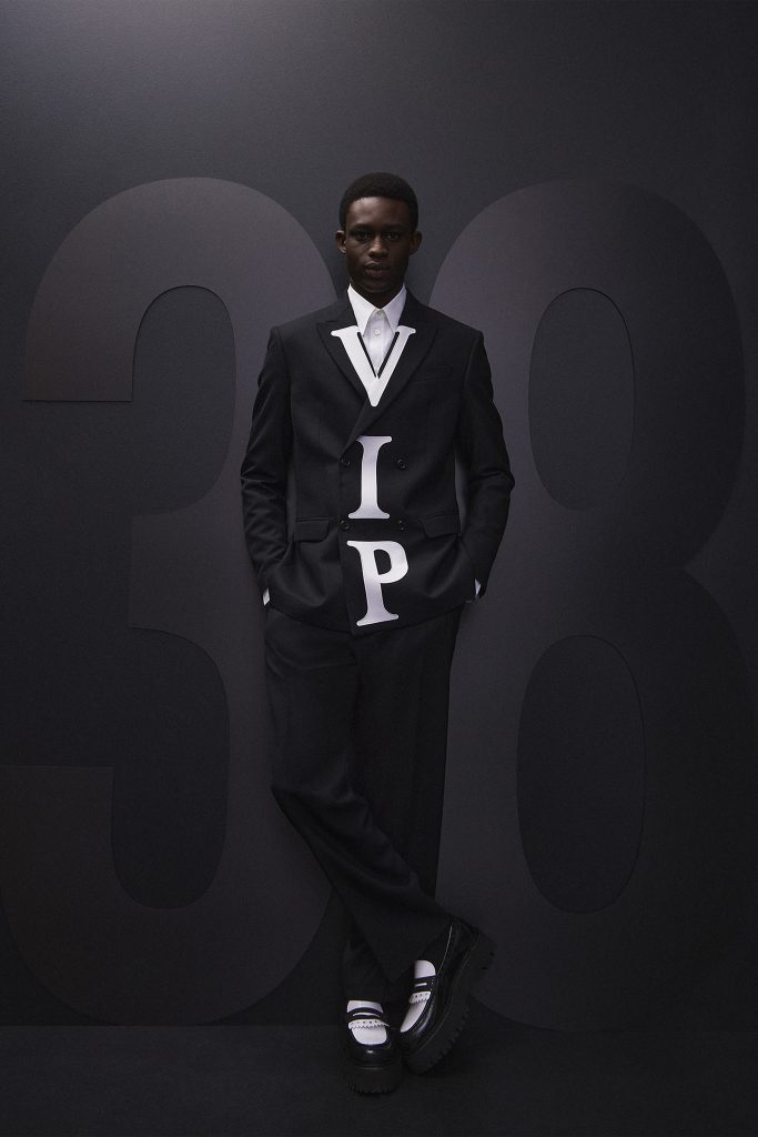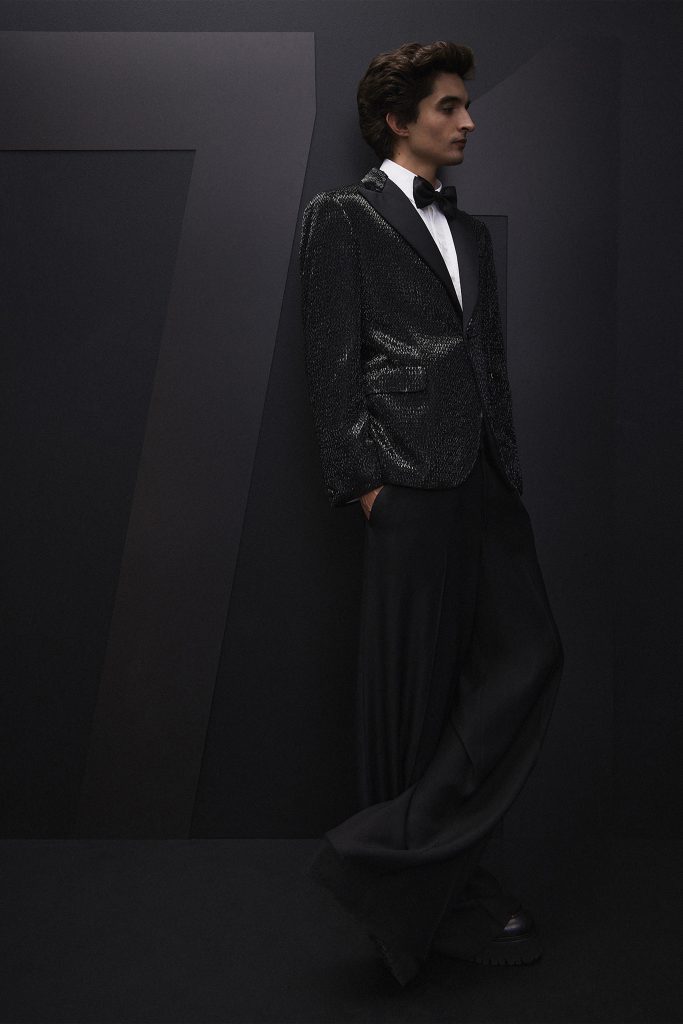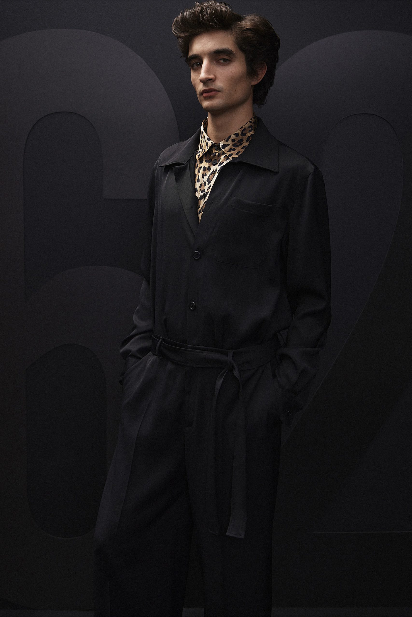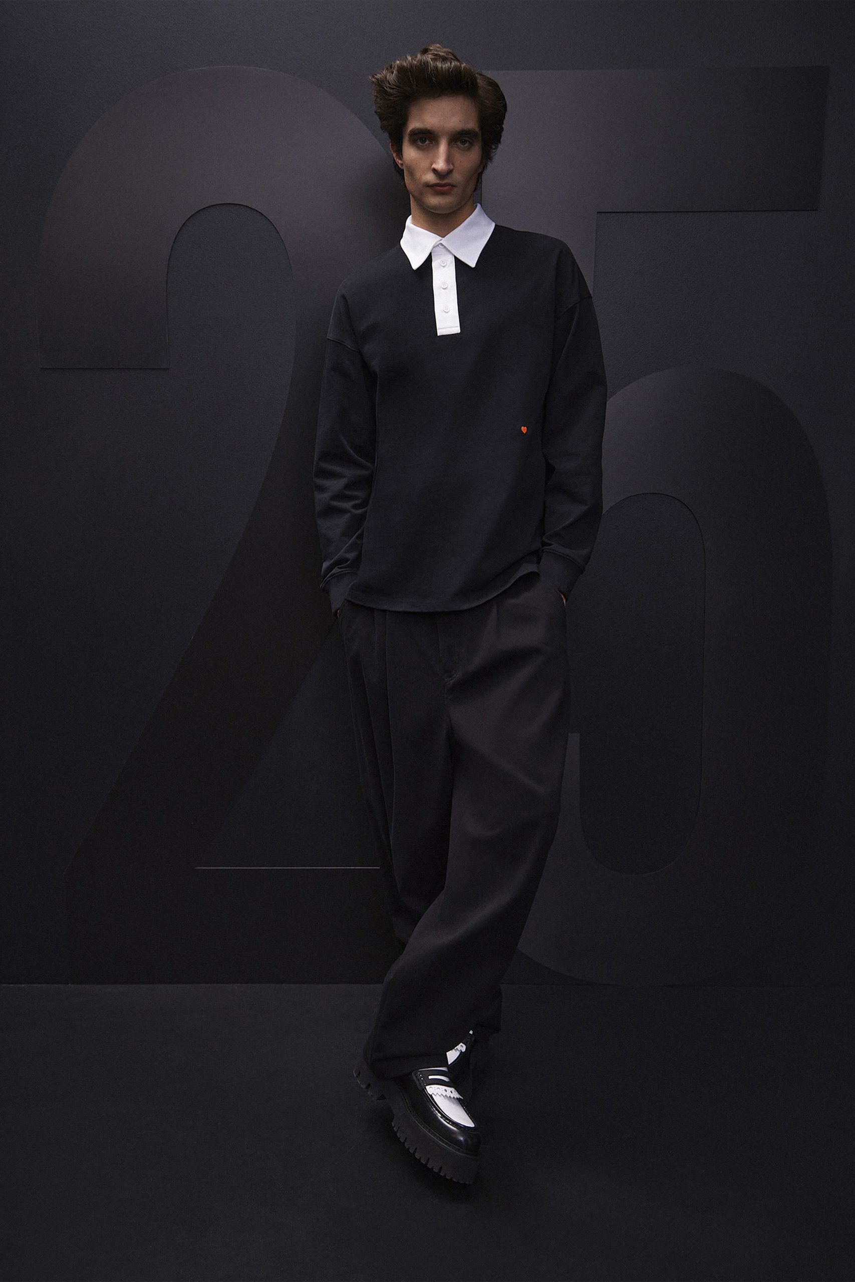 Signature motifs including hearts and polka dots are reinvented on bib shirt-like ruffled shirts and short shorts styled as briefs peeking from under sweatpants, the latter coming with built-in conservative striped cotton undies. Magnified polka dots and hearts deck evening suits creating chiaroscuro effects.