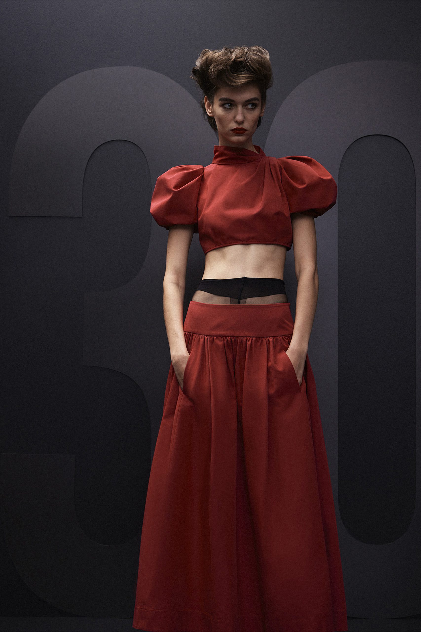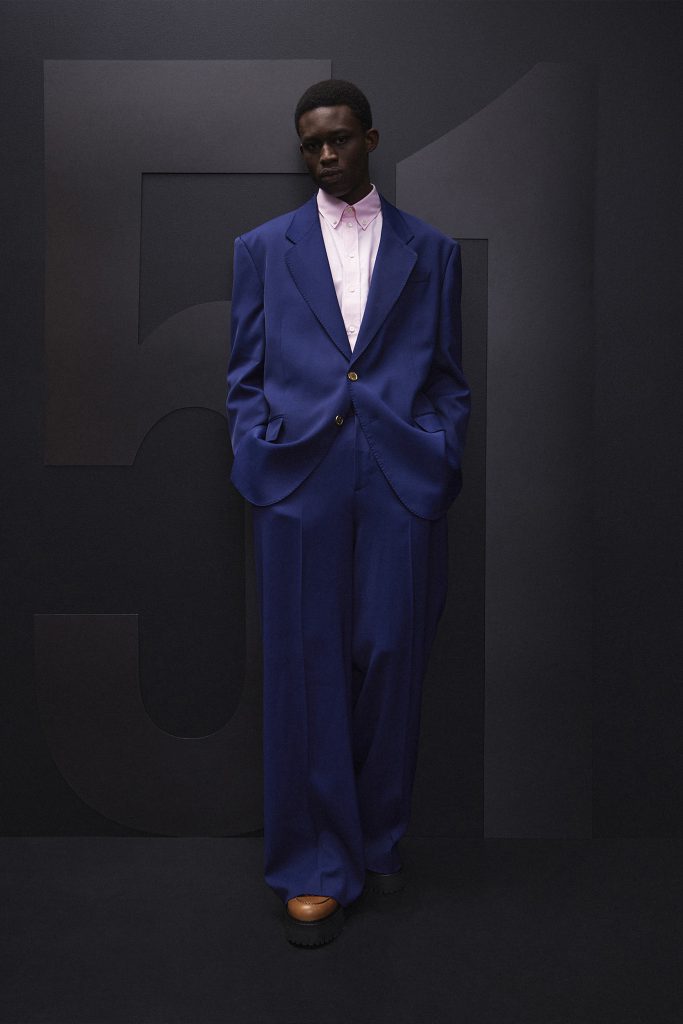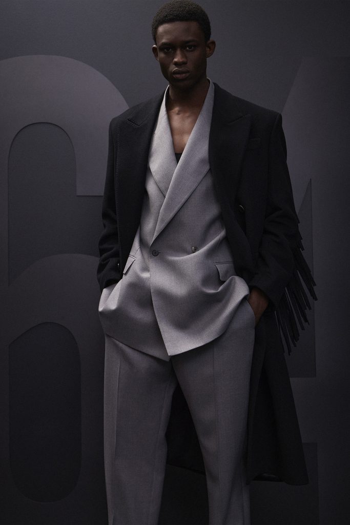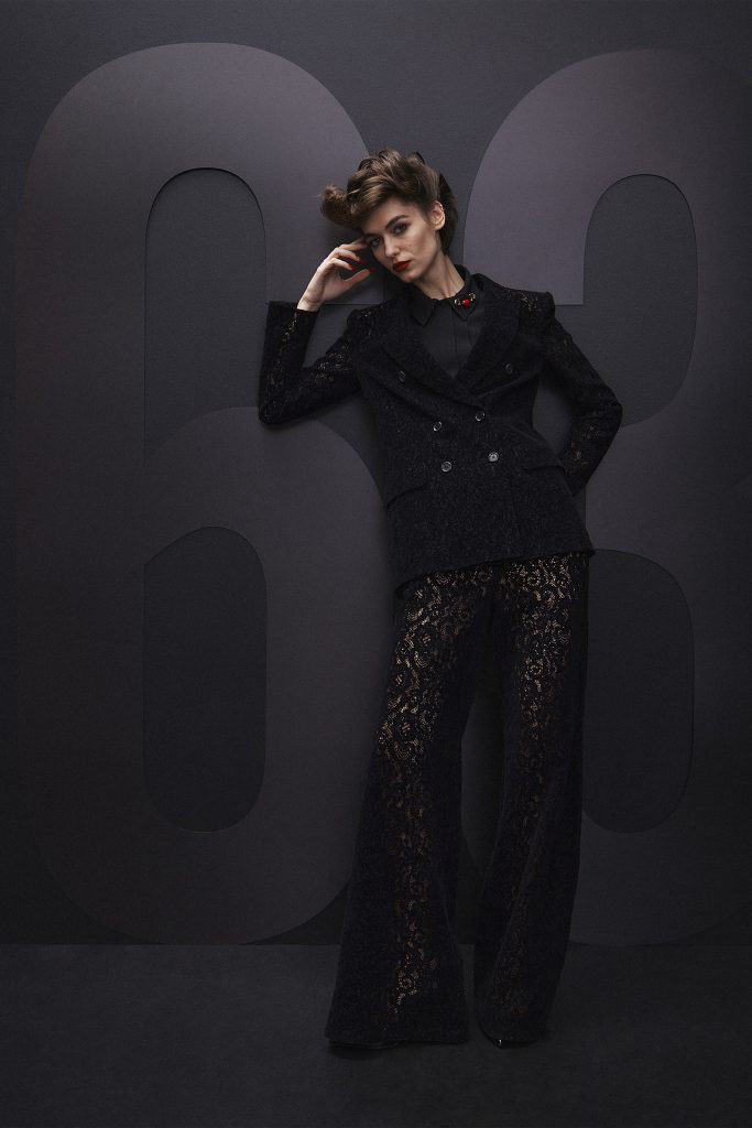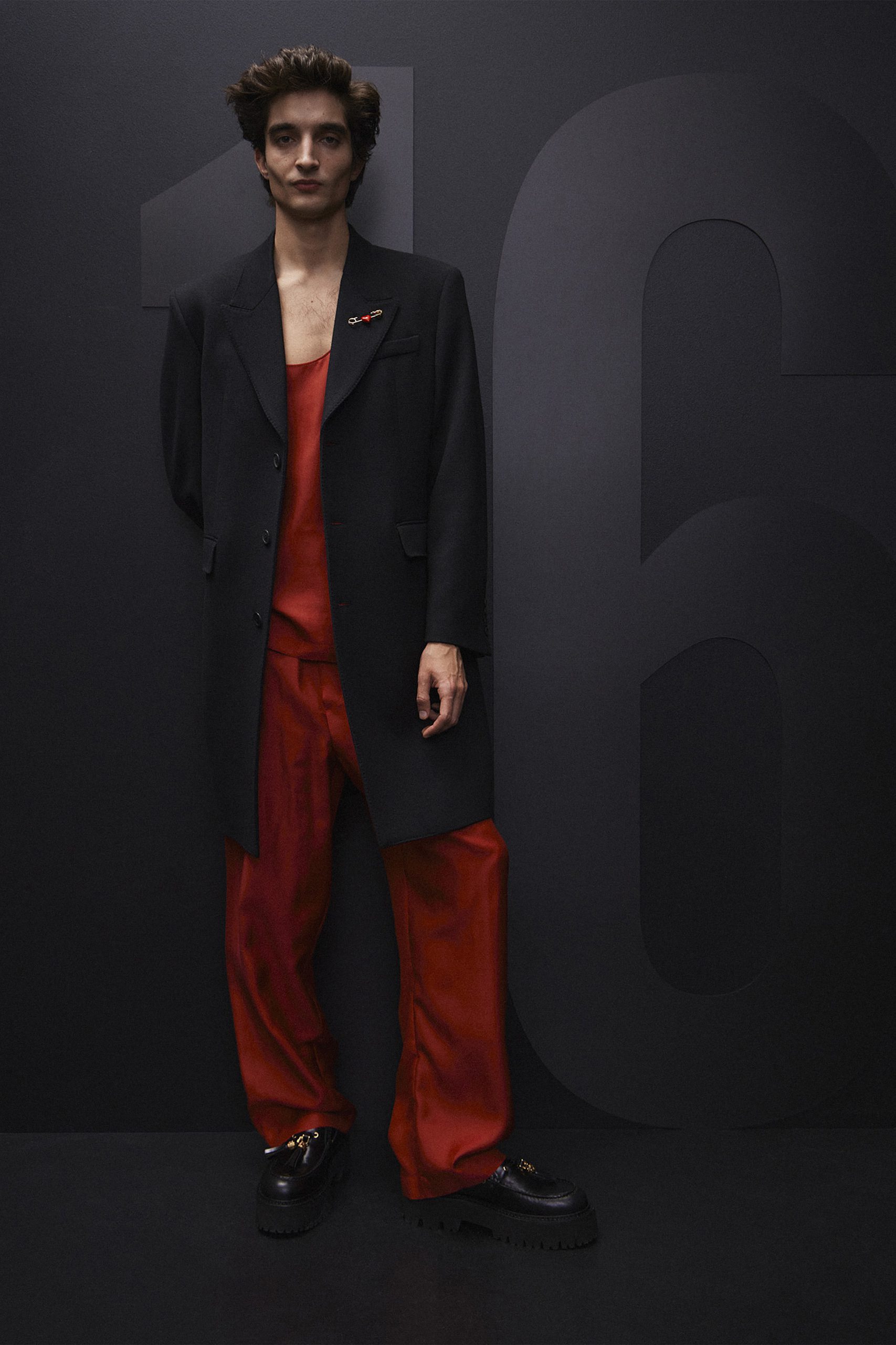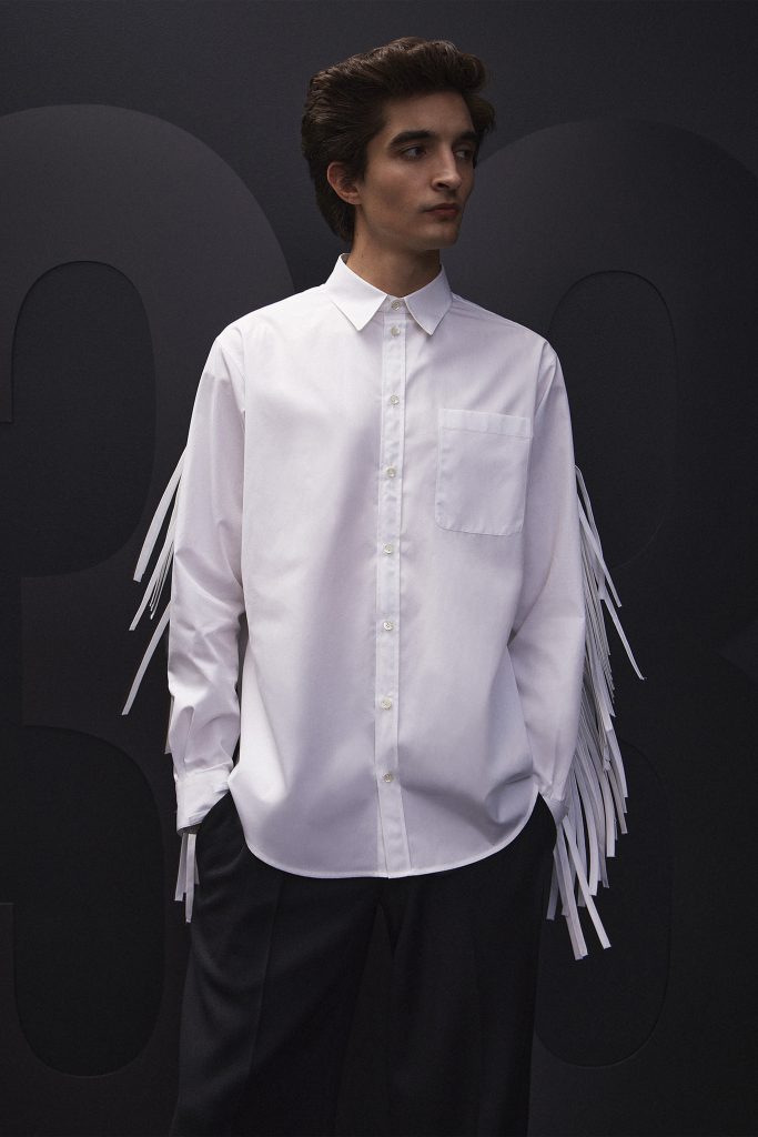 Signature motifs including hearts and polka dots are reinvented on bib shirt-like ruffled shirts and short shorts styled as briefs peeking from under sweatpants, the latter coming with built-in conservative striped cotton undies. Magnified polka dots and hearts deck evening suits creating chiaroscuro effects.