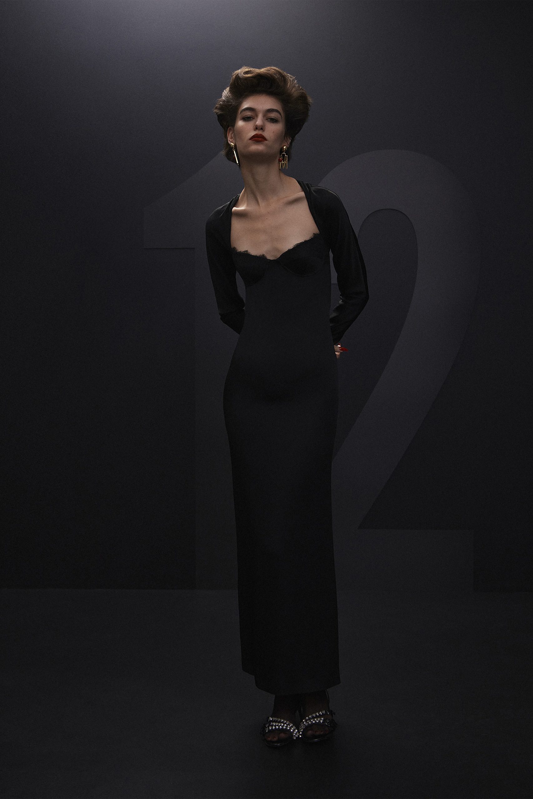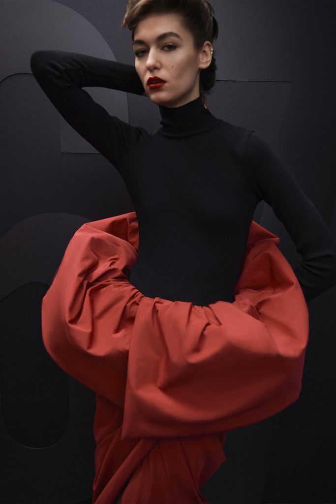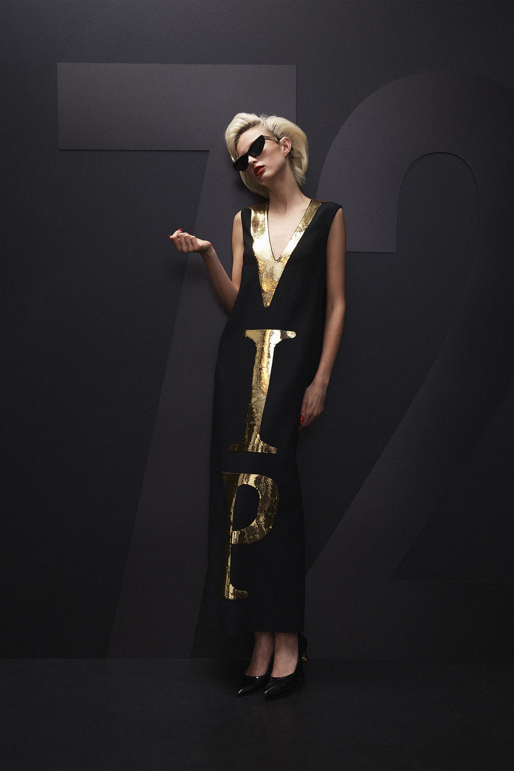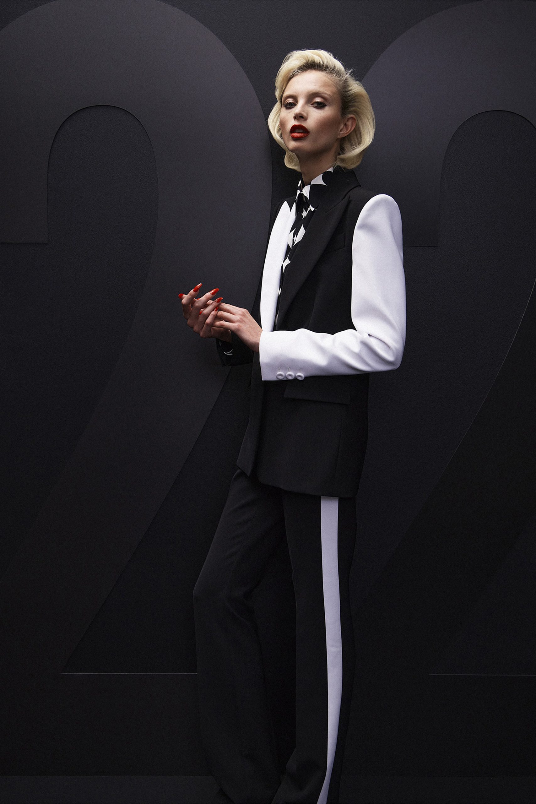 Signature motifs including hearts and polka dots are reinvented on bib shirt-like ruffled shirts and short shorts styled as briefs peeking from under sweatpants, the latter coming with built-in conservative striped cotton undies. Magnified polka dots and hearts deck evening suits creating chiaroscuro effects.