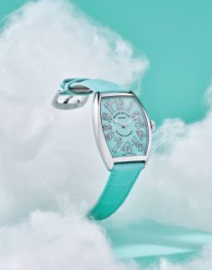 The visual cues extend to the turquoise dial, which offers a matching palette in lacquer while playing with light via its textured guilloché pattern, as a matching turquoise strap wraps things up to complete the overall package.