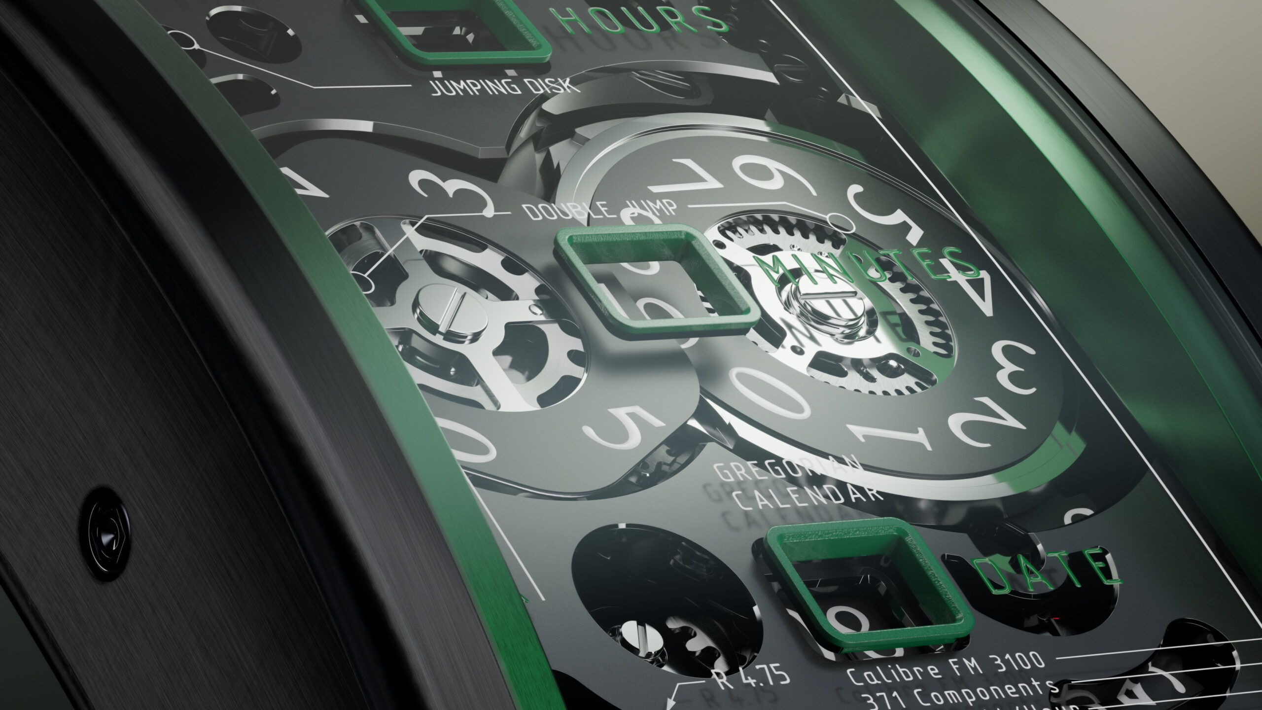 | Movement decoration | Mirror polishing on the regulator assembly Chamfering on the mainplate, bridges and regulator assembly Drawing on the mainplate and bridge flanks Diamond polishing on the sinks Circular satin brushing on the wheels, drums and barrel covers Satin brushing on the mainplate and bridges |