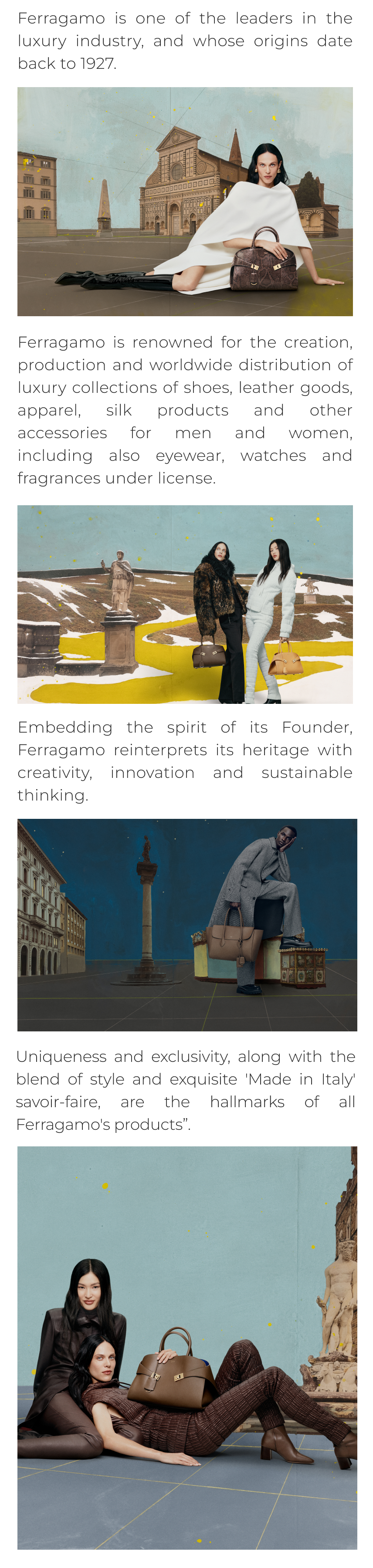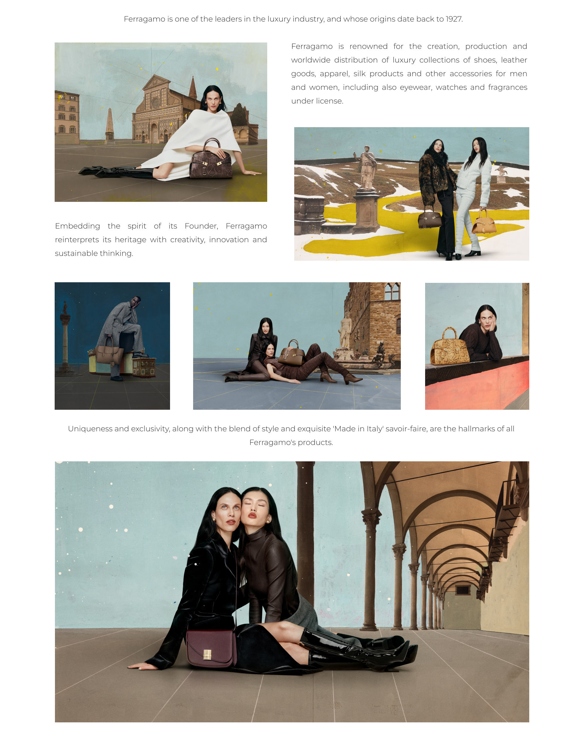 Ferragamo is renowned for the creation, production and worldwide distribution of luxury collections of shoes, leather goods, apparel, silk products and other accessories for men and women, including also eyewear, watches and fragrances under license.