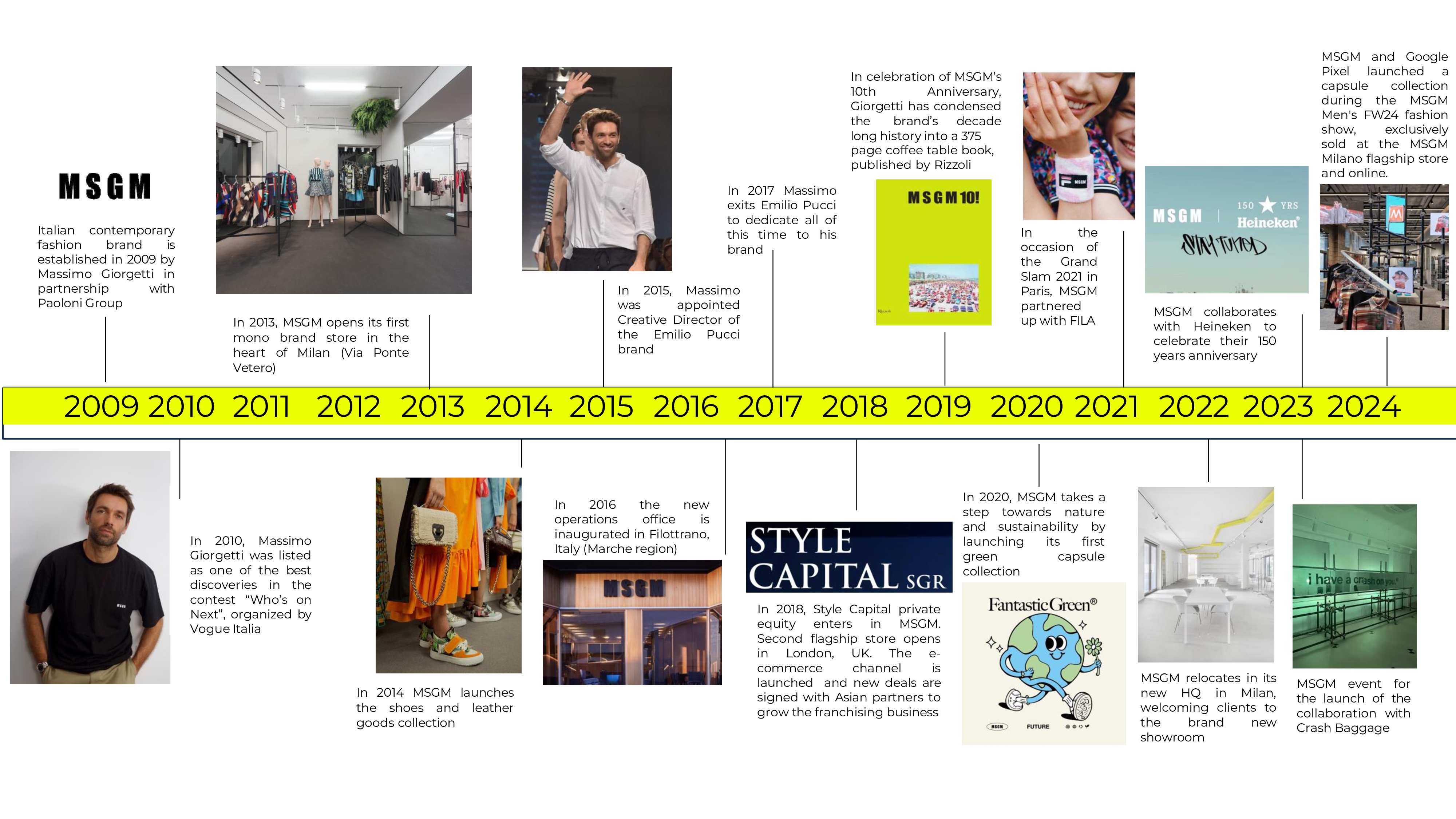 Eager collector and lover of contemporary culture, music and art, Giorgetti constantly fosters new collaborations, teaming up with artists of the likes of Maurizio Cattelan and Pierpaolo Ferrari (Toiletpaper), Nico Vascellari, Massimo Vitali, Norbert Bisky, Todd Bienvenu and Seth Armstrong, or with legendary names such as horror master Dario Argento. Some of the brand's claims, which also feature on its iconic t-shirts, include: "never look back, it's all ahead" and “leggerezza non è superficialità (lightness is not superficiality). Today, MSGM collections are available at over 600 multibrand stores, department stores and e-commerce platforms worldwide, and at flagship stores and shop in shops in the main international fashion hubs, including Milan, London, Tokyo, Shanghai, Seoul.