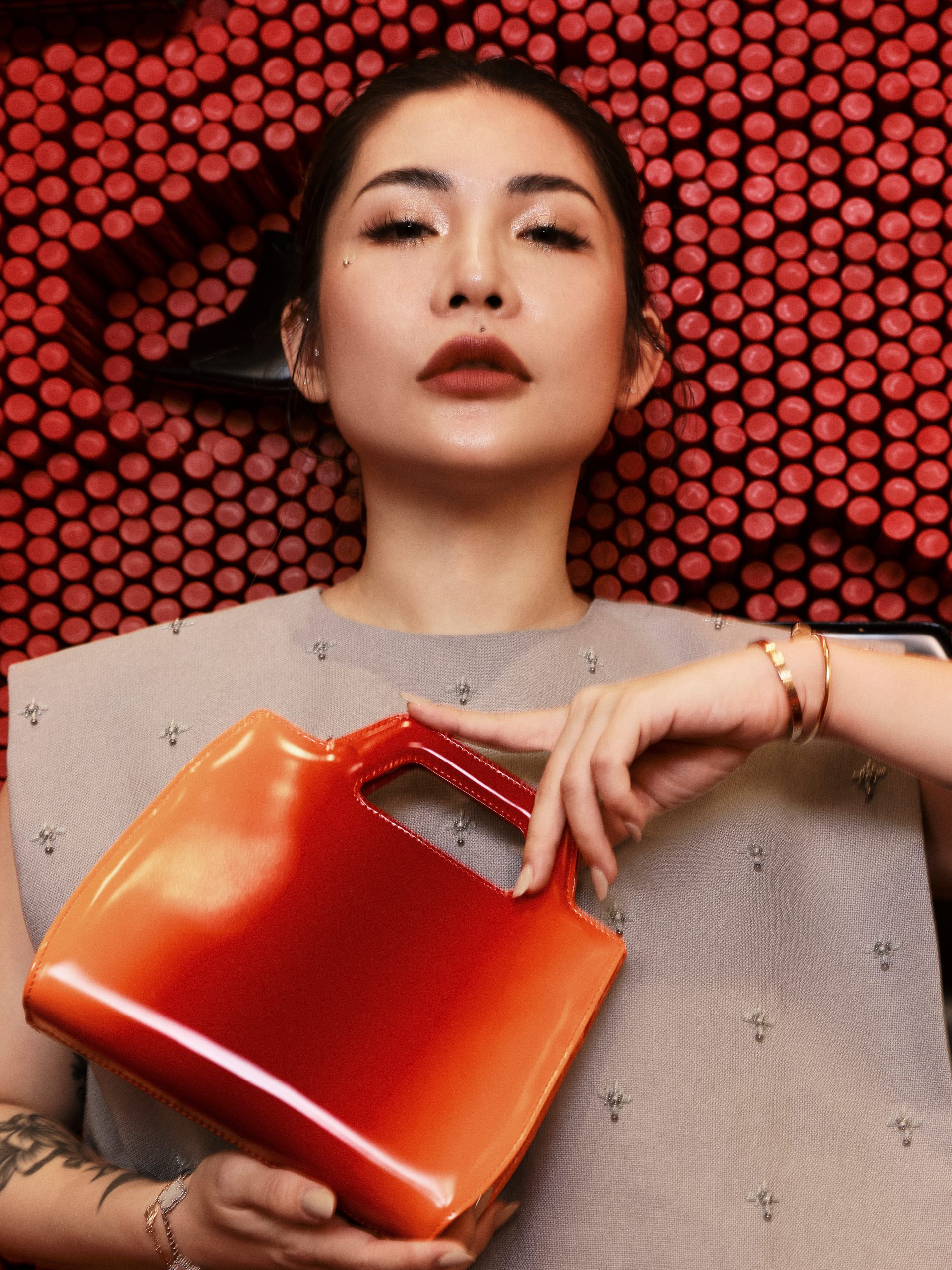 Châu Bùi trong chiếc túi Cut-out mang tinh thần “futuristic” & Kelbin Lei cùng chiếc túi Wanda – thiết kế lưu trữ của Ferragamo.