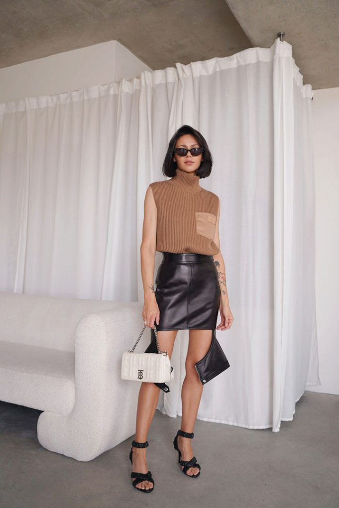 Chân váy da với đường cut out lạ mắt tạo sự phá cách. Chiếc túi Lola Bag tông vanilla có thiết kế khá cơ bản, ghi điểm bởi sự thanh lịch. Logo TB và dây đeo kim loại tạo điểm nhấn ánh kim cho set đồ.