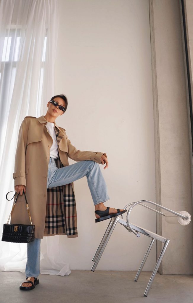 Sau một tuần làm việc dài, hãy chọn một set đồ nhẹ nhàng để đi brunch cùng bạn bè. Nếu bạn vẫn băn khoăn không biết nên mặc gì, thì áo thun trắng và quần jeans ống đứng hoặc dáng baggy là lựa chọn không tồi. Và đừng ngần ngại ưu tiên những phụ kiện tông màu cơ bản, như chiếc túi Lola Bag và đôi sandal đen của Burberry.