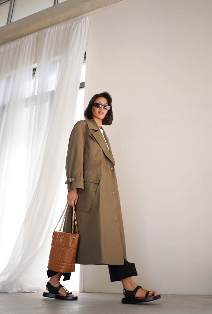 Yếu tố thời trang và tính tiện lợi được cân bằng trong bộ cánh này. Áo thun trắng phối với quần dài đen cơ bản và trench coat tông rêu mang lại cho người mặc sự thoải mái suốt một ngày dài. Chiếc túi bucket Lola Bag không chỉ là điểm nhấn thời trang mà còn phát huy sự tiện lợi nhờ kích thước và thiết kế tối ưu cho việc chứa đồ.