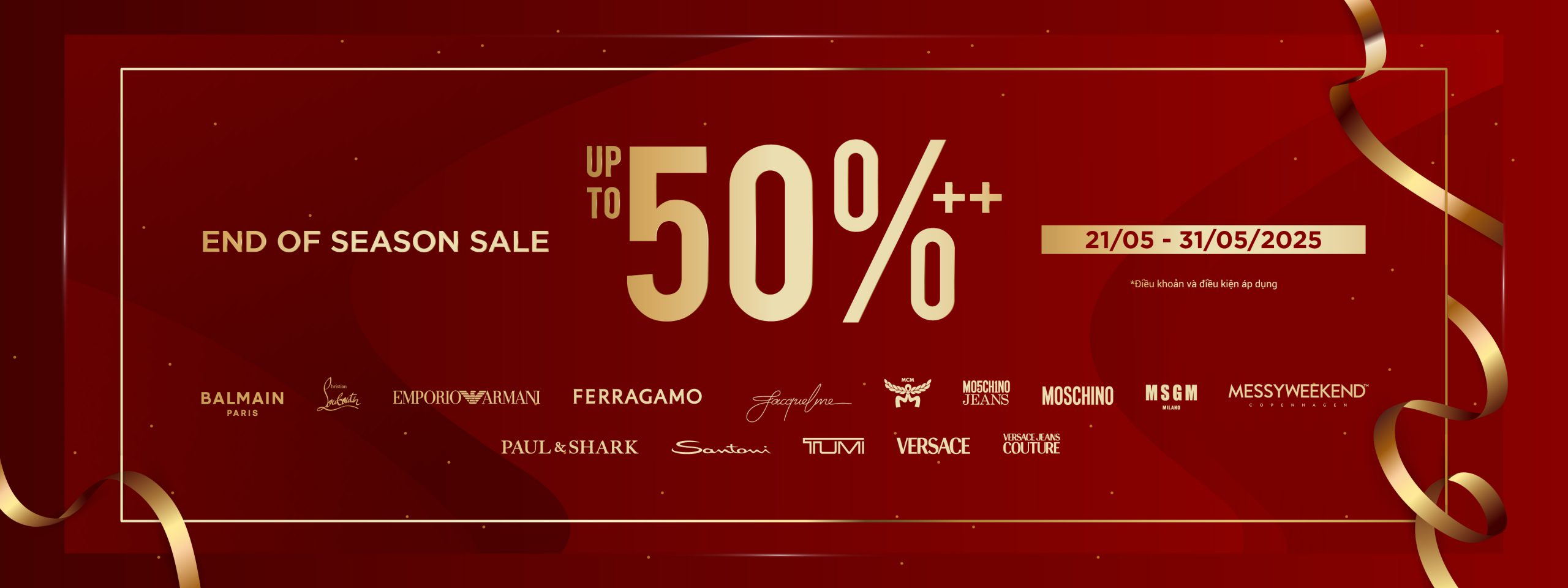 Chương trình “End of Season Sale” chính thức bắt đầu tại hệ thống cửa hàng thời trang DAFC với ưu đãi “siêu khủng” lên đến 50%++. Đặc biệt, khi mua sắm các thương hiệu hàng đầu thế giới như BALMAIN, FERRAGAMO, MCM, MESSYWEEKEND, SANTONI, TUMI, VERSACE…bạn sẽ nhận được hàng loạt ưu đãi hấp dẫn khác.