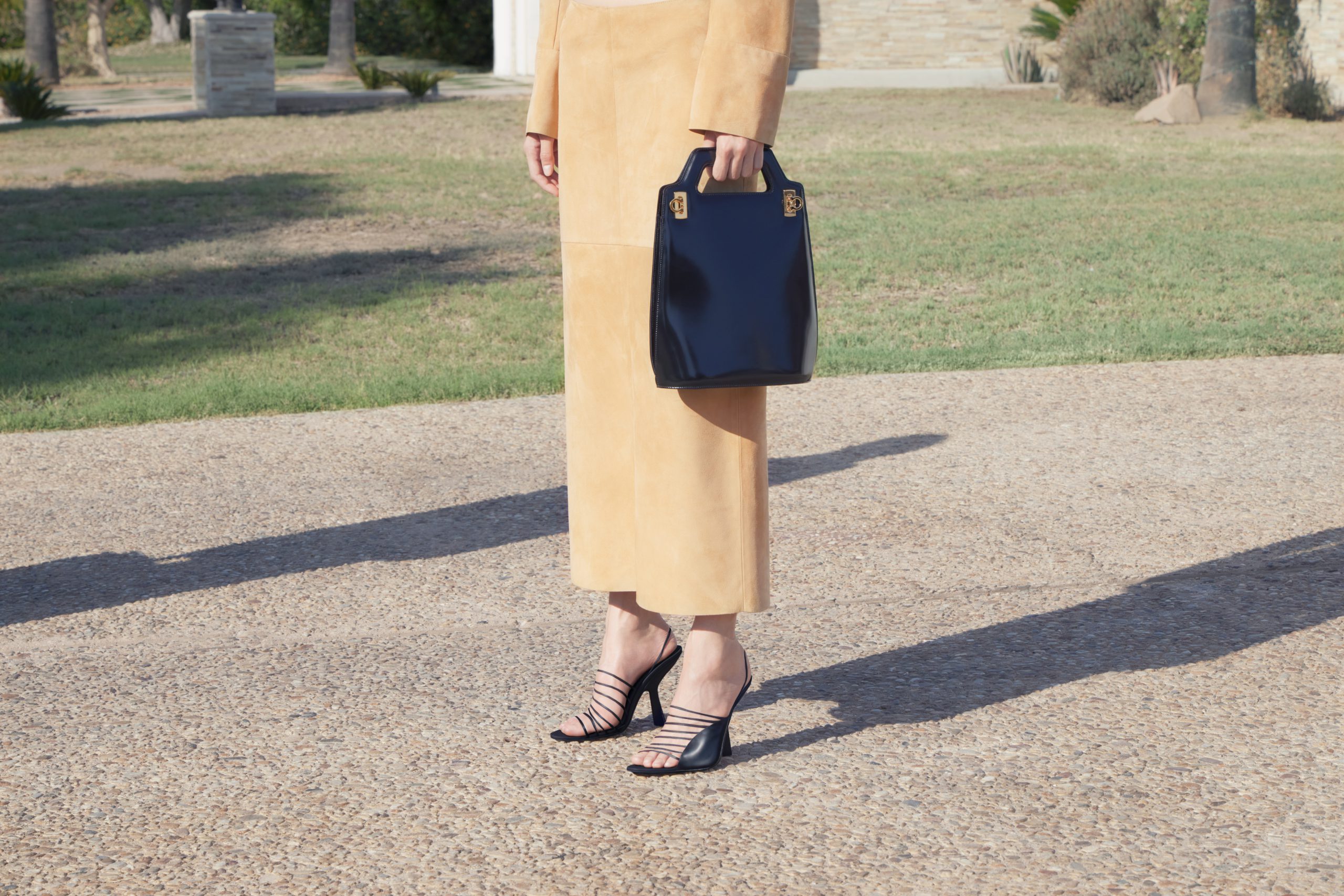 Những chiếc túi xách tay đầu tiên trong kỉ nguyên mới của Ferragamo cũng được xuất hiện trong BST độc quyền này: cách diễn giải của Davis về chiếc túi xách lưu trữ Wanda, được hồi sinh nhờ lớp hoàn thiện có độ bóng cao và tỷ lệ mới, được xem là linh vật của kỷ nguyên mới. Chiếc túi xách với những đường cắt điêu khắc cũng vậy, giờ đây được làm bằng da bóng với lớp vải bên trong tương phản, và hình dáng cấu trúc của chiếc túi phản ánh dáng dấp gợn sóng nhấp nhô của bãi biển cũng như độ chính xác tuyến tính đánh dấu tầm nhìn của Davis. “Nó liên quan đến Ferragamo, đến Hollywood, đến đại dương – nhưng cũng liên quan đến tôi và DNA của chính tôi,” Davis giải thích. “Tôi muốn thể hiện viễn cảnh đó, nhưng giờ là qua lăng kính của Ferragamo.”