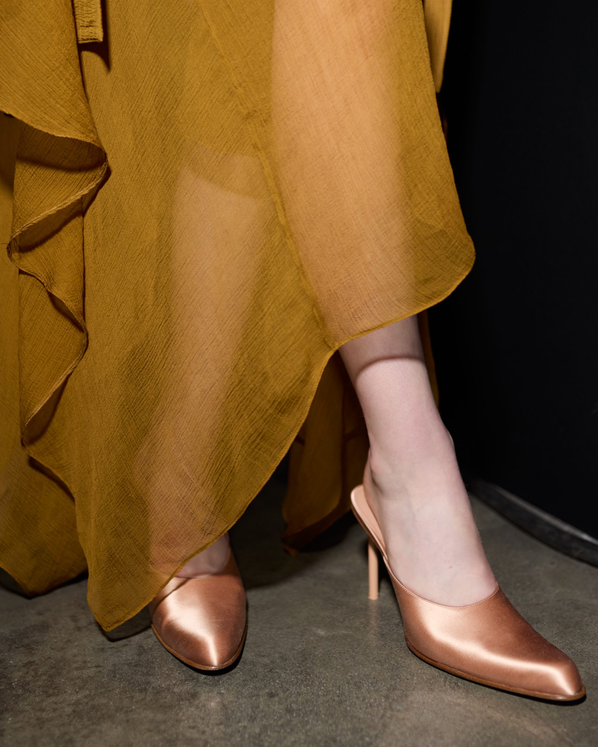 Biểu tượng thời đại xuất hiện thầm lặng trên những đôi giày pump satin đáng yêu, giày cao gót T-bar đầy thanh lịch, hay thiết kế sandal quai ngang từ BST cũ. “Tôi luôn tối giản hóa mọi thứ” – Davis giải thích. “Tôi thích trích dẫn một phần của lịch sử rồi tiết chế lại để thiết kế tối giản và hiện đại hơn.” Trên tinh thần phi giới tính, những chi tiết của giày brogue truyền thống cùng quai cài tinh tế của giày monk-strap nay được chuyển đổi thành giày mule gót nhọn. Hình thức trang trọng của giày nam được biến hóa tinh tế thành dáng giày derby gót vuông nhẹ nhàng đầy ấn tượng. Mặt khác, giày bốt mũi vuông với tỷ lệ phồng nhẹ một cách tinh tế đem lại phong cách hiện đại kết hợp cùng hình dáng cổ điển.