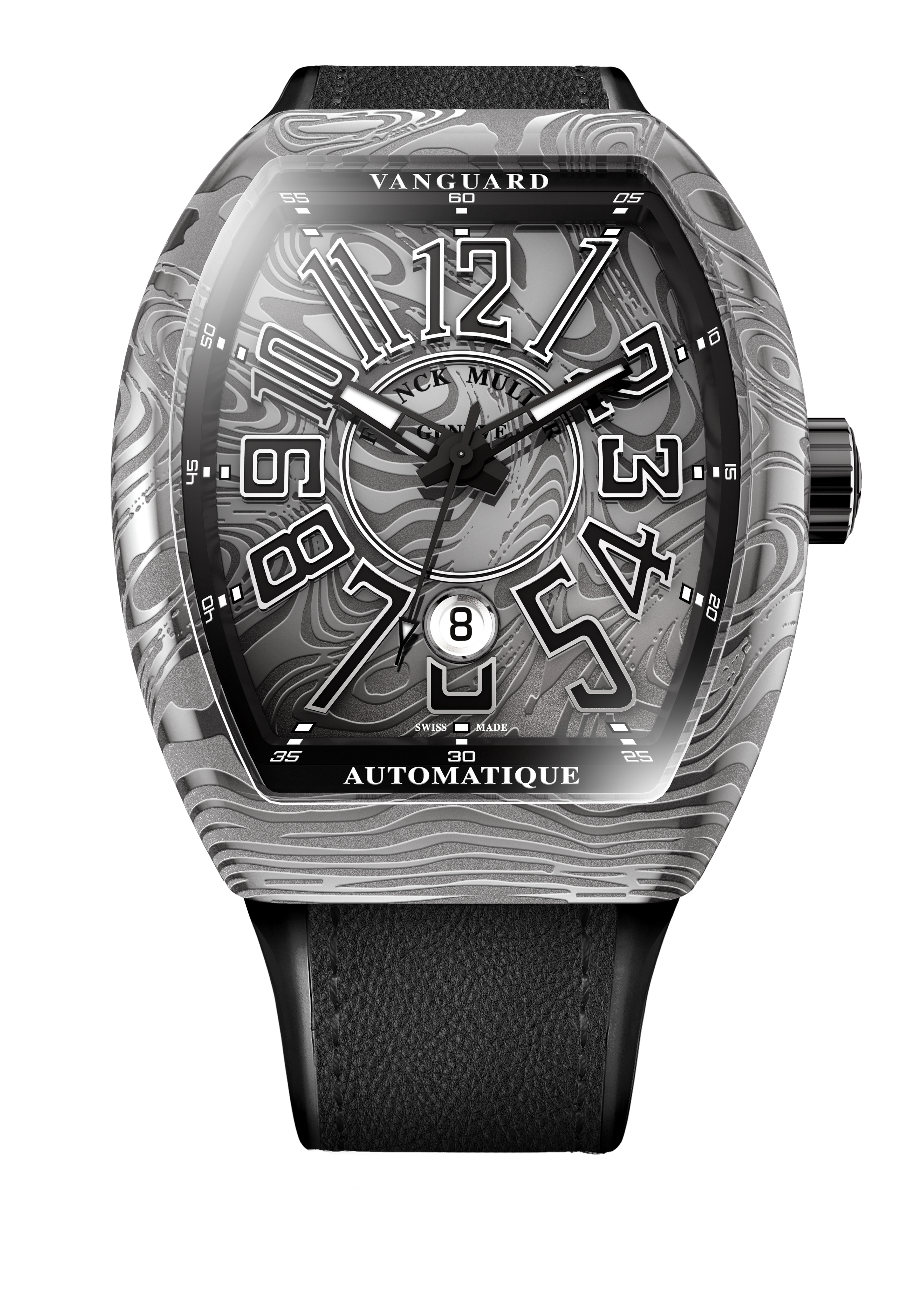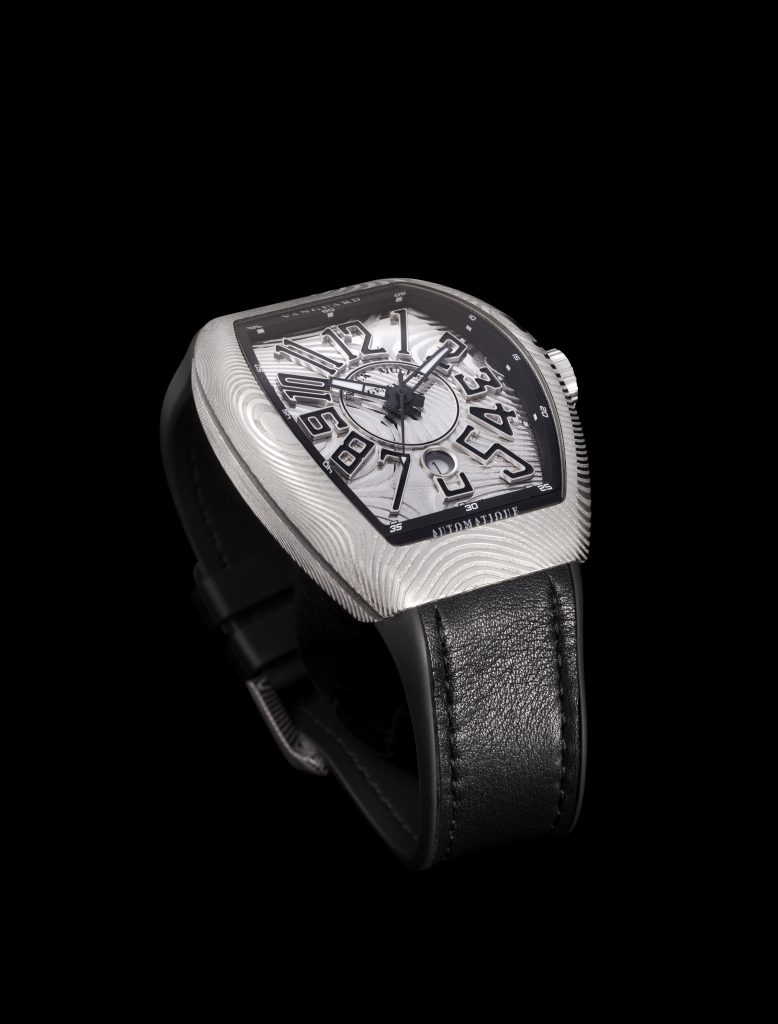 Thép Damascus là một vật liệu có thể được rèn để tạo hình theo ý muốn. Vỏ và mặt số của chiếc Vanguard Damas được cắt ra từ các khối thép Damascus nguyên khối. Được tạo ra chỉ qua một quy trình đặc biệt mà nhà Franck Muller từ lâu đã thành thạo, họa tiết sọc của thép chỉ hiện ra khi ngâm trong bể axit trong mười phút (cho phần vỏ) hoặc năm phút (cho mặt số), tạo ra một chiếc đồng hồ độc đáo, không thể trùng lặp về mặt thiết kế.