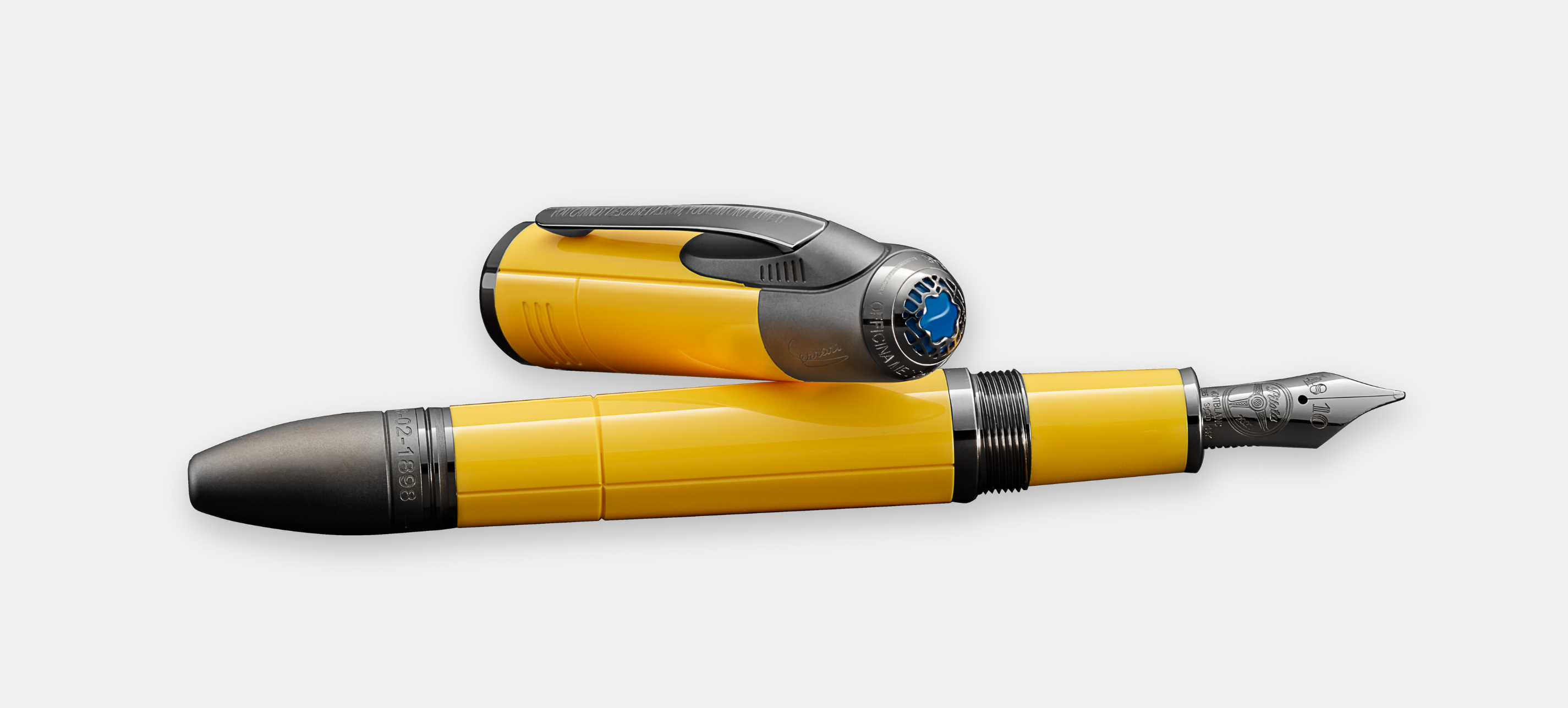 Thể hiện sự tôn vinh đến cha mình, vòng trên của đỉnh nắp bút được khắc dòng chữ “OFFICINA MECCANICA ALFREDO FERRARI” như thay lời bày tỏ lòng kính trọng đối với xưởng cơ khí và nơi sinh của ông. Phần chóp kim loại mạ ruthenium được khắc 2 cột mốc quan trọng: ngày sinh của Enzo Ferrari (18-02-1898) và chiến thắng đầu tiên trên đường đua tại Circuito del Savio (17-06-1923). Chế tác từ Au 585 nguyên khối phủ kim loại ruthenium, ngòi bút được tô điểm với hình khắc nổi mang chi tiết vô lăng của mẫu xe Ferrari 250 GTO kèm theo chữ ”Pilota” – một trong những biệt danh nổi tiếng của Enzo Ferrari. Biểu tượng Montblanc trên đỉnh bút có màu xanh đậm gợi nhớ đến sắc màu đặc trưng thứ hai của thành phố Modena, và được nhúng trong một lưới kim loại để tái hiện hoàn hảo lưới tản nhiệt của xe cổ điển.