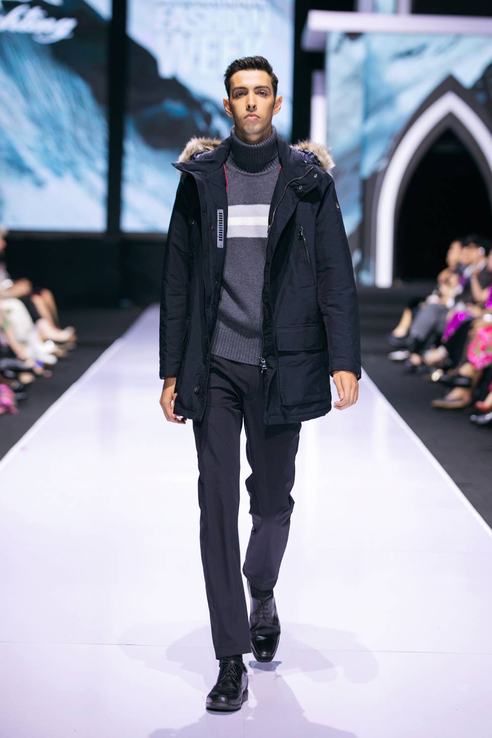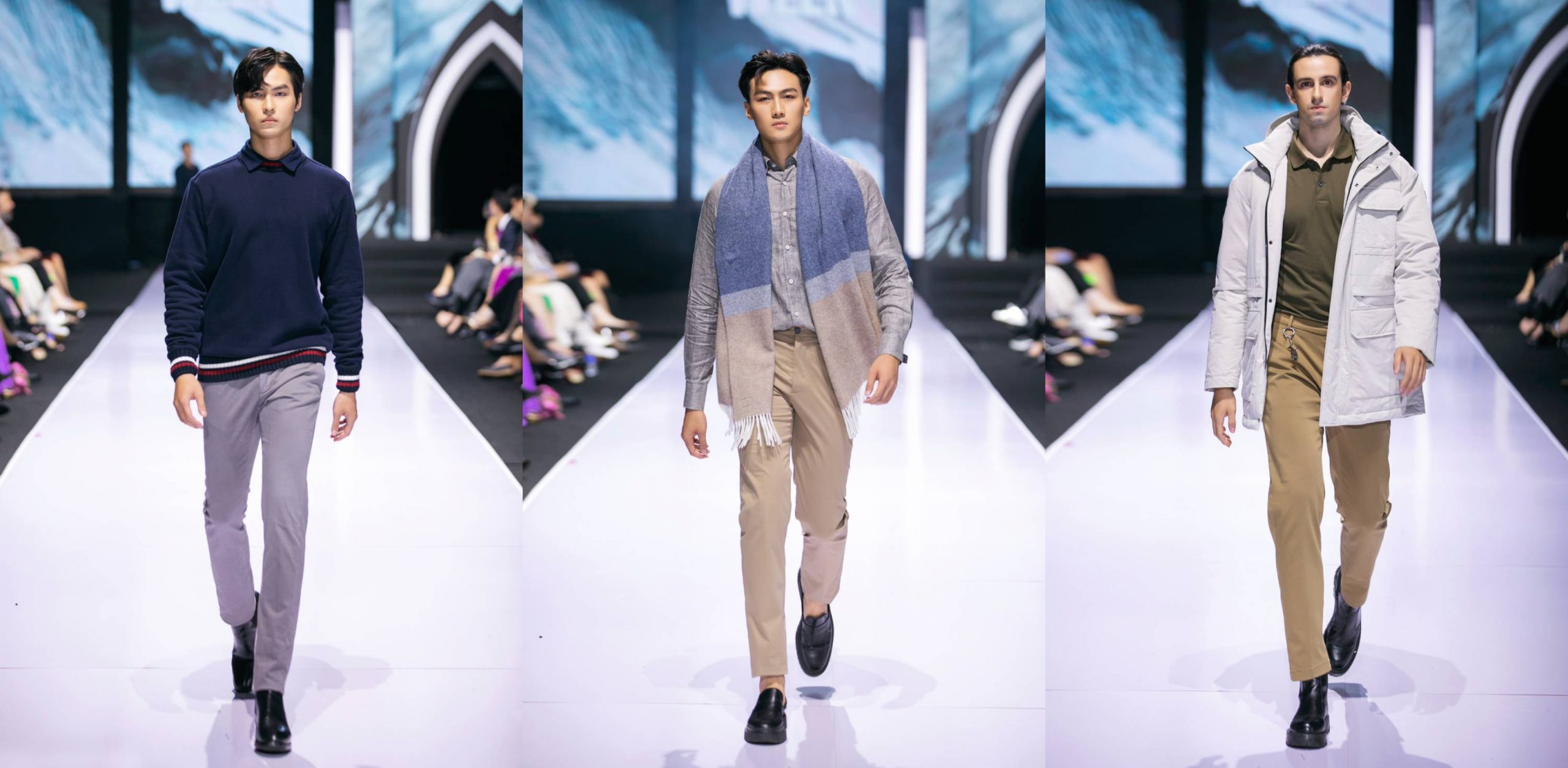 Đối lập với những đường băng đa sắc màu đến từ các NTK Việt Nam, những thiết kế thương hiệu Paul & Shark tạo điểm nhấn cho đêm diễn AVIFW Thu Đông 2022 đầu tiên bằng việc tập trung khai thác triệt để tông màu trầm như xanh, đen, xám… Kết hợp với các phụ kiện khăn choàng, túi xách, bộ sưu tập đã gián tiếp mang đến giới điệu mộ không khí vừa se lạnh, vừa ấm áp của mùa thu đông.