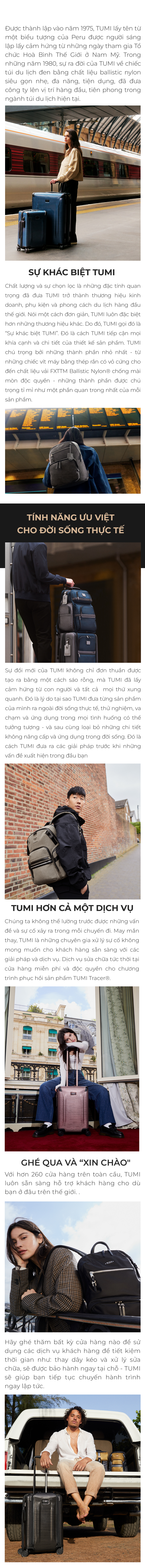Chất lượng và sự chọn lọc là những đặc tính quan trọng đã đưa TUMI trở thành thương hiệu kinh doanh, phụ kiện và phong cách du lịch hàng đầu thế giới. Nói một cách đơn giản, TUMI luôn đặc biệt hơn những thương hiệu khác. Do đó, TUMI gọi đó là “Sự khác biệt TUMI”. Đó là cách TUMI tiếp cận mọi khía cạnh và chi tiết của thiết kế sản phẩm. TUMI chú trọng bởi những thành phần nhỏ nhất - từ những chiếc vít máy bằng thép rắn có vỏ cứng cho đến chất liệu vải FXTTM Ballistic Nylon® chống mài mòn độc quyền - những thành phần được chú trọng tỉ mỉ như một phần quan trong nhất của mỗi sản phẩm.