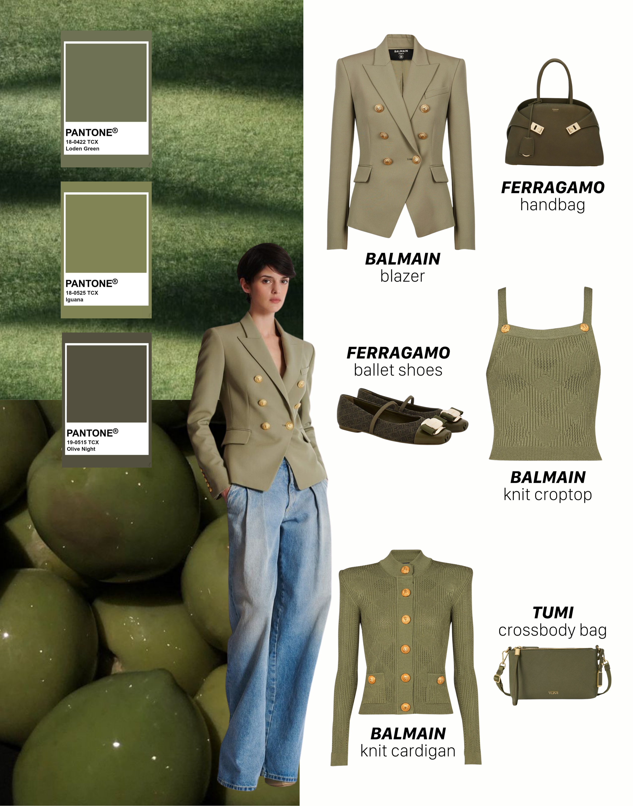 Mang đậm chất của thiên nhiên, Olive Green tạo nên nét thanh lịch và mạnh mẽ cho mọi bộ trang phục mùa Thu. Bộ sưu tập Thu Đông đến từ Balmain cùng với phụ kiện giày ballet và túi xách từ Ferragamo mang đến sự hài hòa hoàn hảo. Sự kết hợp của những món đồ với tông màu trung tính nhưng nổi bật sẽ giúp bạn dễ dàng diện trong nhiều hoàn cảnh khác nhau, từ công sở đến những buổi gặp gỡ cuối tuần.