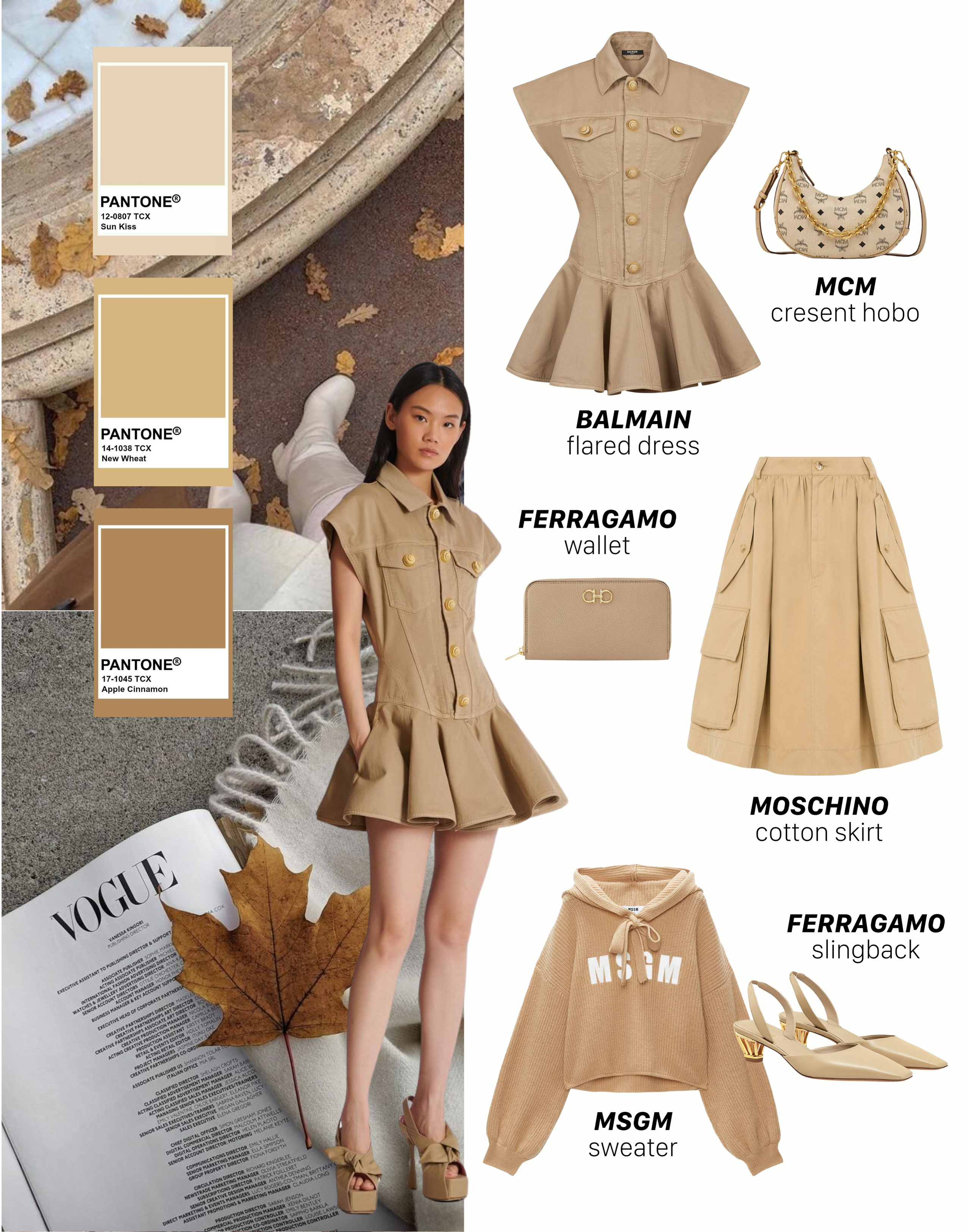 Sang trọng và thanh lịch, màu Beige là sự lựa chọn lý tưởng cho những cô nàng yêu thích sự tinh tế. Chiếc đầm Balmain giúp tôn lên nét nữ tính mà vẫn hiện đại, trong khi túi xách MCM và ví Ferragamo là điểm nhấn hoàn hảo cho bộ trang phục. Váy từ Moschino mang lại vẻ ngoài nhẹ nhàng và áo hoodie MSGM tạo nên một phong cách năng động nhưng không kém phần thanh lịch. Cuối cùng là đôi giày ballet từ Ferragamo, bạn sẽ nổi bật giữa đám đông.