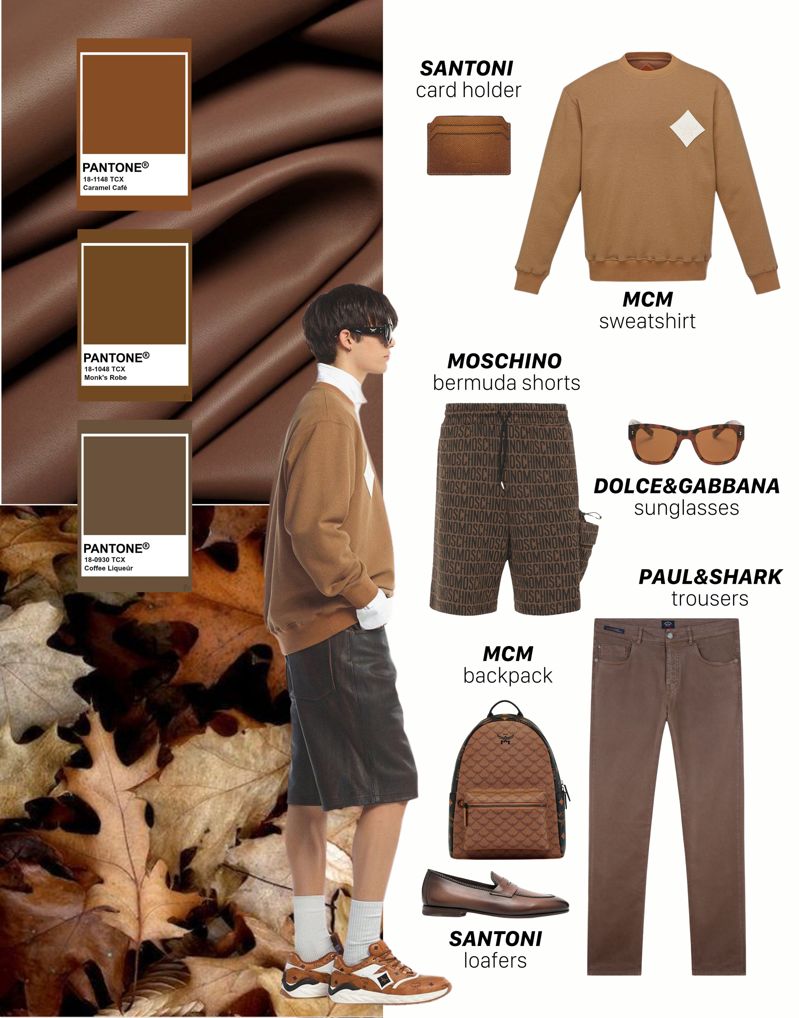 Sắc nâu không bao giờ lỗi mốt, mang đến vẻ ngoài sang trọng và cổ điển. Ví da Santoni kết hợp cùng áo sweater MCM tạo nên một phong cách tối giản nhưng ấn tượng. Quần short Moschino cùng kính mát Dolce&Gabbana hoàn thiện vẻ ngoài thoải mái mà vẫn phong cách. Balo MCM là phụ kiện không thể thiếu cho những chuyến đi, trong khi giày da Santoni và quần dài Paul&Shark mang đến sự tinh tế, lịch lãm cho những buổi gặp gỡ quan trọng.