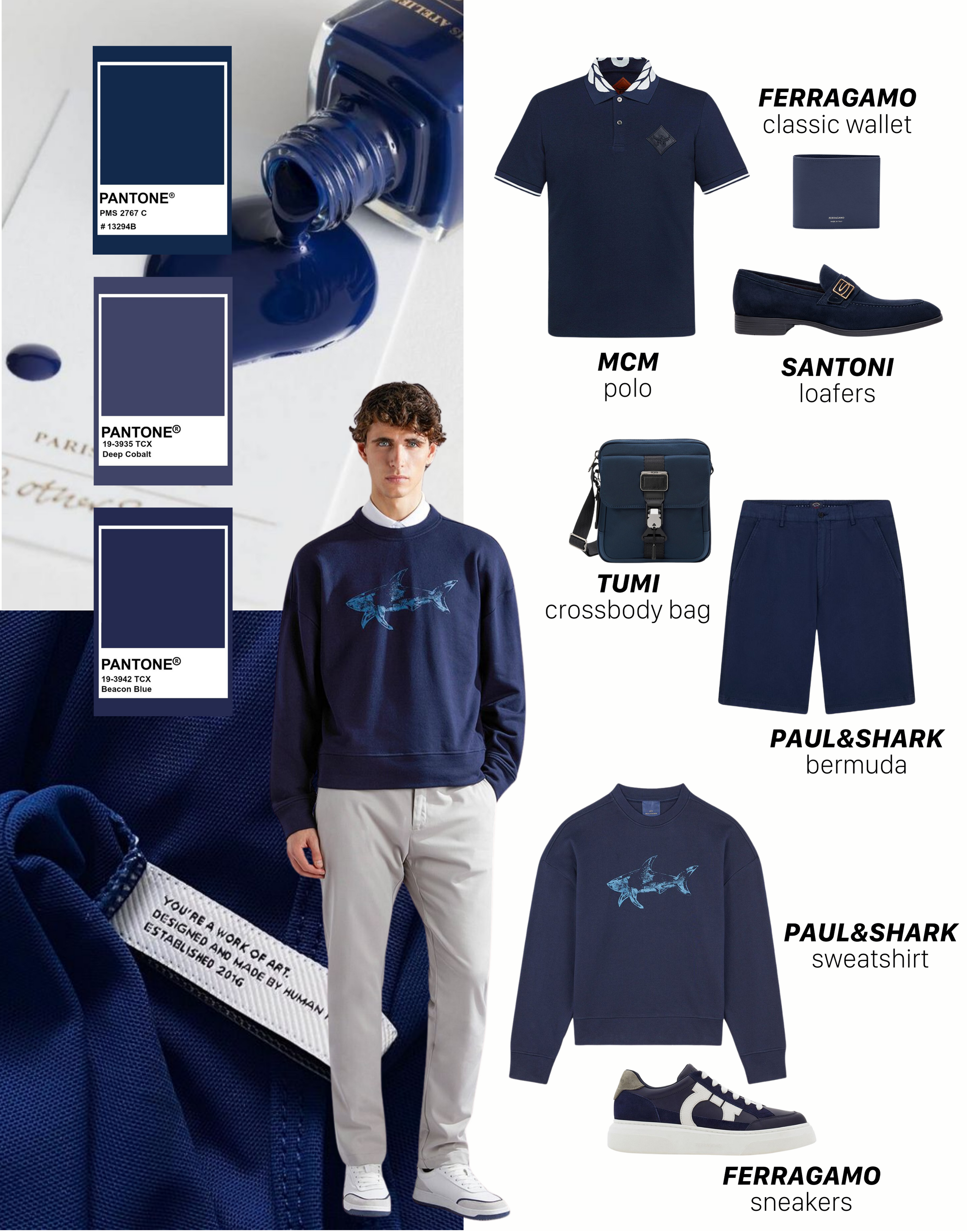 Xanh biển đậm là tông màu lý tưởng cho các quý ông yêu thích sự tinh tế nhưng không kém phần nổi bật. Paul&Shark đem đến thiết kế áo sweatshirt thoải mái kết hợp cùng quần bermuda tạo phong cách năng động nhưng vẫn giữ được sự sang trọng. Cùng với đó, MCM đem lại sự tinh tế với áo polo xanh navy, cùng phụ kiện túi crossbody từ TUMI và đôi loafers sang trọng từ Santoni. Không thể thiếu chiếc ví da từ Ferragamo, từng chi tiết trong trang phục được chăm chút kỹ lưỡng để mang đến phong cách tối ưu.