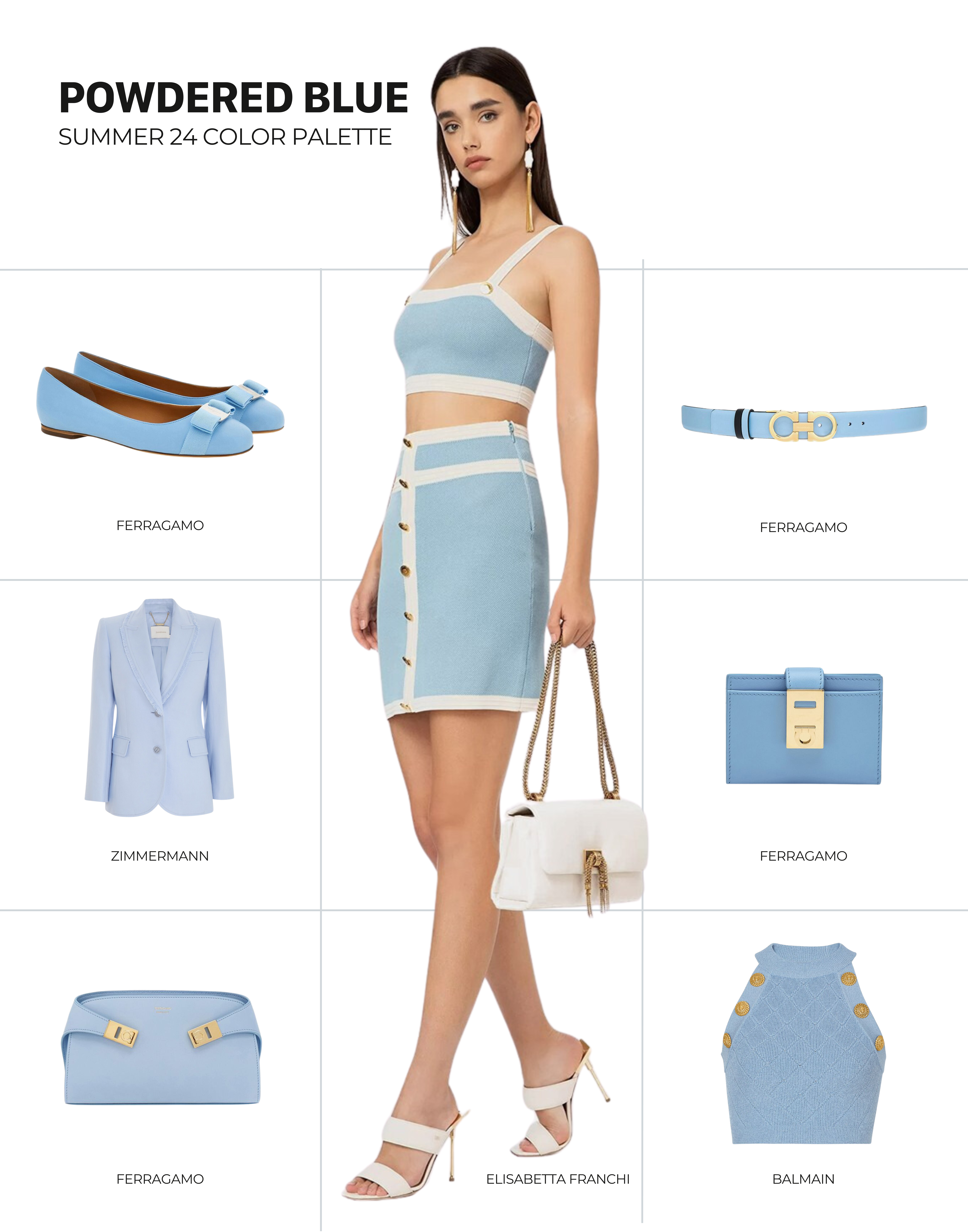 Powered Blue là sự kết hợp hoàn hảo giữa sự tĩnh lặng và tinh tế. Màu xanh dịu nhẹ này gợi lên cảm giác yên bình và thanh lịch, khiến nó trở thành lựa chọn linh hoạt cho nhiều dịp khác nhau. Dù là set đồ mùa hè thời thượng của Elisabetta Franchi, áo blazer Zimmermann cắt may tỉ mỉ hay chiếc crop-top Balmain đơn giản cho đến những phụ kiện tinh tế của Ferragamo, Powdered Blue là màu sắc thay đổi phong cách mùa hè của bạn.