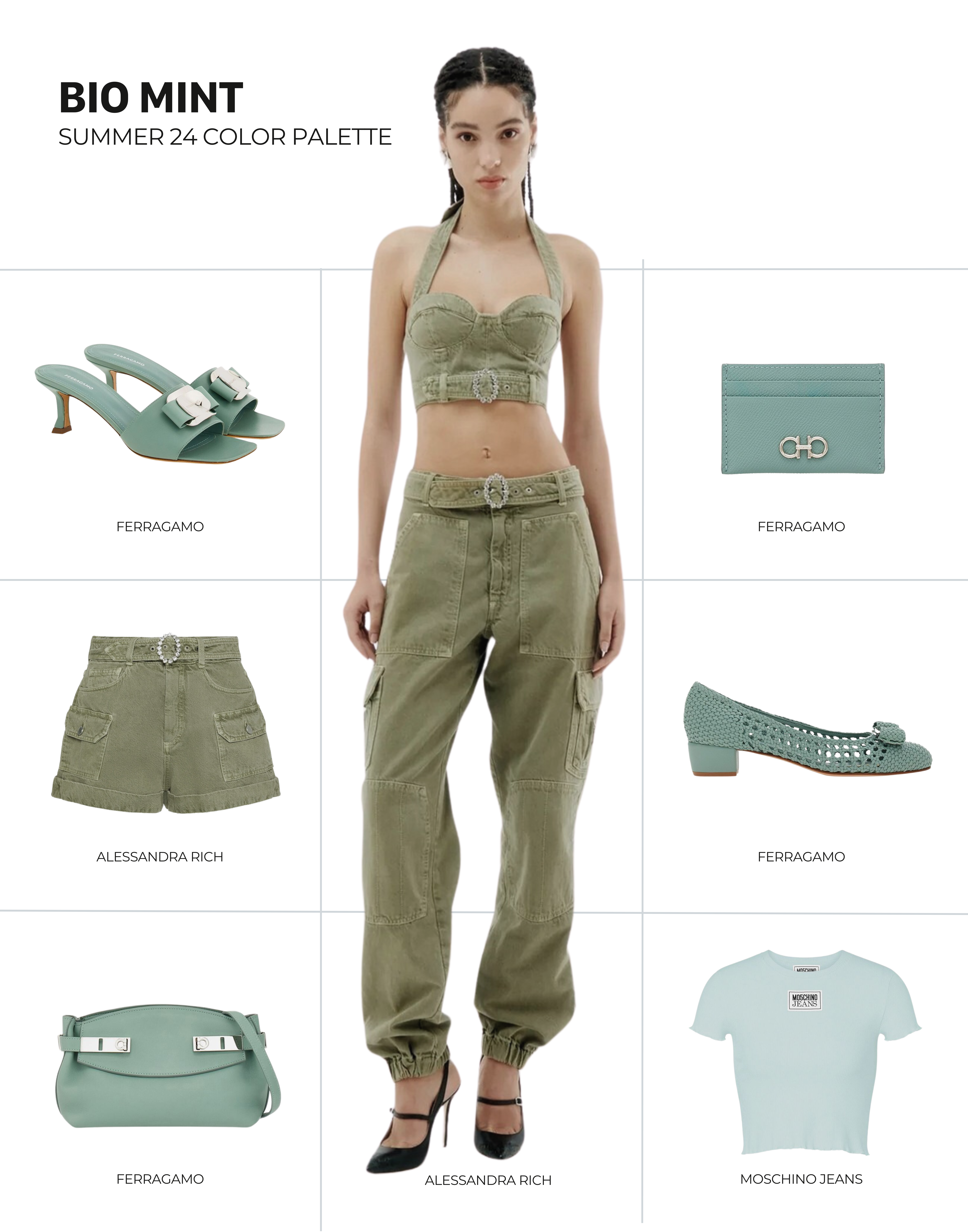 Bio Mint là màu xanh tươi mới và sống động, thể hiện tinh thần mùa hè. Sắc xanh tươi sáng mà dịu dàng này hoàn hảo để thêm vào trang phục một chút tươi mới lấy cảm hứng từ thiên nhiên. Màu sắc này phù hợp cho mọi thứ từ chiếc crop-top Moschino Jeans đơn giản, set đồ Alessandra Rich cá tính đến những phụ kiện mới nhất từ Ferragamo, mang đến sự trẻ trung cho tủ đồ mùa hè của bạn.