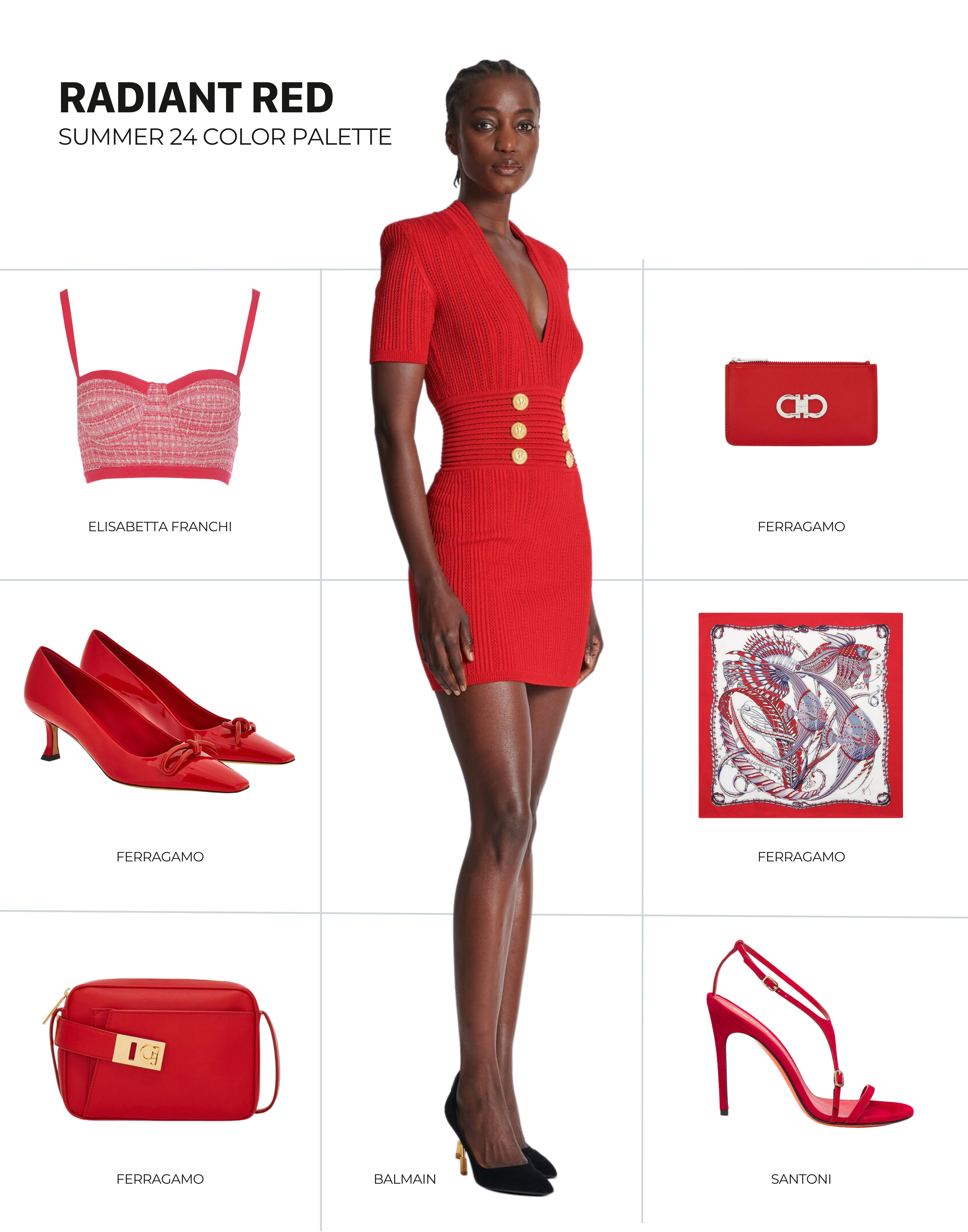Radiant Red là tất cả về những tuyên bố táo bạo, đầy năng lượng. Sắc đỏ nổi bật này dành cho những ai muốn nổi bật và để lại ấn tượng lâu dài. Từ những chiếc váy đỏ Balmain nổi bật và chiếc crop-top Elisabetta Franchi trẻ trung đến phụ kiện Ferragamo bắt mắt , Radiant REd thêm một chút năng lượng và đam mê cho trang phục mùa hè của bạn.