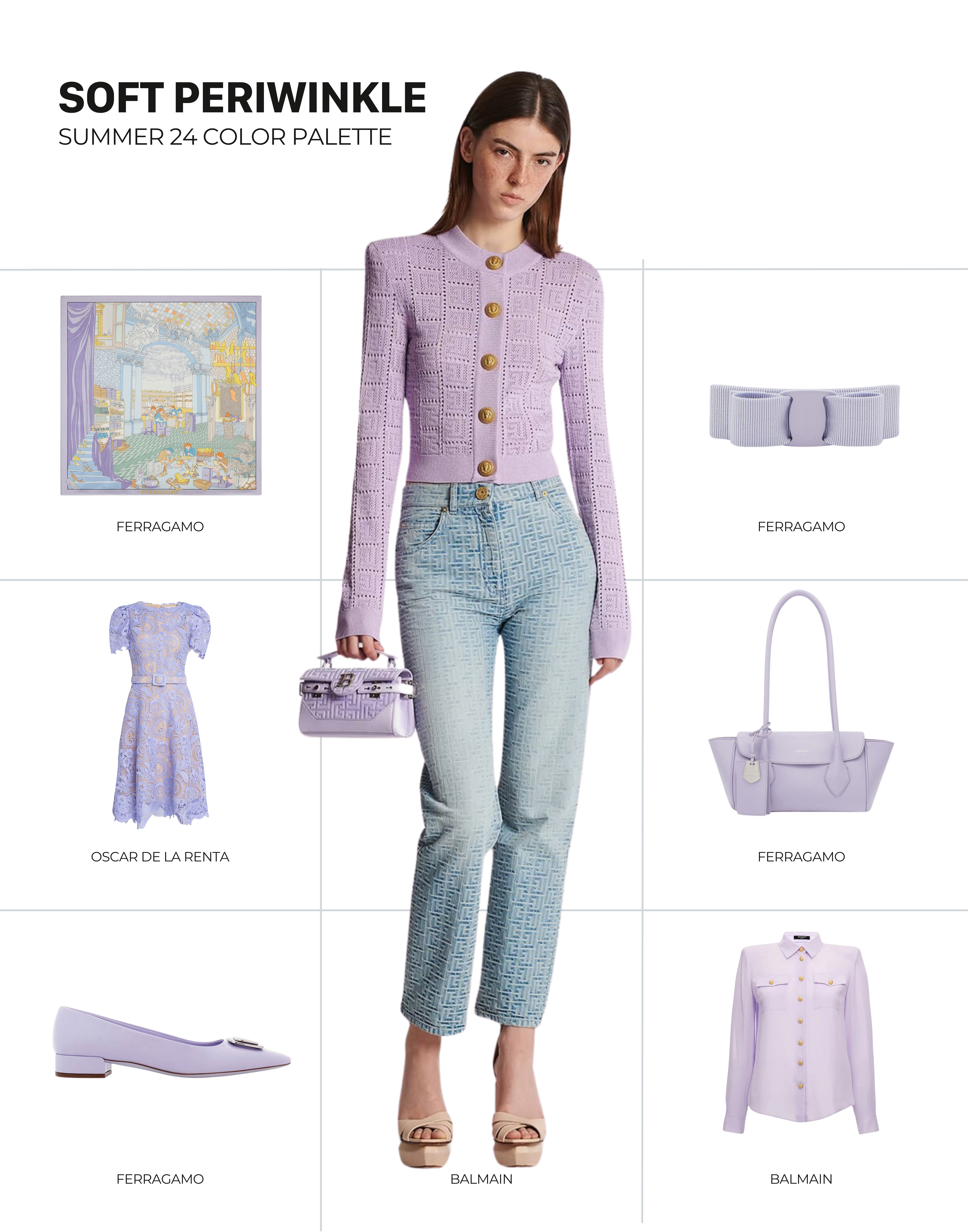 Soft Periwinkle là một tông tím lilac dịu dàng, là đỉnh cao của phong cách “nàng thơ” mùa hè. Màu sắc nhẹ nhàng, thanh thoát này khiến những bộ trang phục trở nên vô cùng lãng mạn. Dù là chiếc áo sơ mi Balmain duyên dáng, cardigan nữ tính hay chiếc đầm Oscar De La Renta đáng yêu, Soft Periwinkle mang sự mộng mơ, yêu kiều vào tủ đồ mùa hè của bạn.