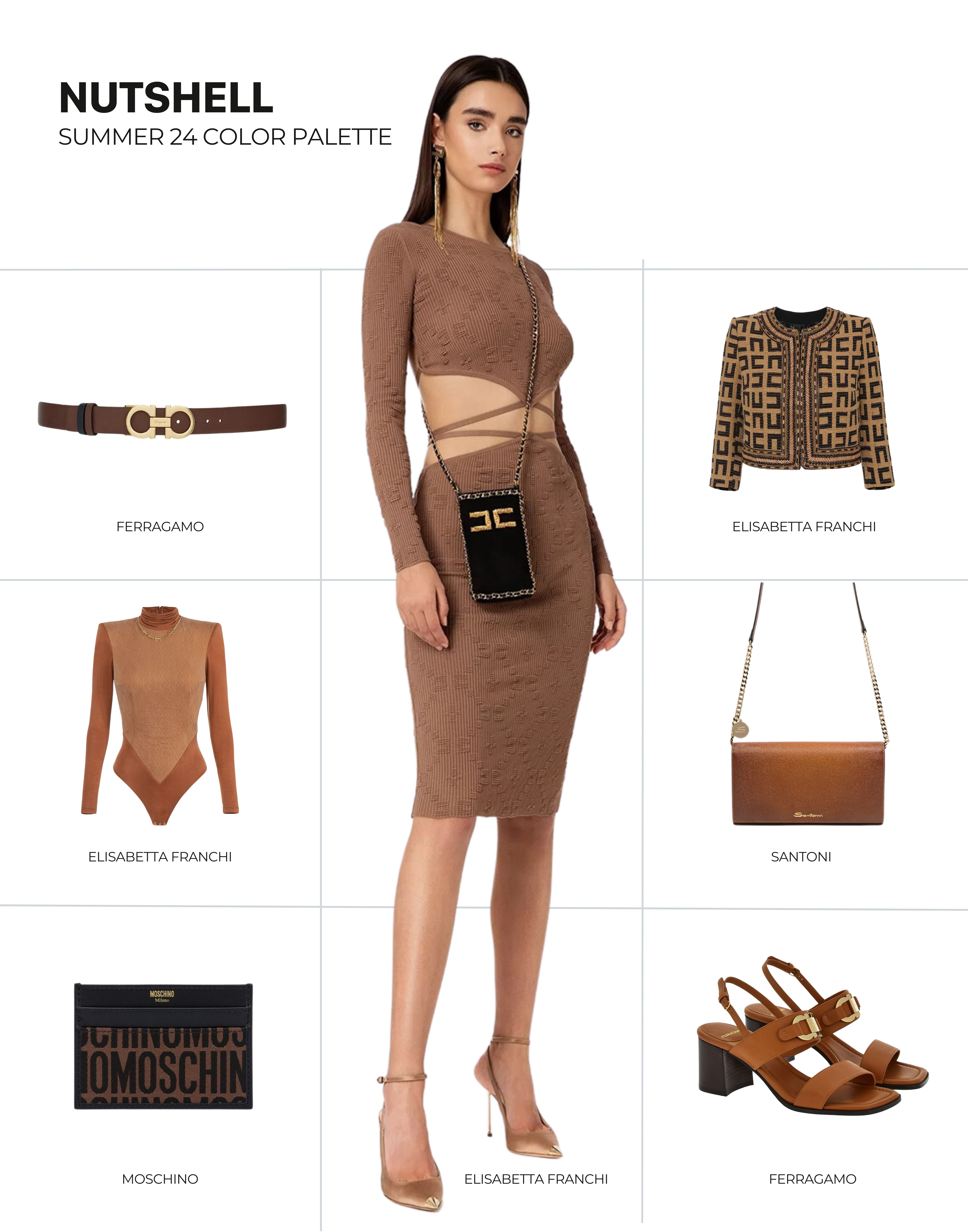 Nutshell mang đến cảm giác ấm áp và bền vững cho thời trang mùa hè. Màu nâu trầm ấm, phong phú này vô cùng linh hoạt và có thể kết hợp tốt với nhiều gam màu khác. Đây là lựa chọn hoàn hảo để tạo nên những bộ trang phục thanh lịch, tinh tế, vừa thoải mái vừa đẳng cấp. Hãy nghĩ đến set đồ độc đáo, chiếc bodysuit quyến rũ hoặc áo khoác dạ sang trọng đến từ Elisabetta Franchi, kết hợp cùng phụ kiện thời thượng của Ferragamo, Santoni hay Moschino trong tông màu cổ điển này.